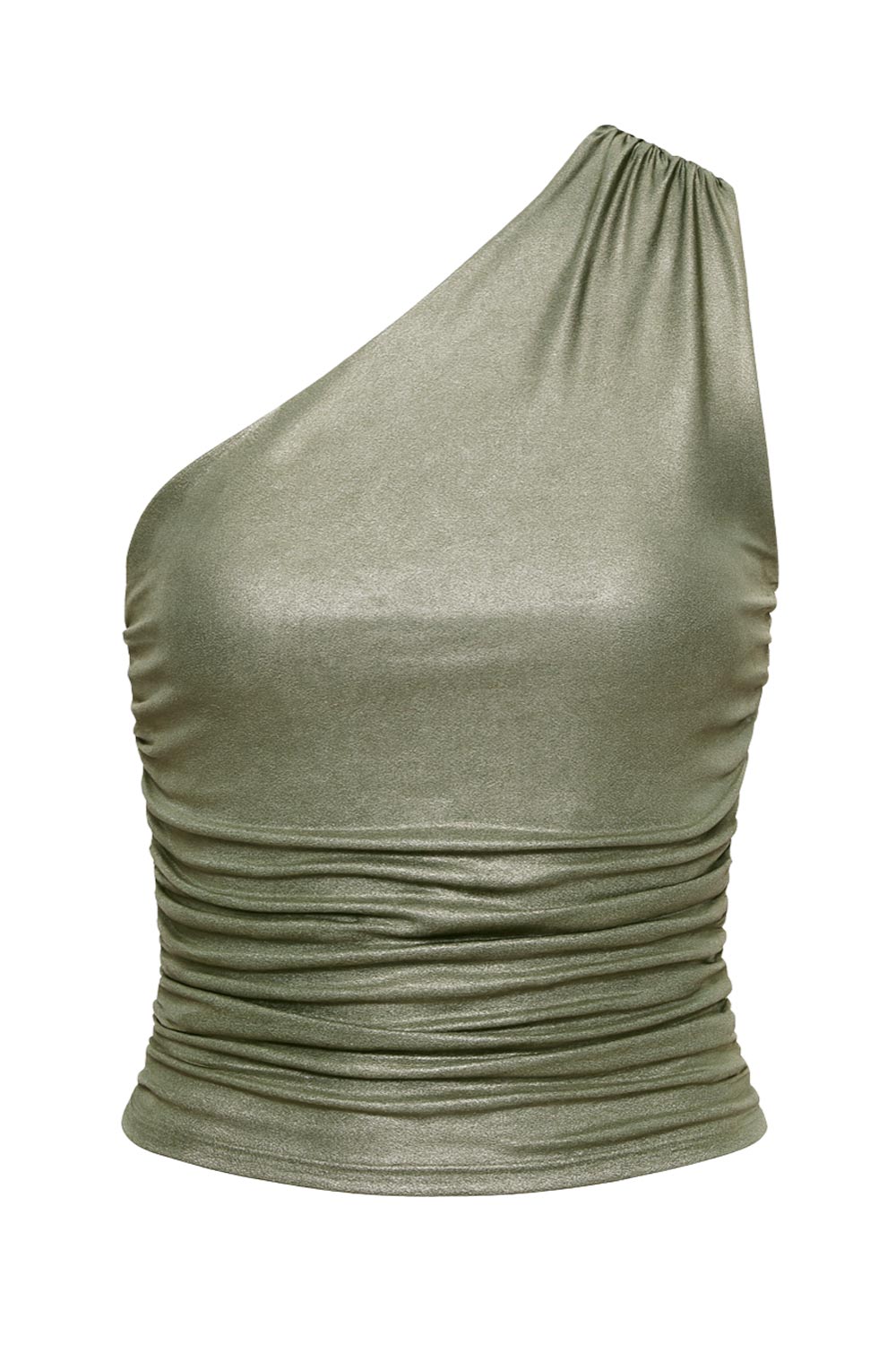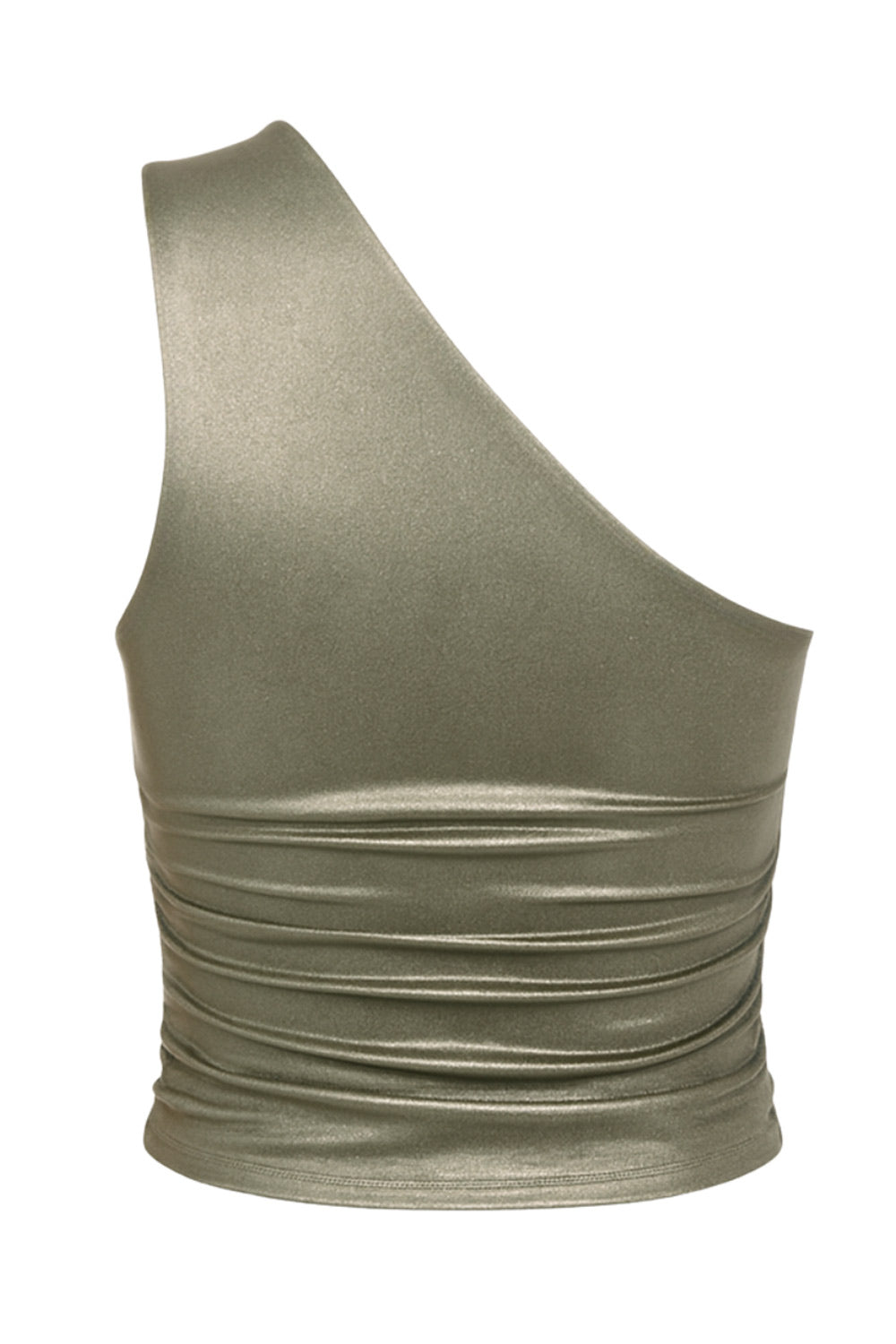 Top metálico asimétrico de un hombro, fit ajustado, escote diagonal, detalles plisados laterales y en hombro.