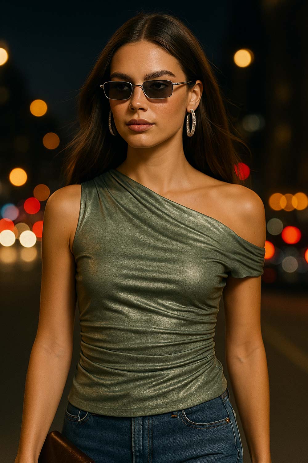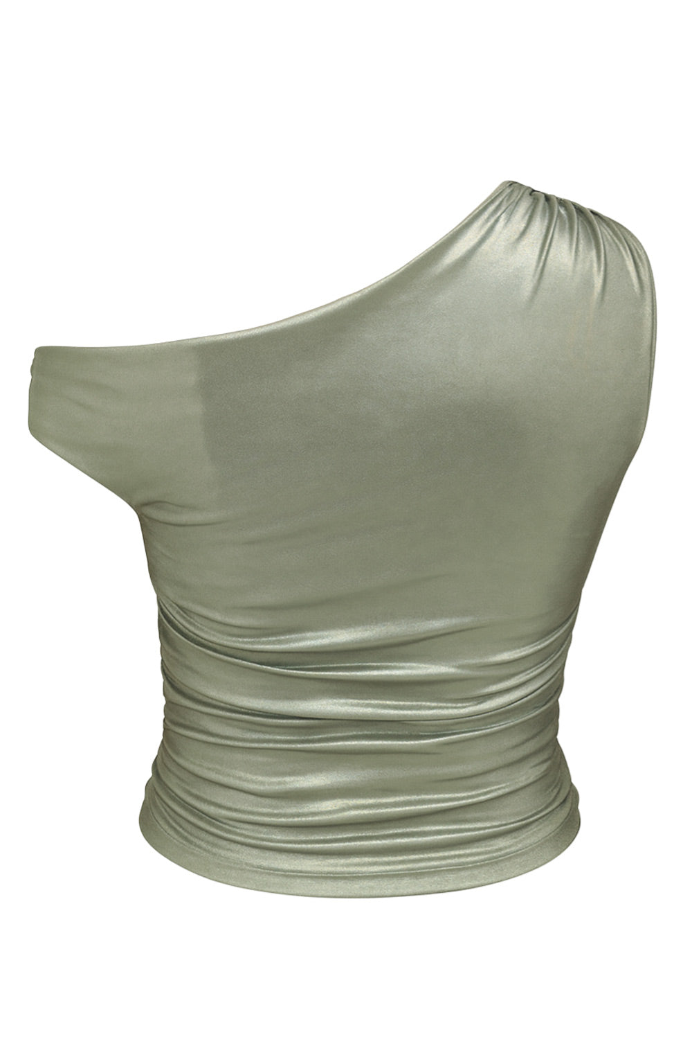 Top metálico asimétrico de fit ajustado, escote diagonal, una manga corta seguida con hombro descubierto, plisados en hombro y detalle de plisados en costados.