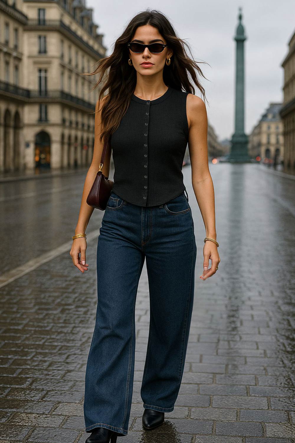Top de punto, sin mangas, cuello redondo, bajo curveado frontal e hilera frontal de botones. Detalle de rib en bordes.