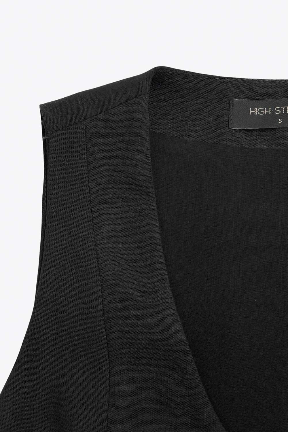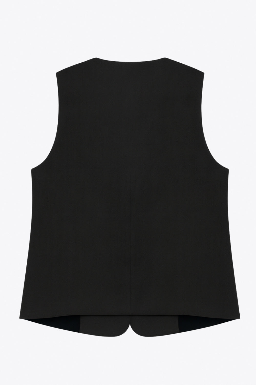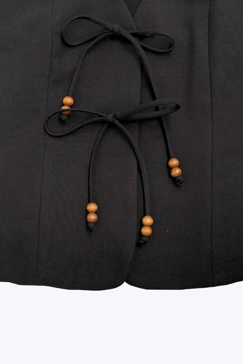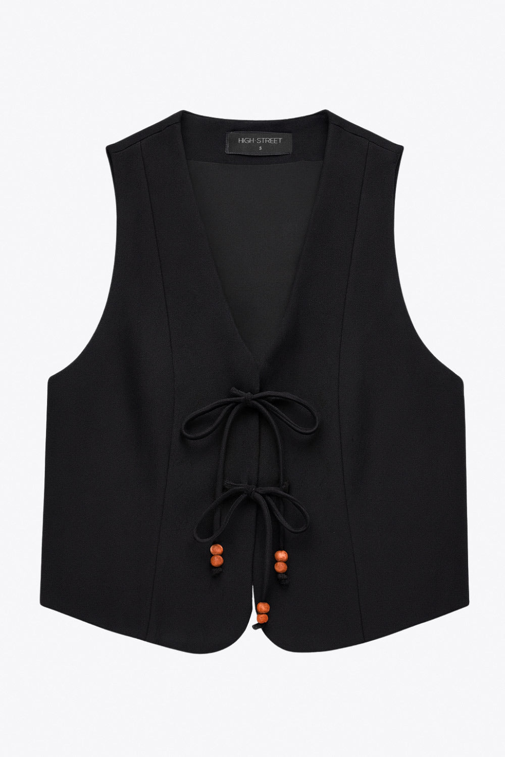 Chaleco de fit recto, pinzas frontales, escote v redondeado y cierre frontal de lazos amarrables con detalle en contraste.
