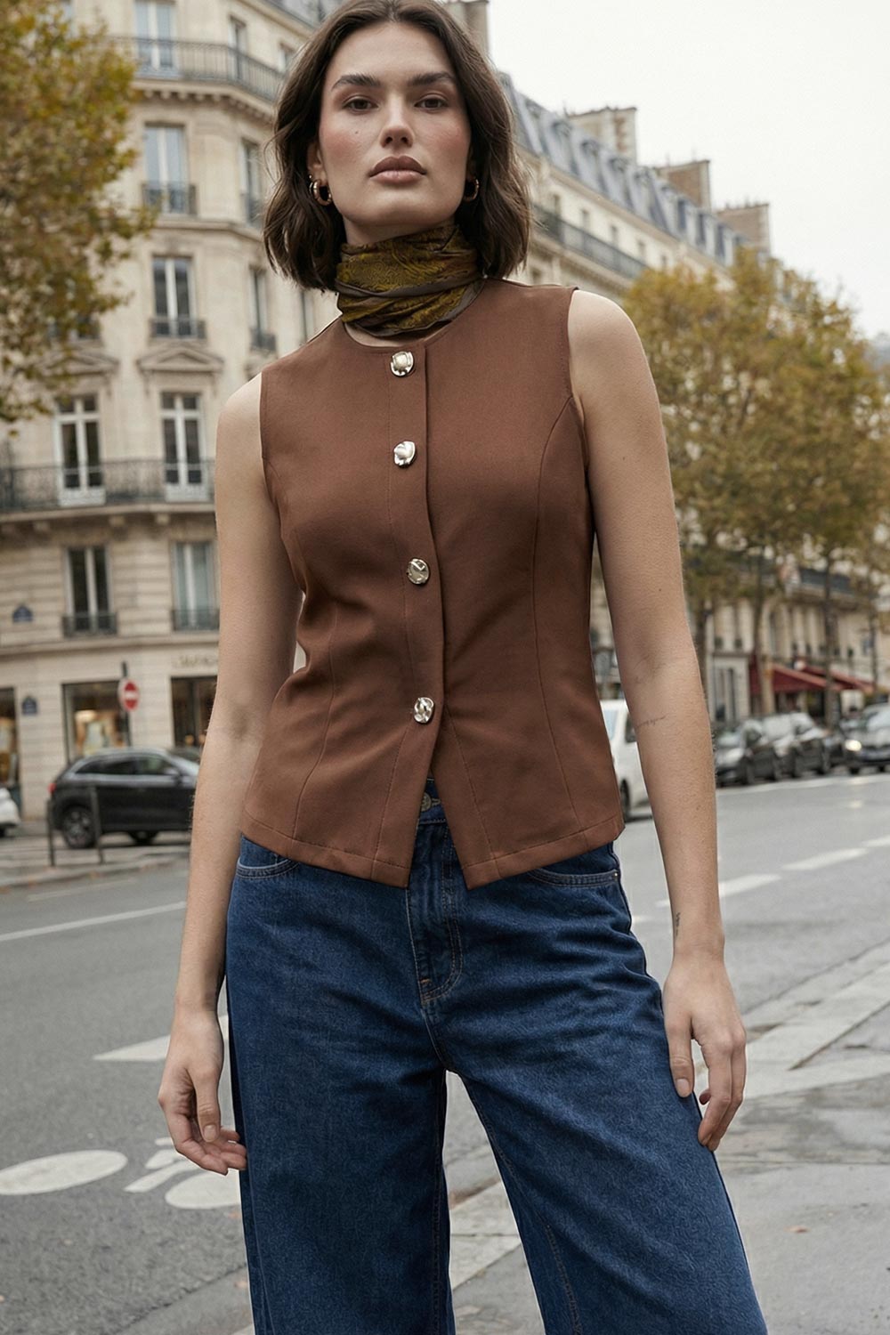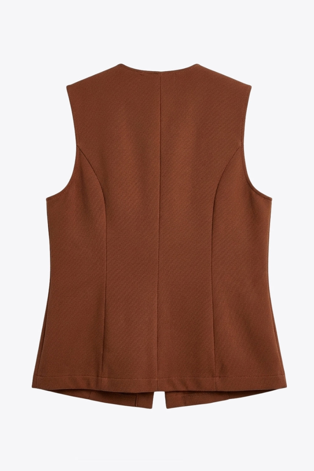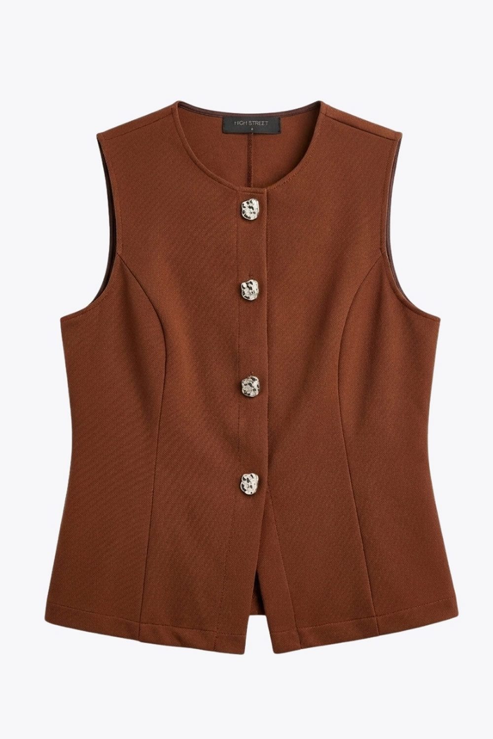 Chaleco de fit ajustado, con pinzas, cuello redondo y cierre frontal con hilera de botones en contraste. Detalle de abertura v frontal en bajo.