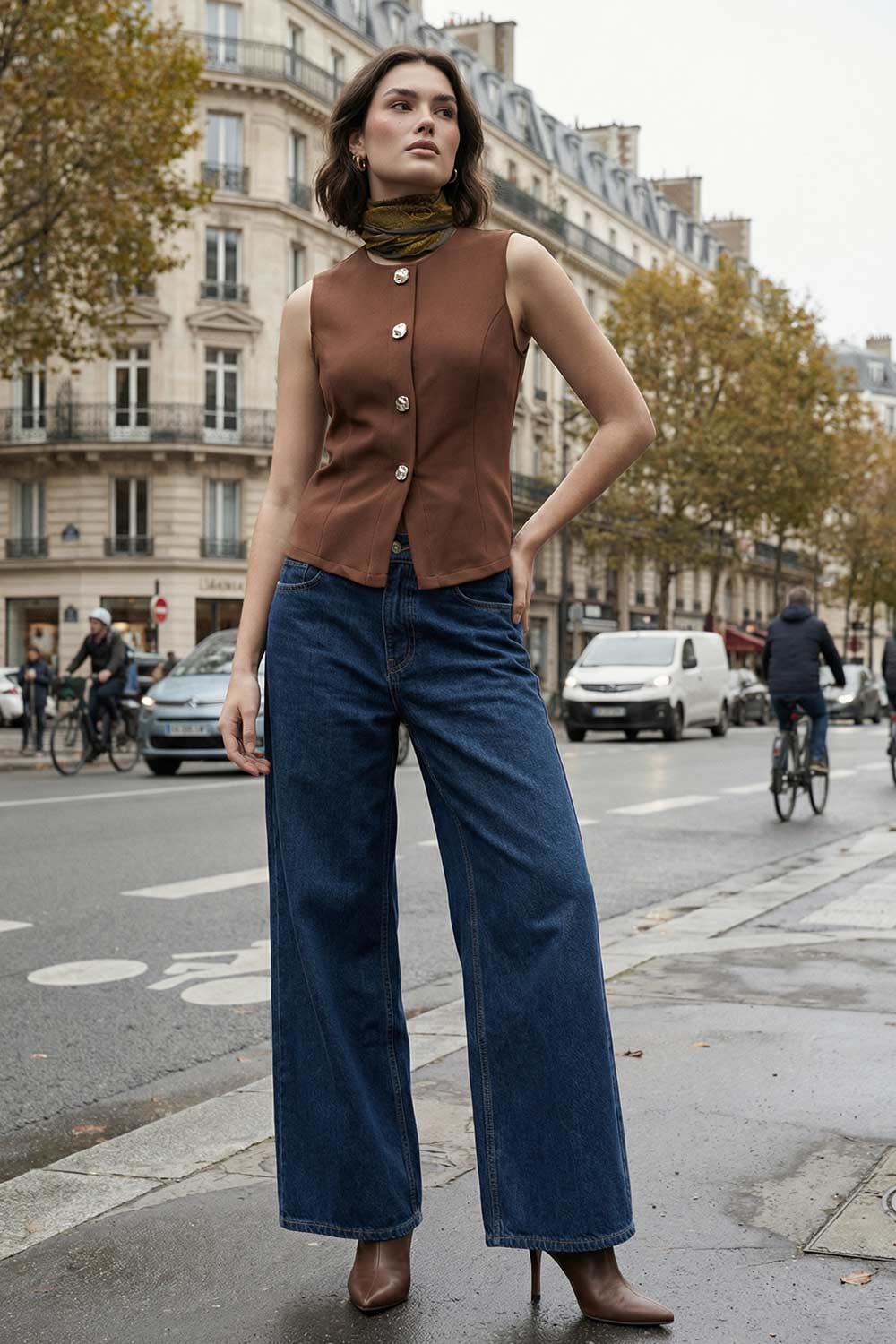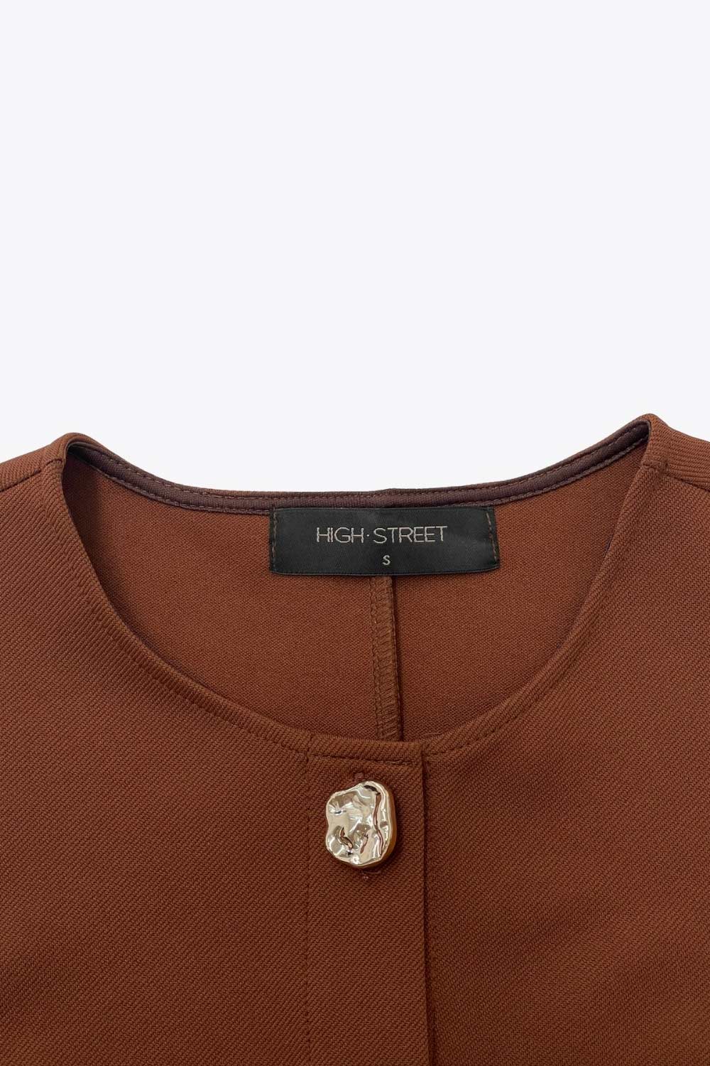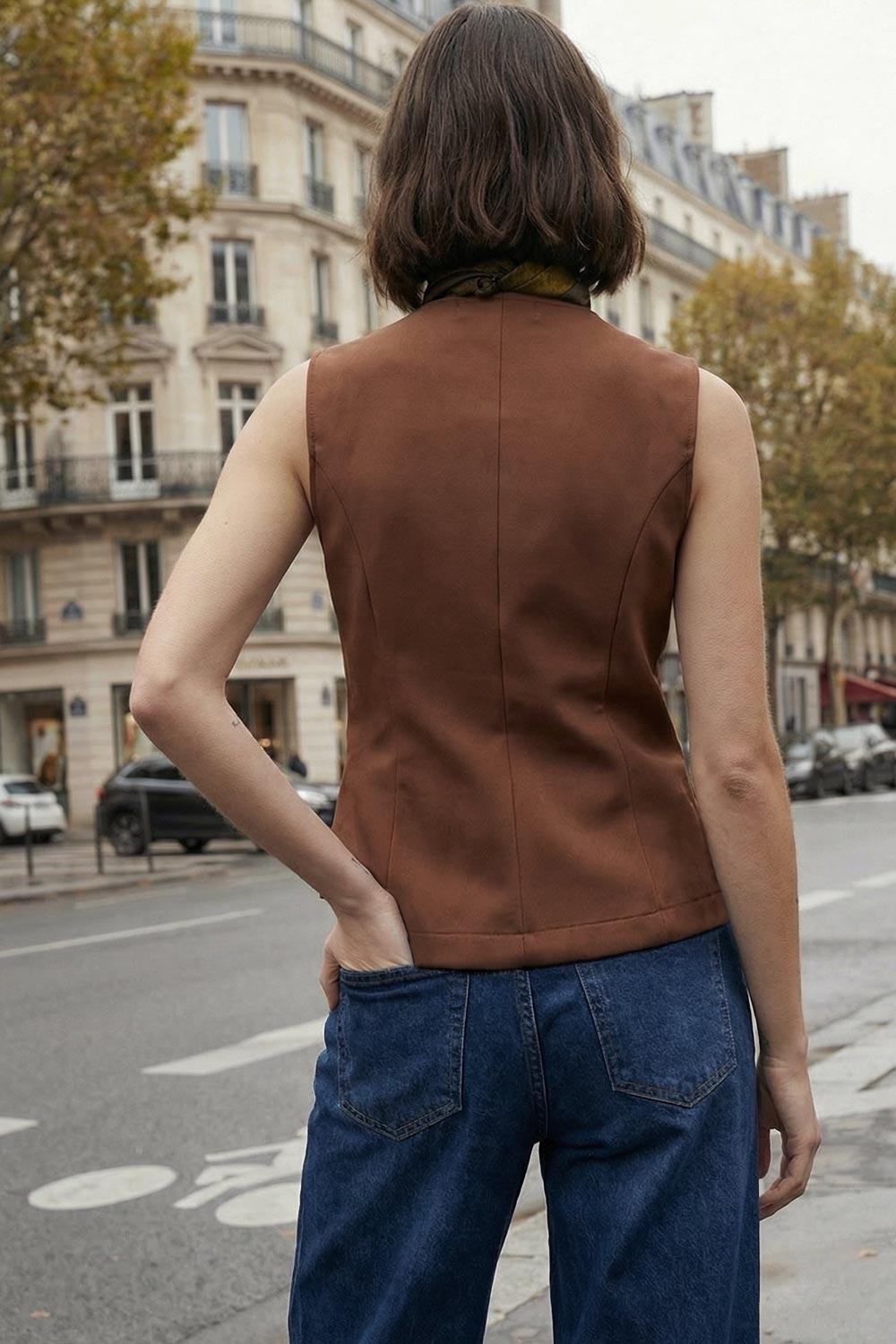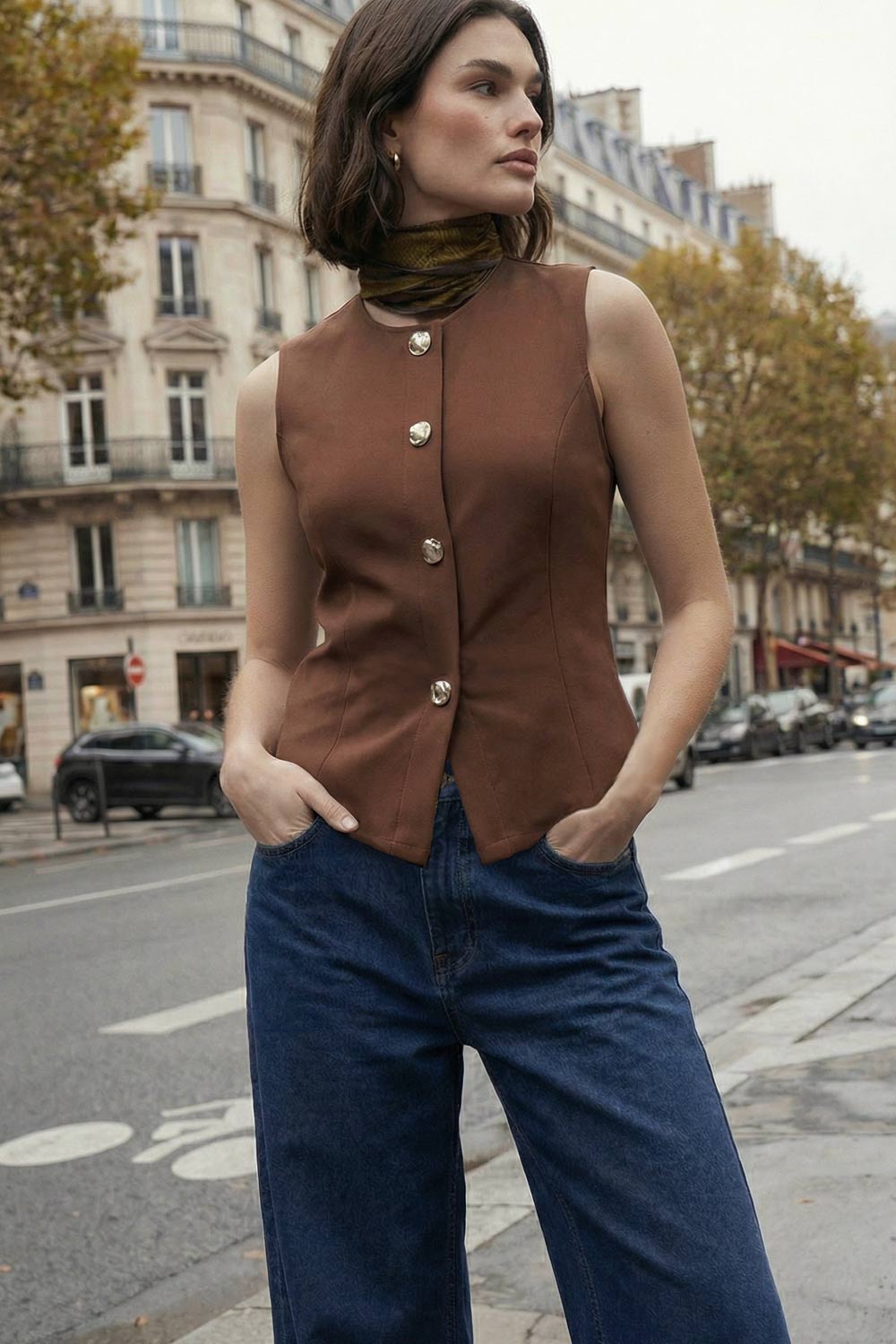 Chaleco de fit ajustado, con pinzas, cuello redondo y cierre frontal con hilera de botones en contraste. Detalle de abertura v frontal en bajo.
