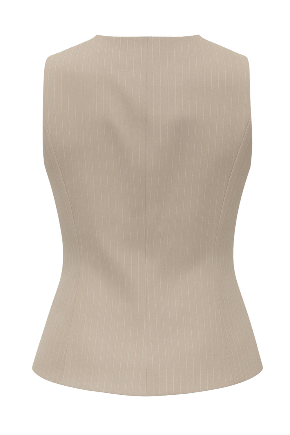 Chaleco corto de fit ajustado, estampado rayas, pinzas frontales, cuello redondo y abertura v en bajo. Cierre frontal con hilera de botones en contraste.