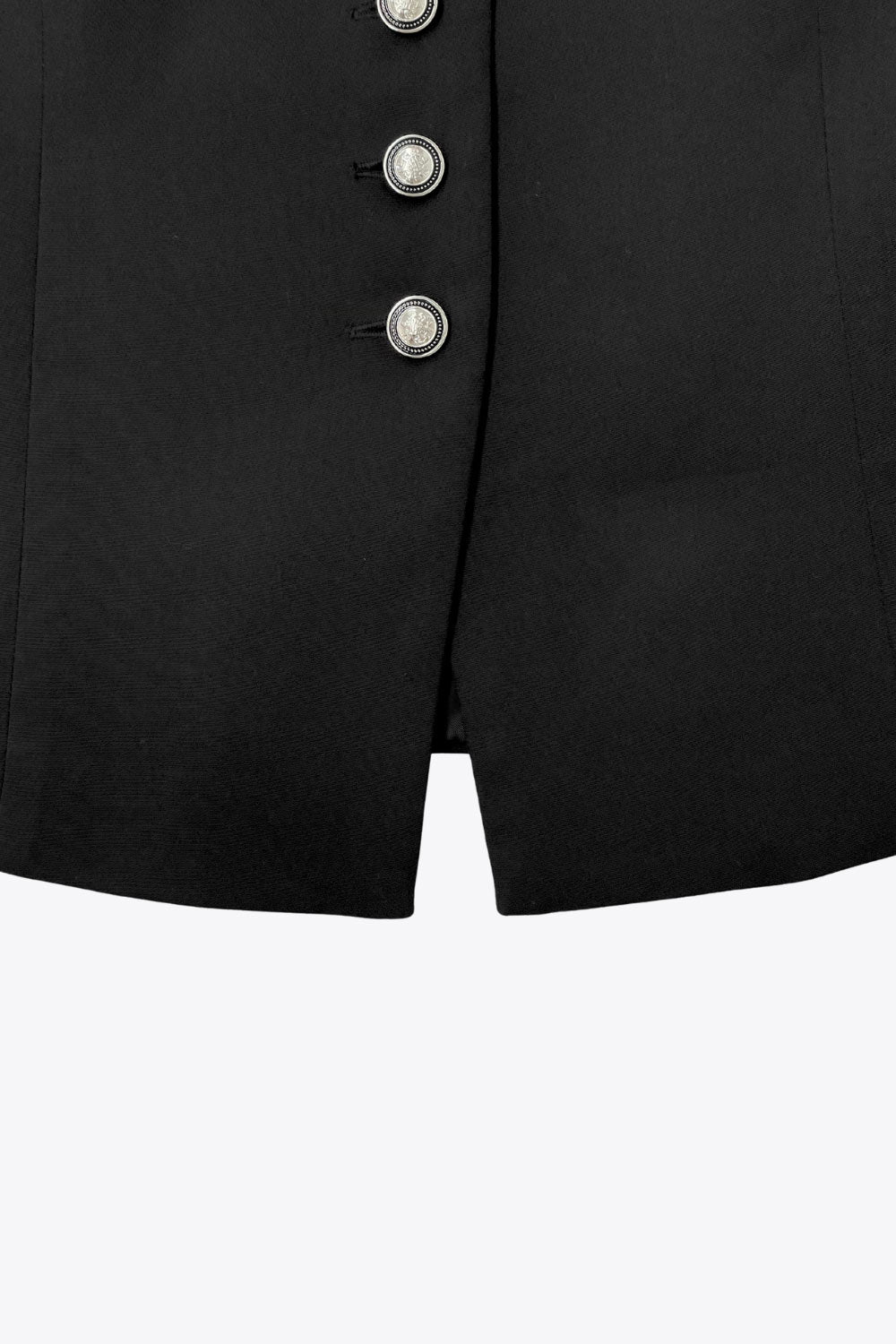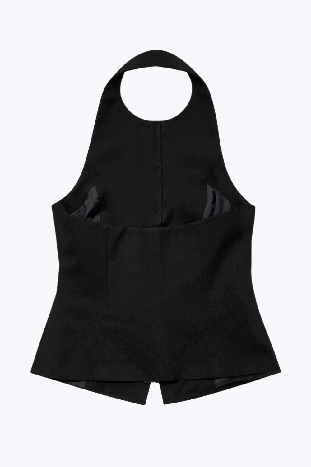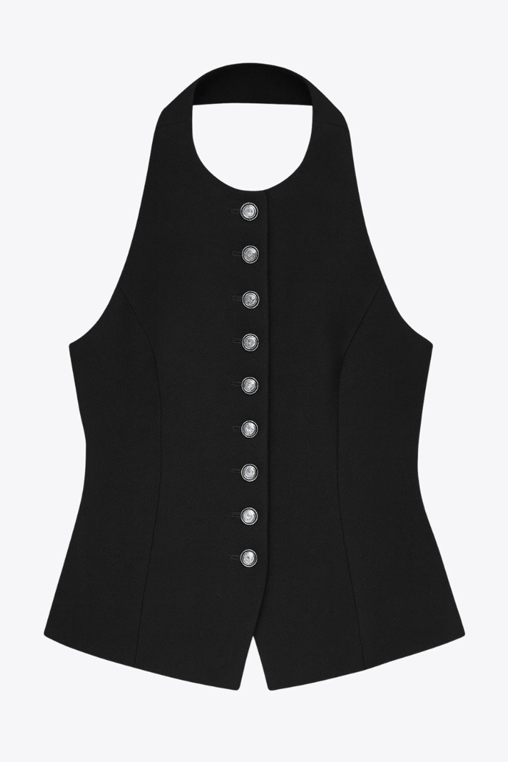 Chaleco corto halter, de fit ajustado, cuello redondo, cierre frontal con hilera oculta de botones, en contraste, pinzas frontales y abertura en bajo. Detalle de escote en espalda.