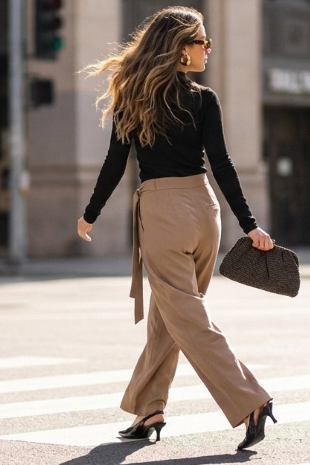 Pantalón de fit wide leg, pinzas frontales, cintura alta y cruce frontal con lazo amarrable lateral. Detalle de vivo posterior.
