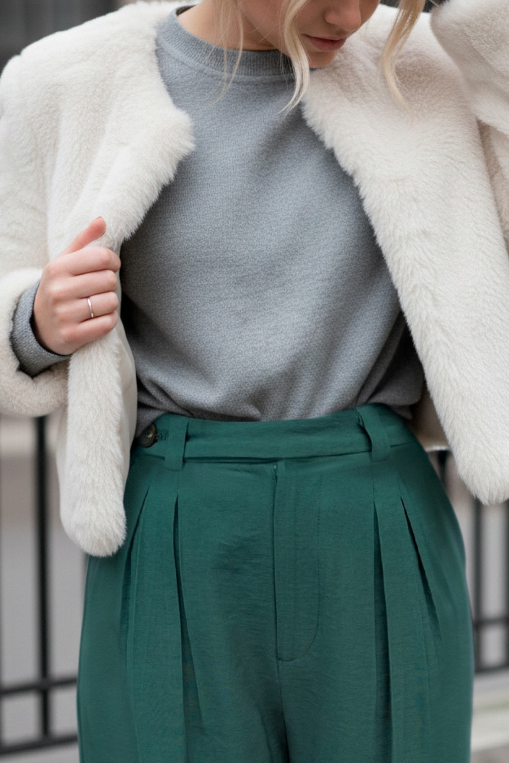Pantalón fluido de fit wide leg, cintura alta con pretina, trabillas, pinzas frontales y bolsillos delanteros. Cierre frontal con cremallera oculta y detalle de botón lateral en pretina.