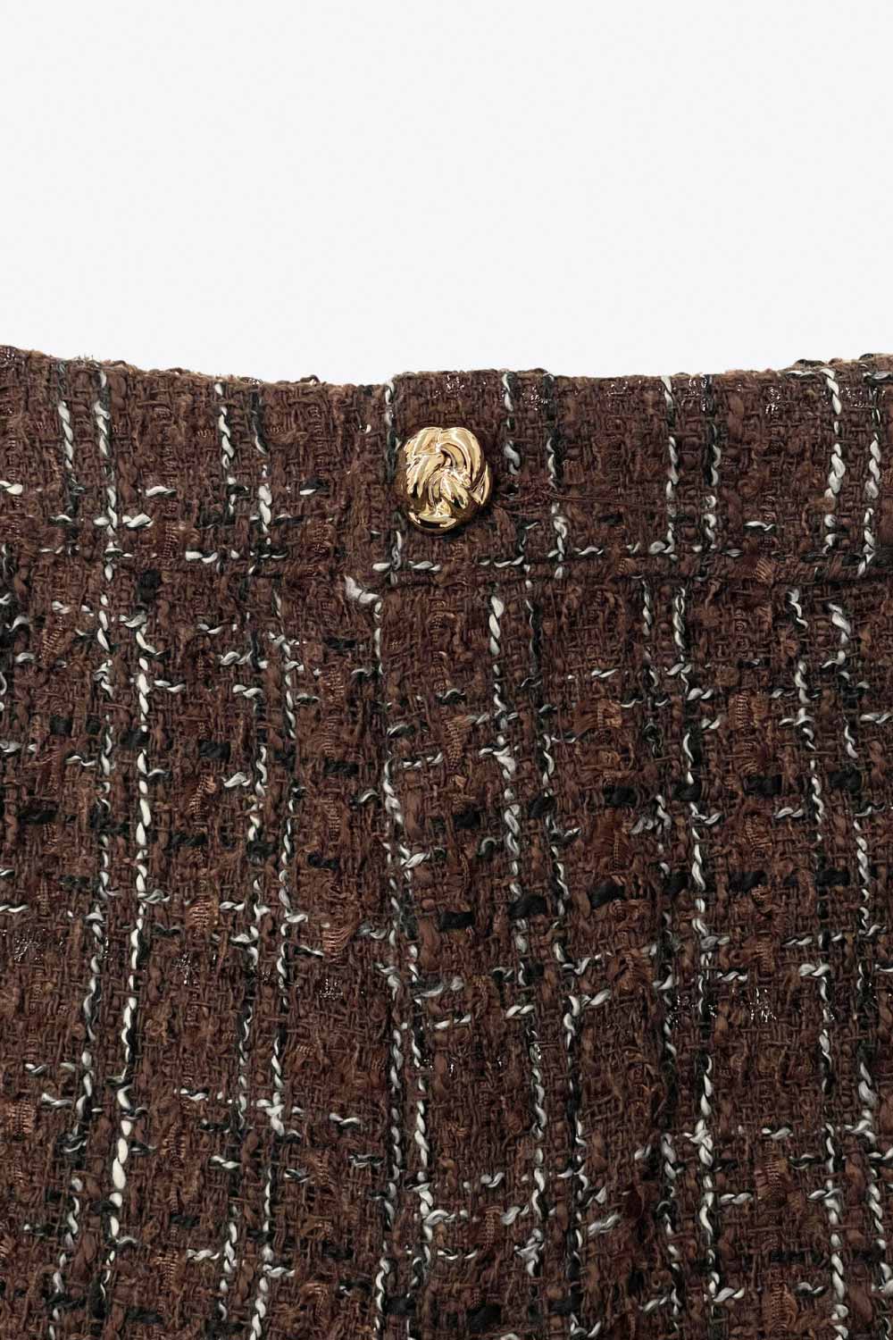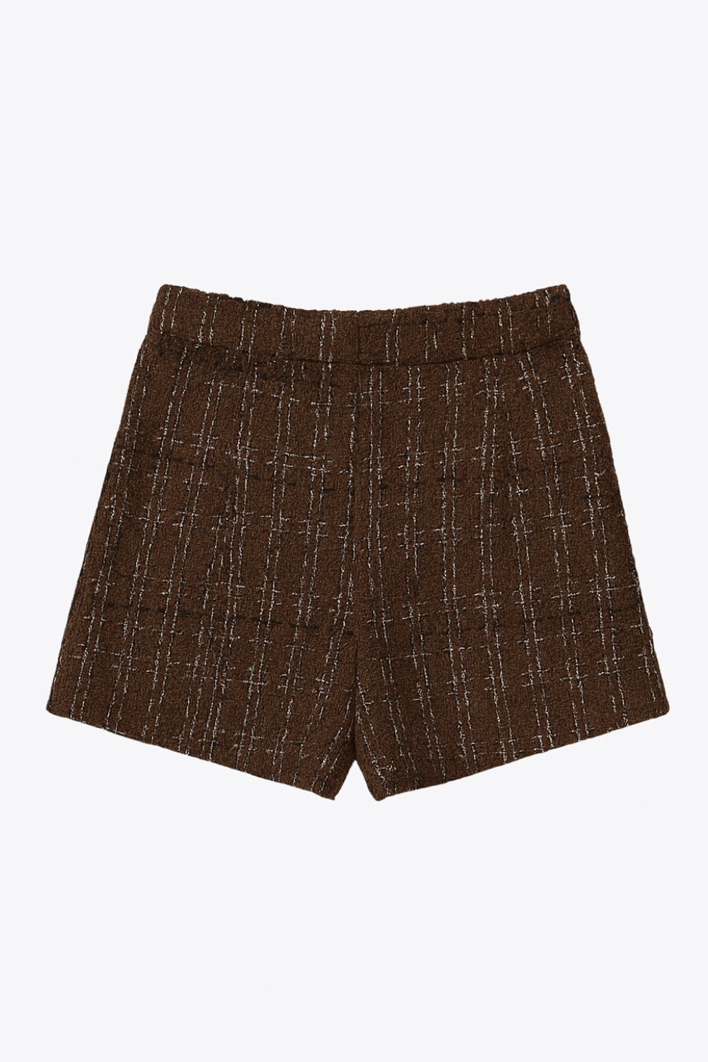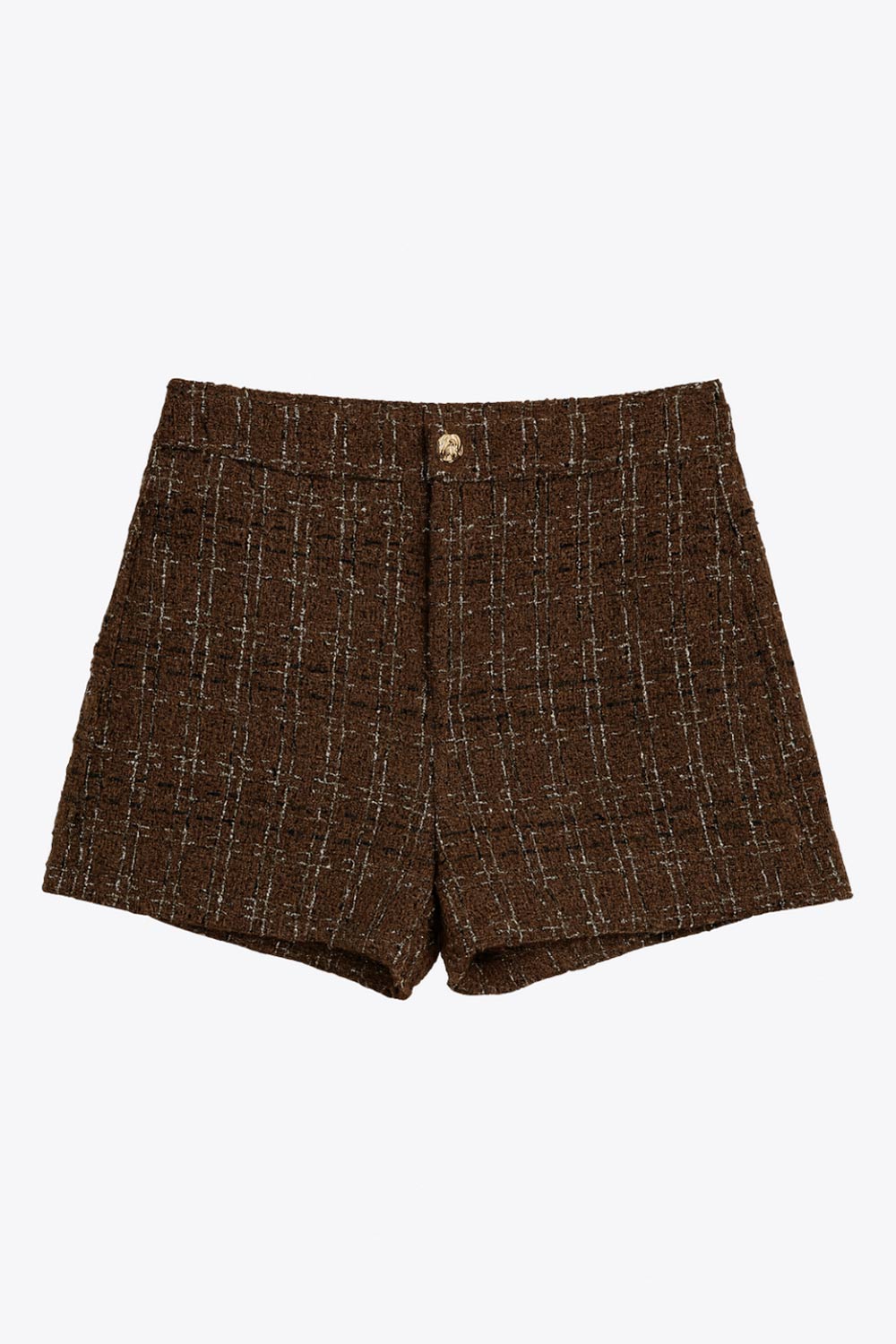 Short corto de bouclé, fit ajustado, cintura alta con pretina, cierre frontal con cremallera oculta y botón en contraste.