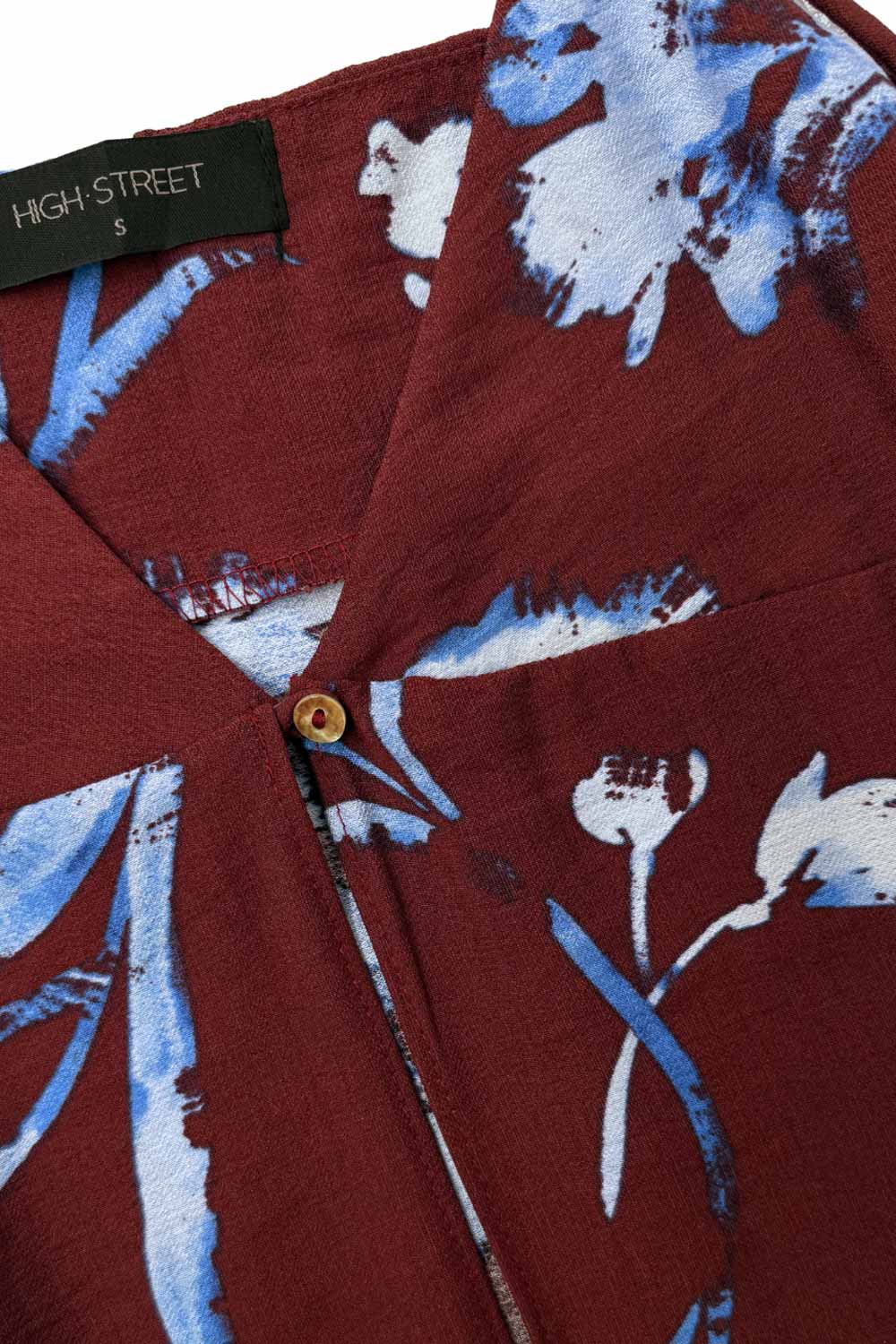Blusa larga estampada, de fit fluido, tirantes delgados con nudo ajustable, escote v con cortes, abertura frontal y cierre con botón.