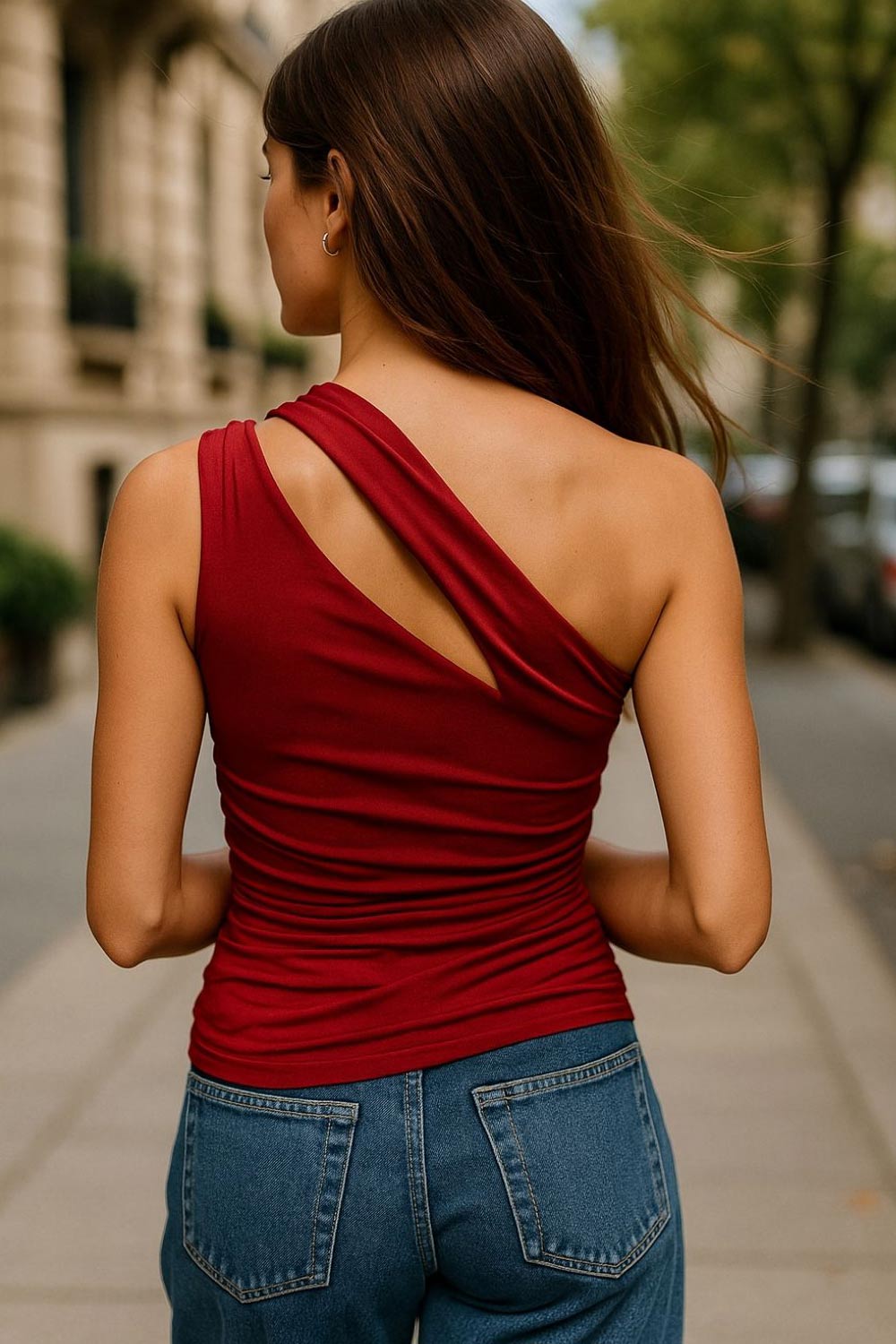 Top corto de fit ajustado, escote diagonal, plisados en costados, asimétrico de un hombro con cut out y plisados decorativos.