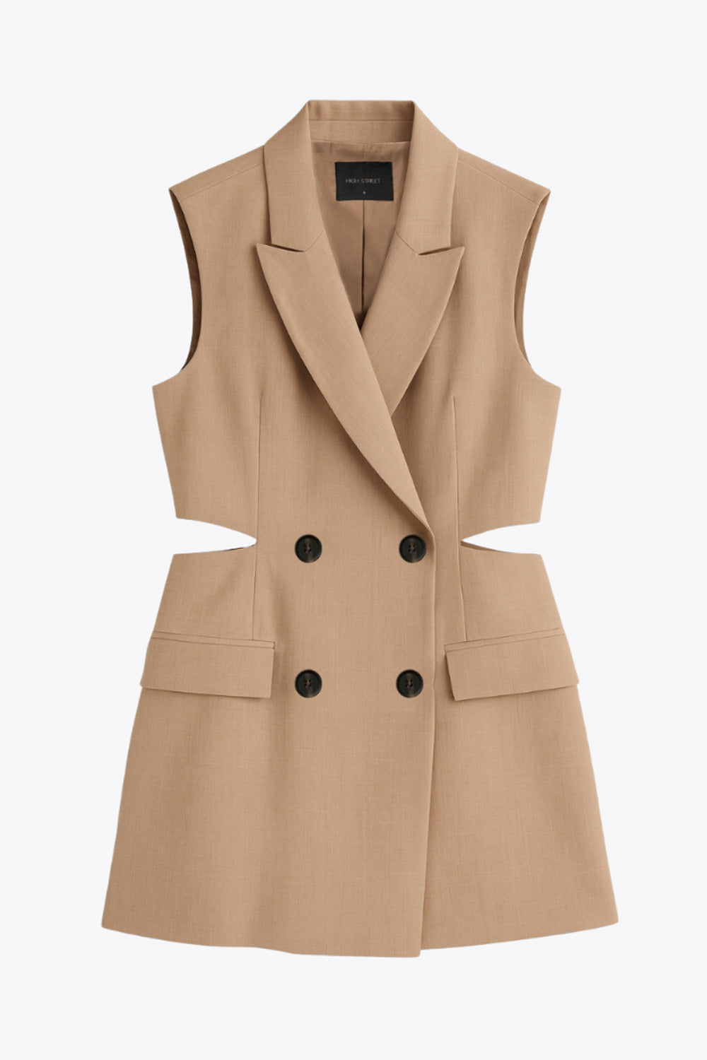 Vestido chaleco con solapa y con doble cruce de botón en contraste. Detalle de bolsillos frontales con cartera, cut out en costados y espalda.