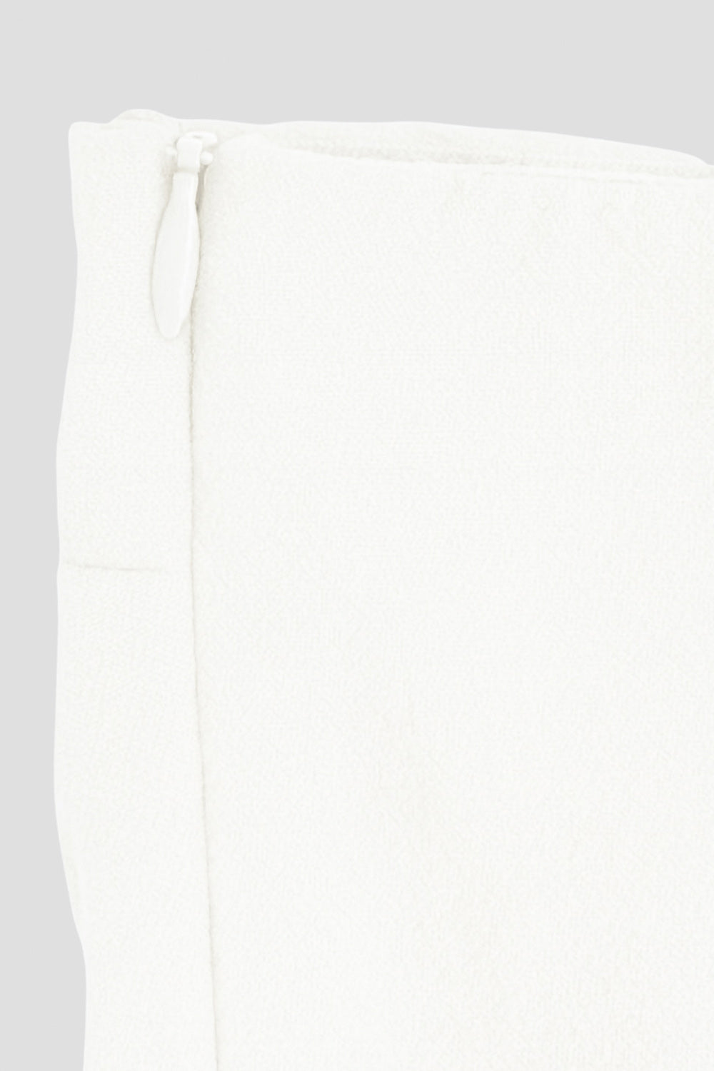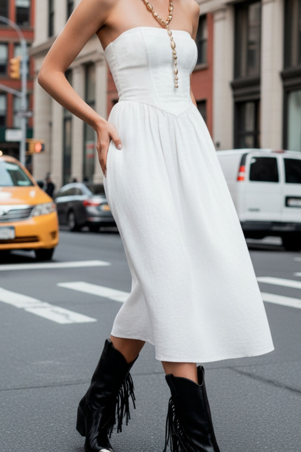 Vestido midi strapless de escote recto, fit ajustado, detalle v frontal en cintura con plisados, corte en a y cierre lateral con cremallera oculta.