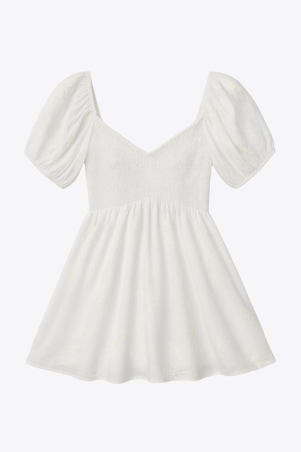Vestido corto bordado, de talle fruncido, escote v, manga corta abullonada con rib elástico en bordes y corte en a con olanes en bajo.