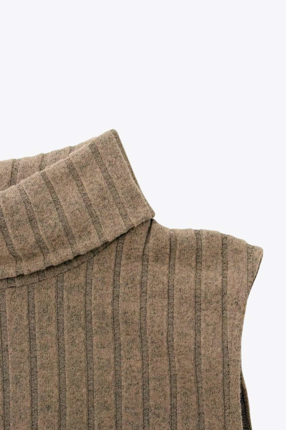 Vestido corto canalé de punto, sin mangas, corte en a y cuello alto con doblez.