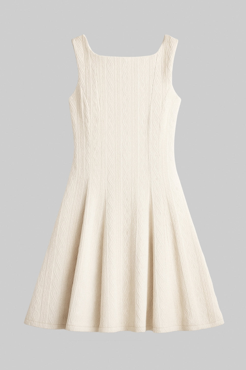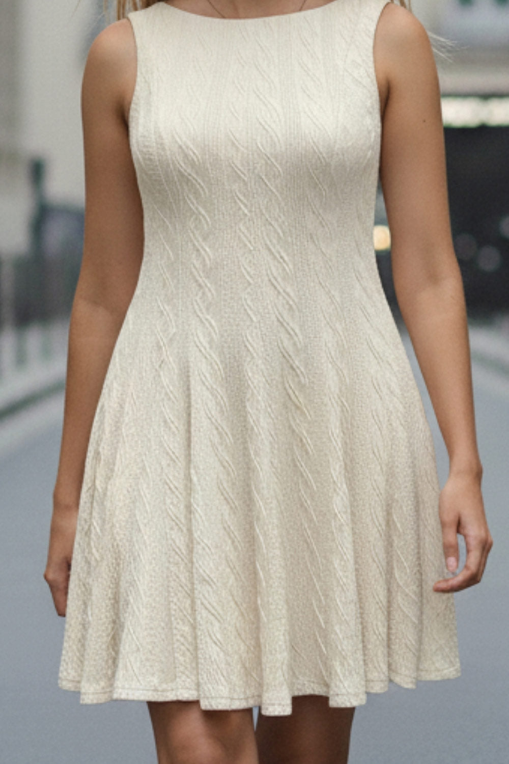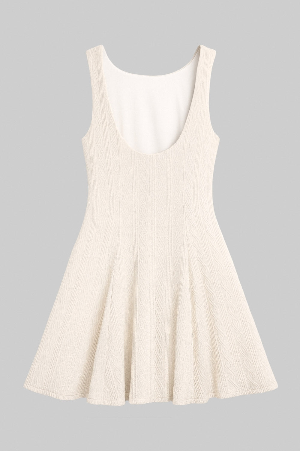 Vestido corto de cuello barco, sin mangas, pinzas frontales, escote en espalda y corte en a con olanes en bajo. Detalle de textura en tejido.