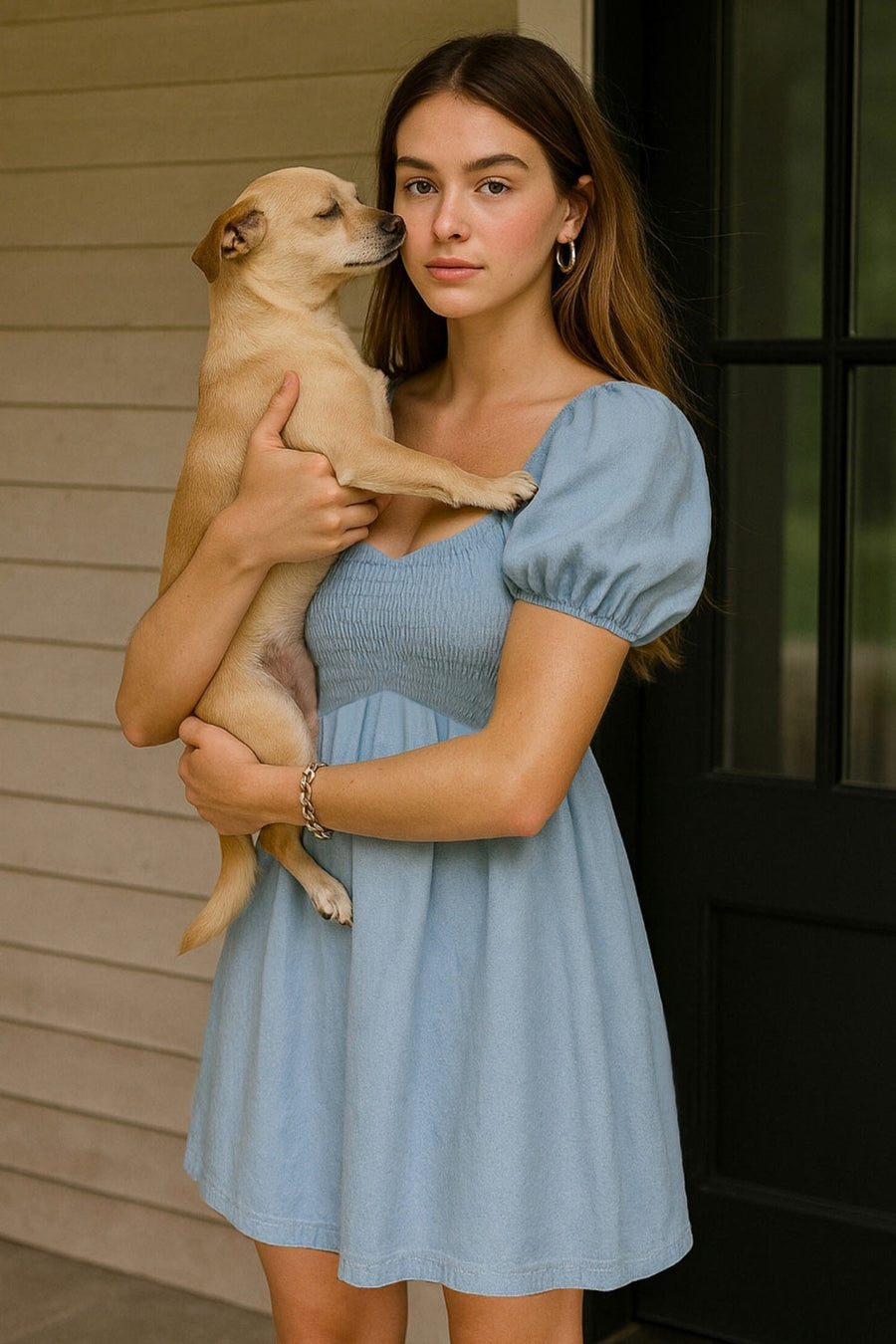 Vestido corto de lino, talle fruncido, escote v, manga corta abullonada con rib elástico en bordes y corte en a con olanes en bajo.