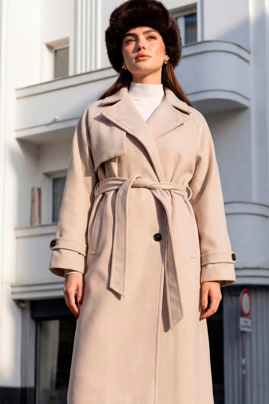 Abrigo largo botón en contraste con cinturón