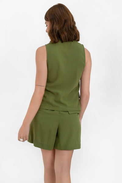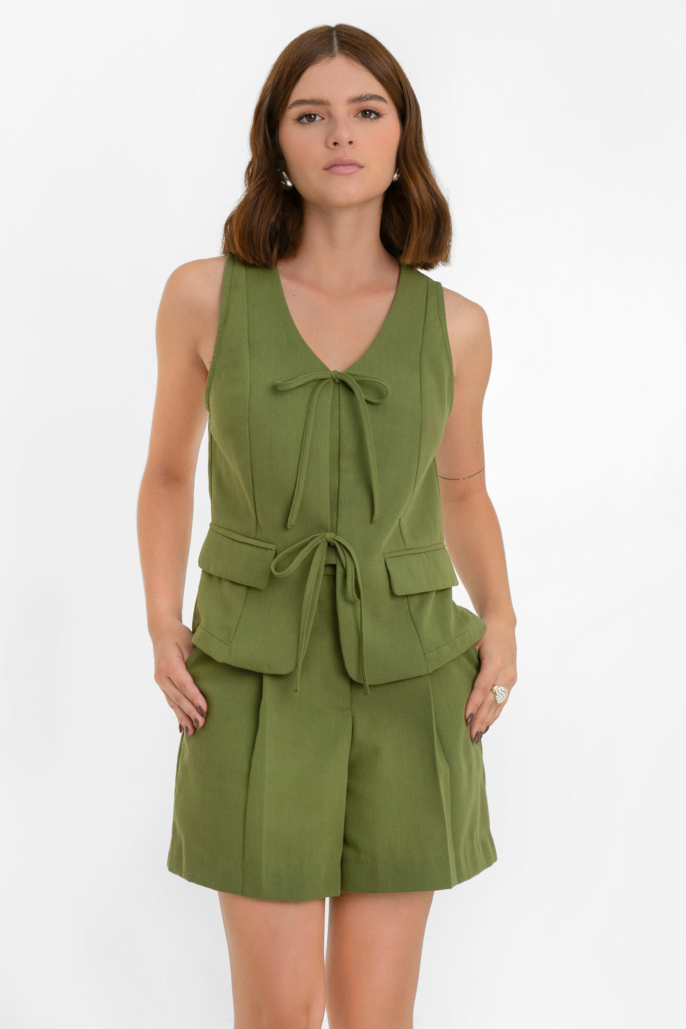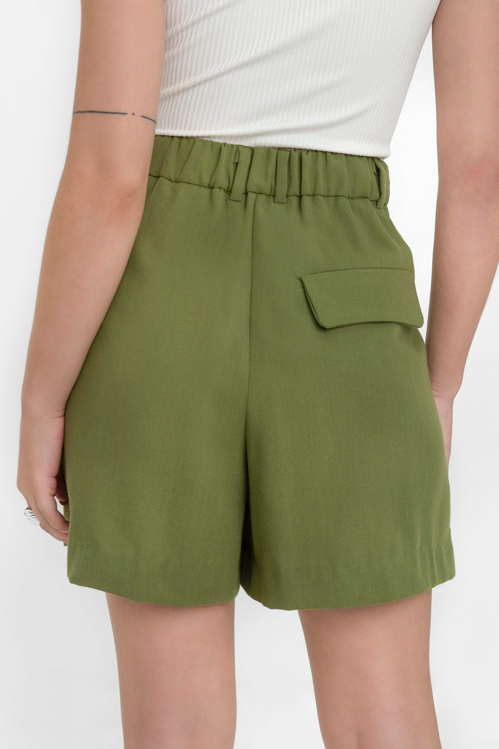 Bermuda de fit recto, pinzas frontales, cintura alta con pretina elástica posterior y trabillas, bolsillos delanteros y decorativo posterior con cartera. Cierre frontal con broche y cremallera ocultos.