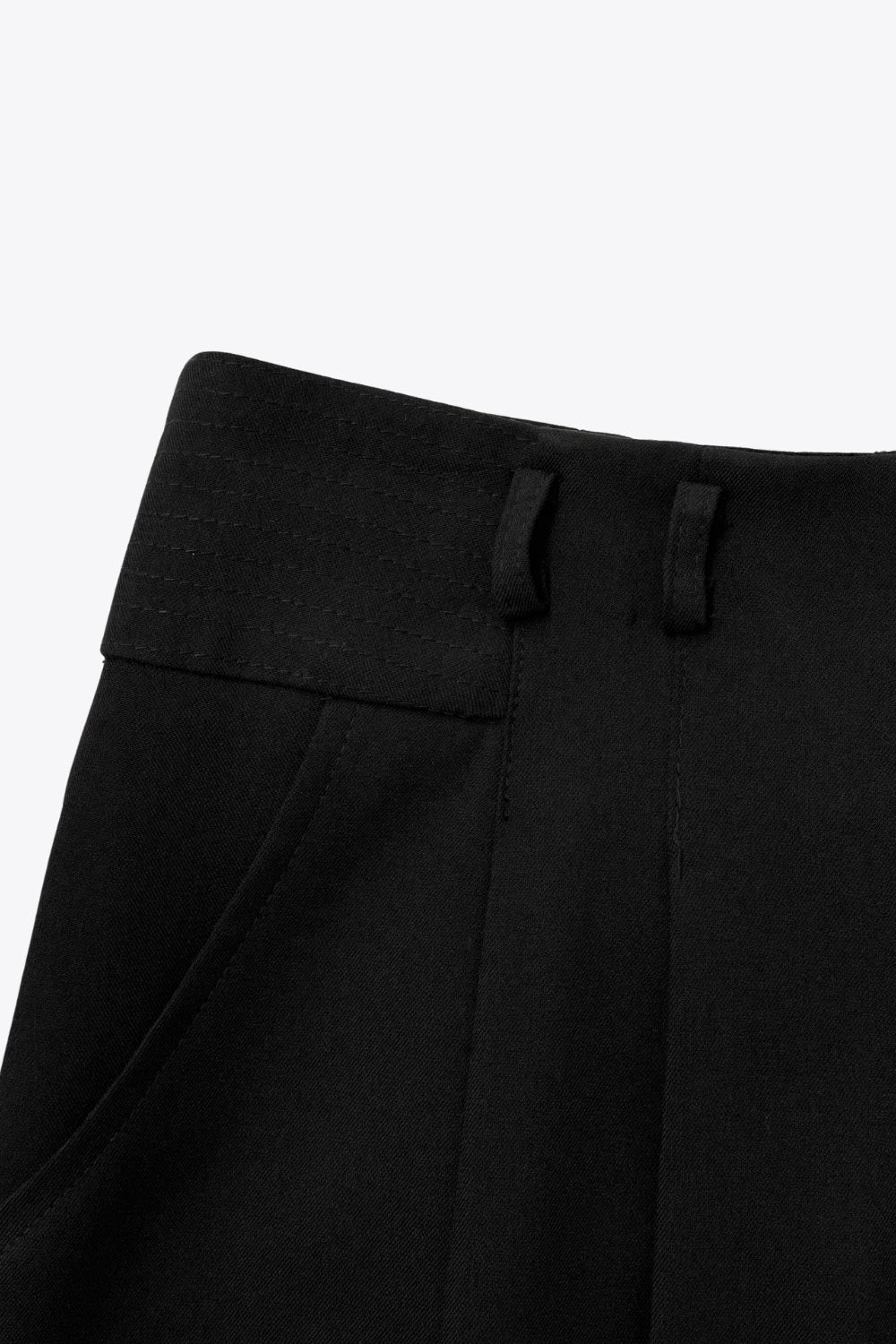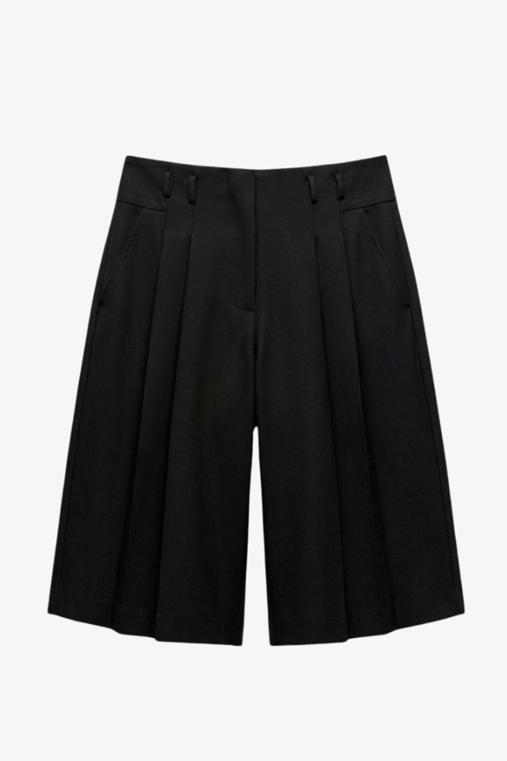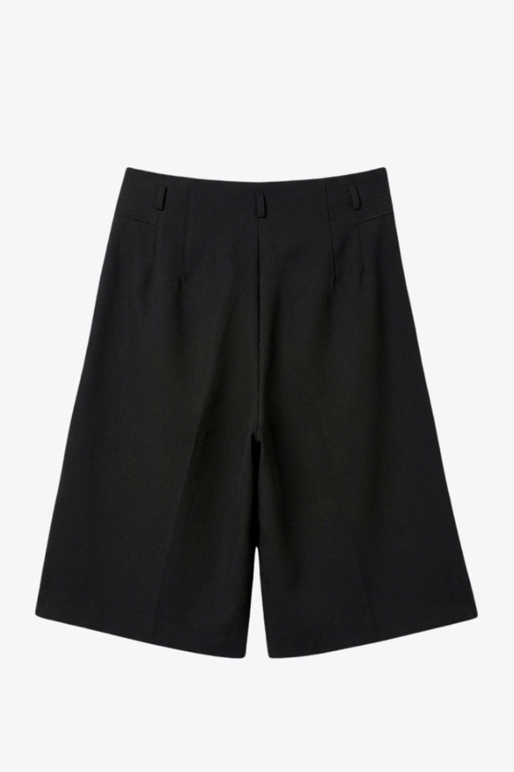 Bermuda de cintura media, pretina con costuras decorativas y trabillas, pinzas frontales, bolsillos delanteros y vivos decorativos posteriores. Cierre frontal con cremallera oculta.