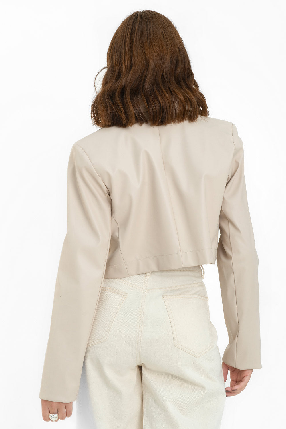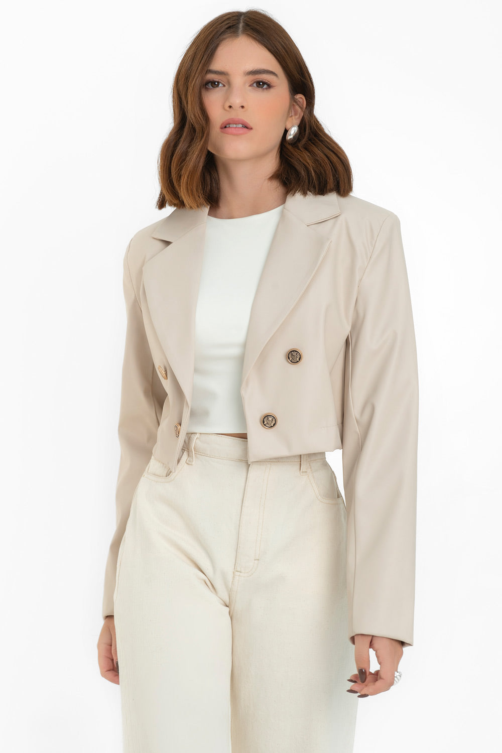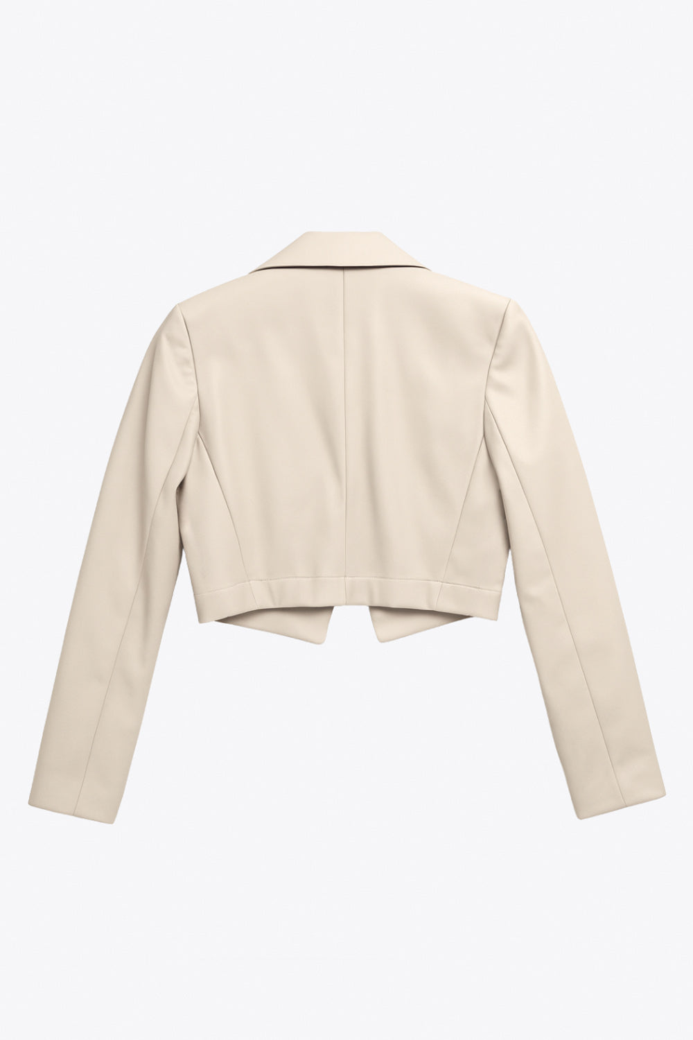 Blazer corto abierto de efecto piel, fit recto, con hombreras y solapa, manga larga y botones decorativos frontales en contraste.