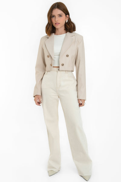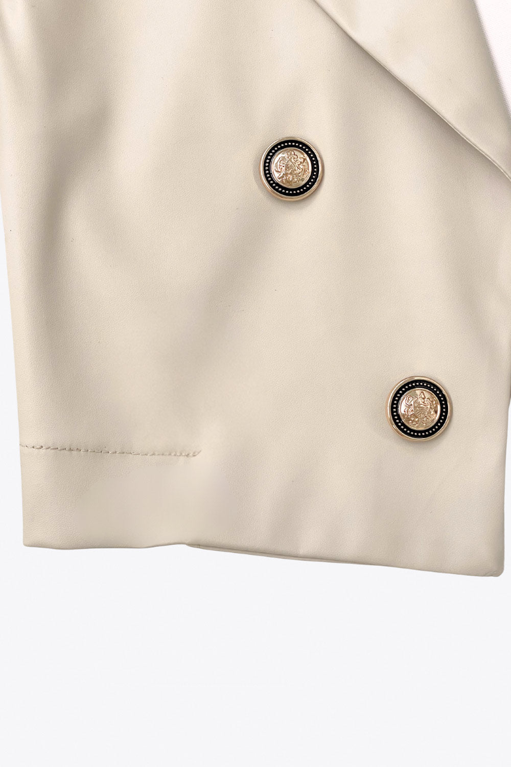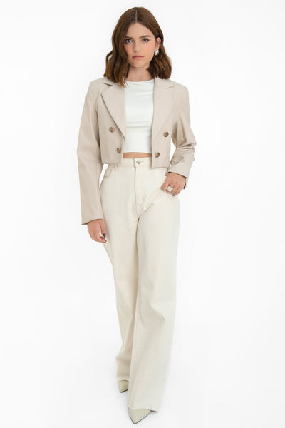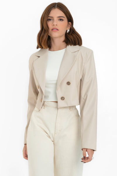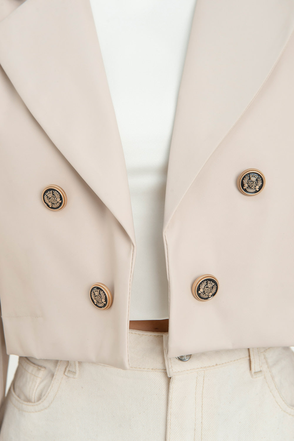 Blazer corto abierto de efecto piel, fit recto, con hombreras y solapa, manga larga y botones decorativos frontales en contraste.