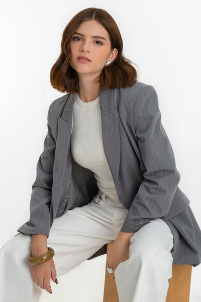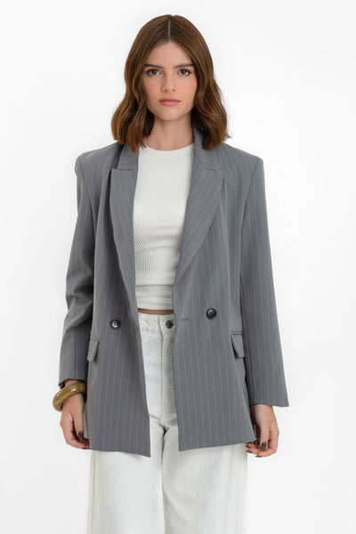 Blazer cruzado de estampado rayas, fit oversized, manga larga, bolsillos delanteros con cartera, con solapa y hombreras. Cierre frontal con cruce de botones en contraste.