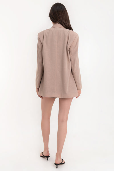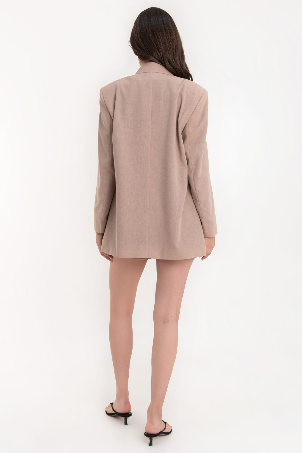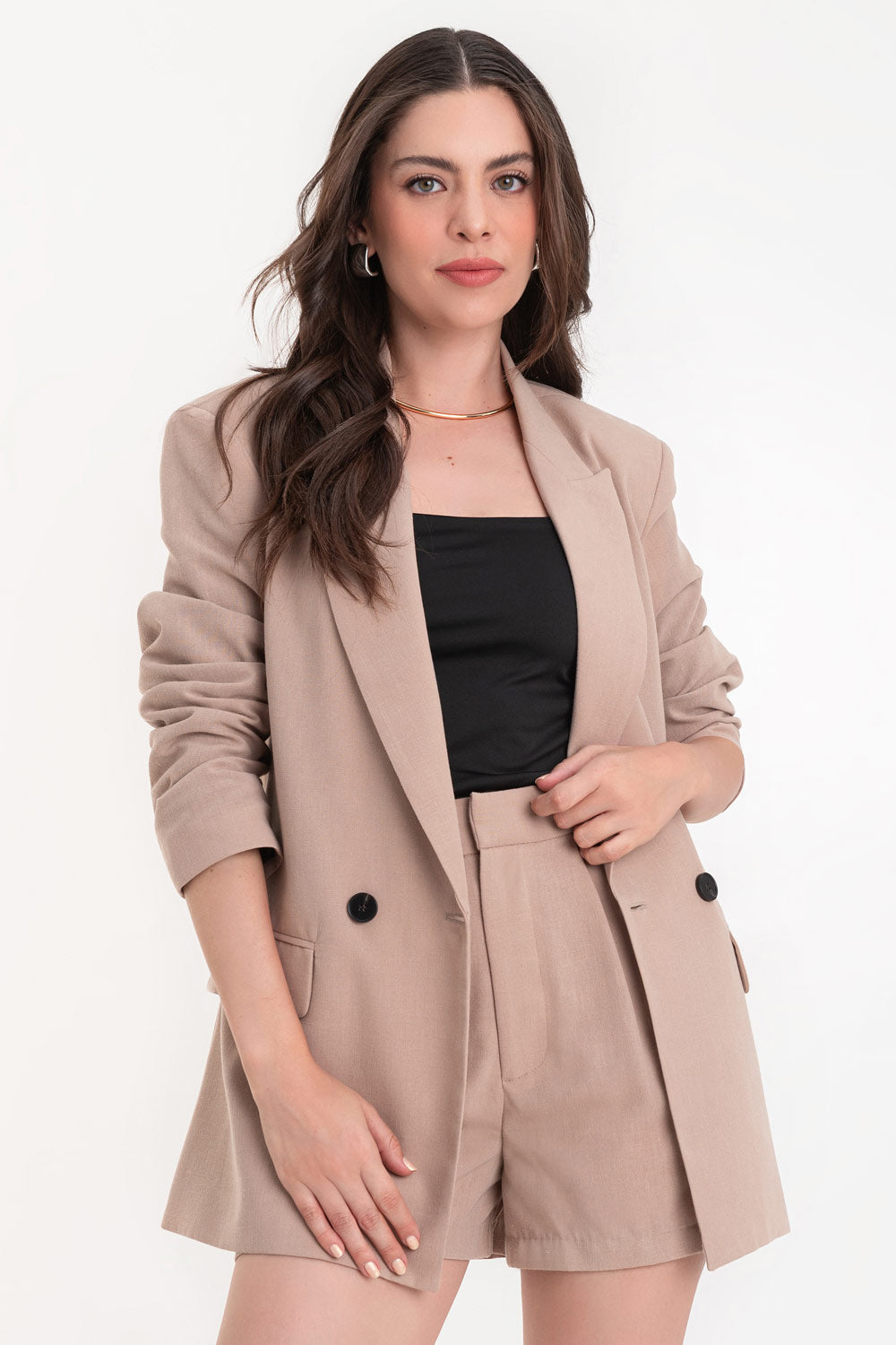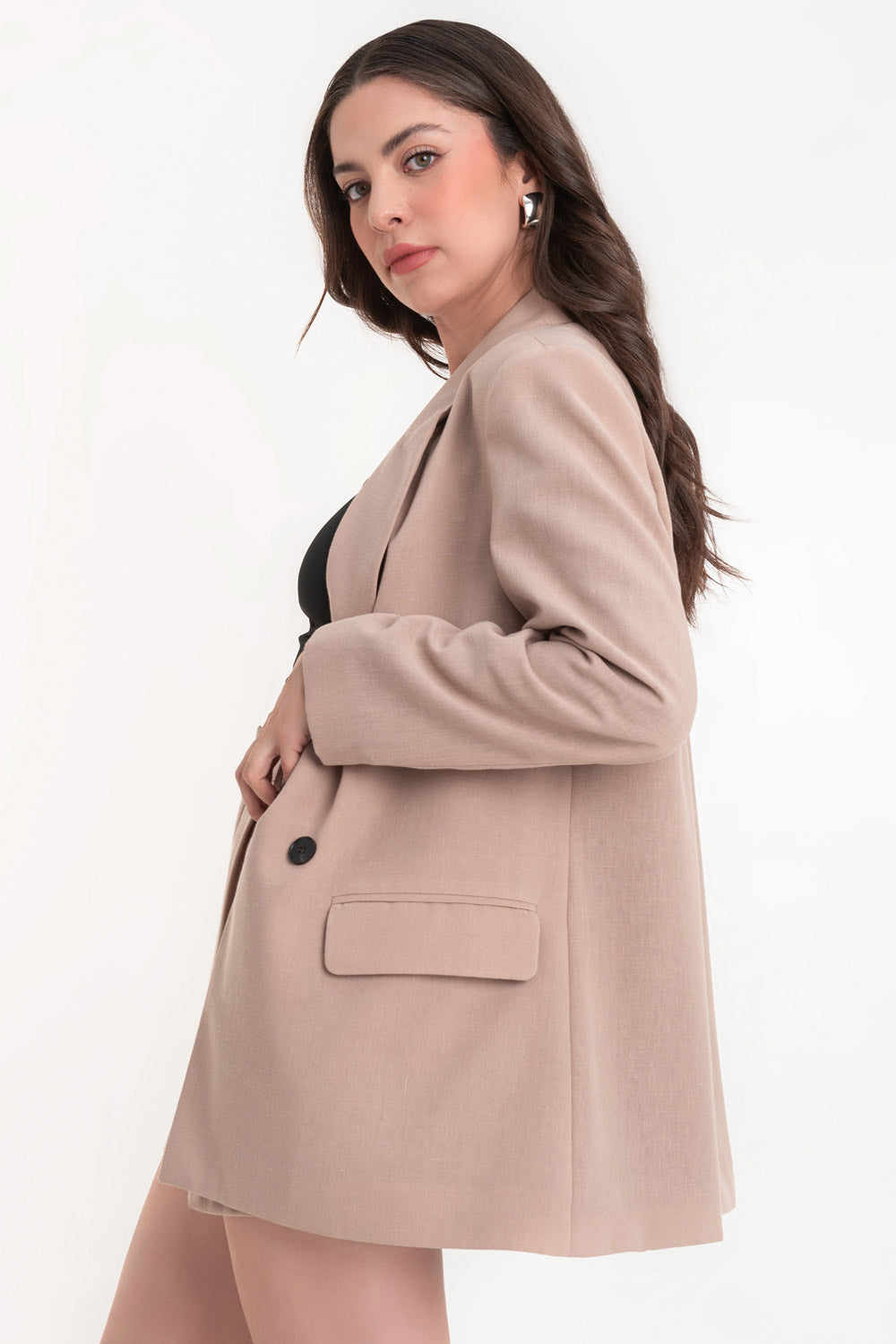 Blazer cruzado de fit oversized, manga larga, con solapa y hombreras, bolsillos delanteros con cartera y cierre frontal con cruce de doble botón en contraste.