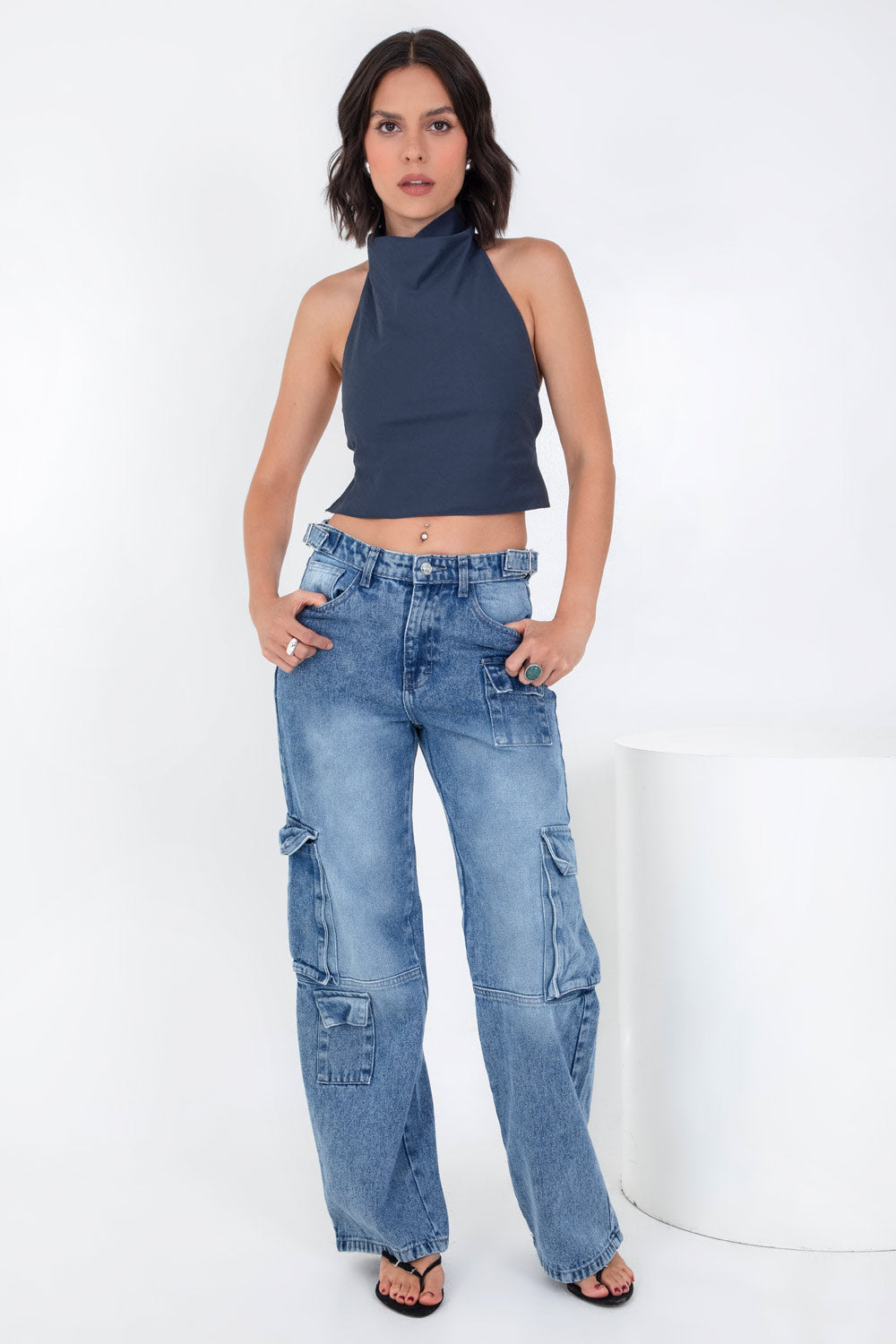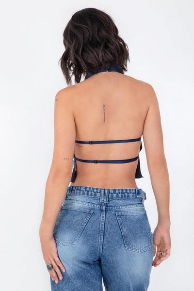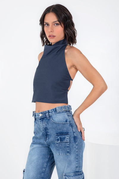 Blusa corta de cuello halter con escote fluido, sin mangas escote en espalda y cierre posterior con botón y ojal.