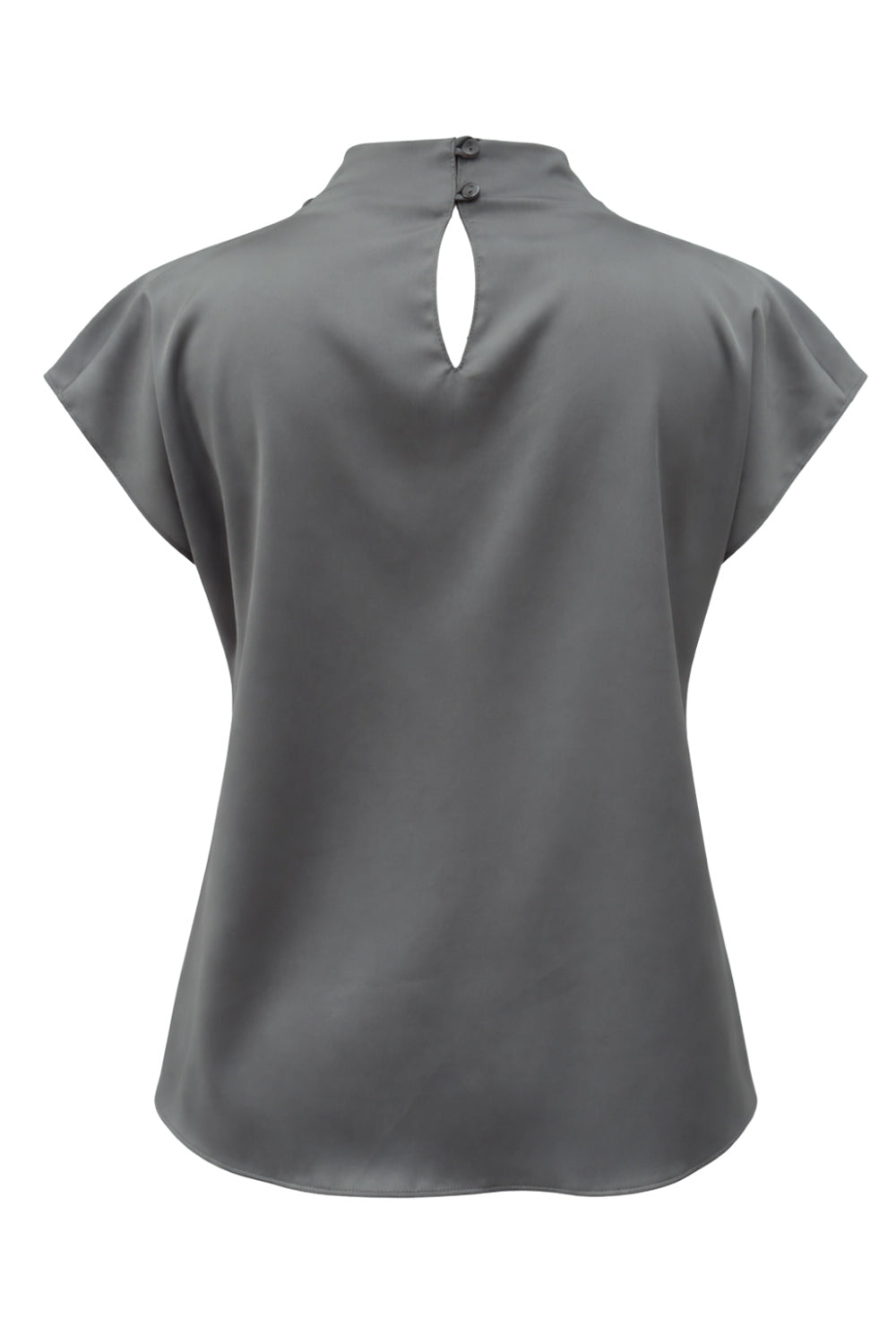 Blusa fluida de manga corta seguida, cuello mock seguido con plisados decorativos en hombro y cuello. Cierre posterior con botones y ojales.