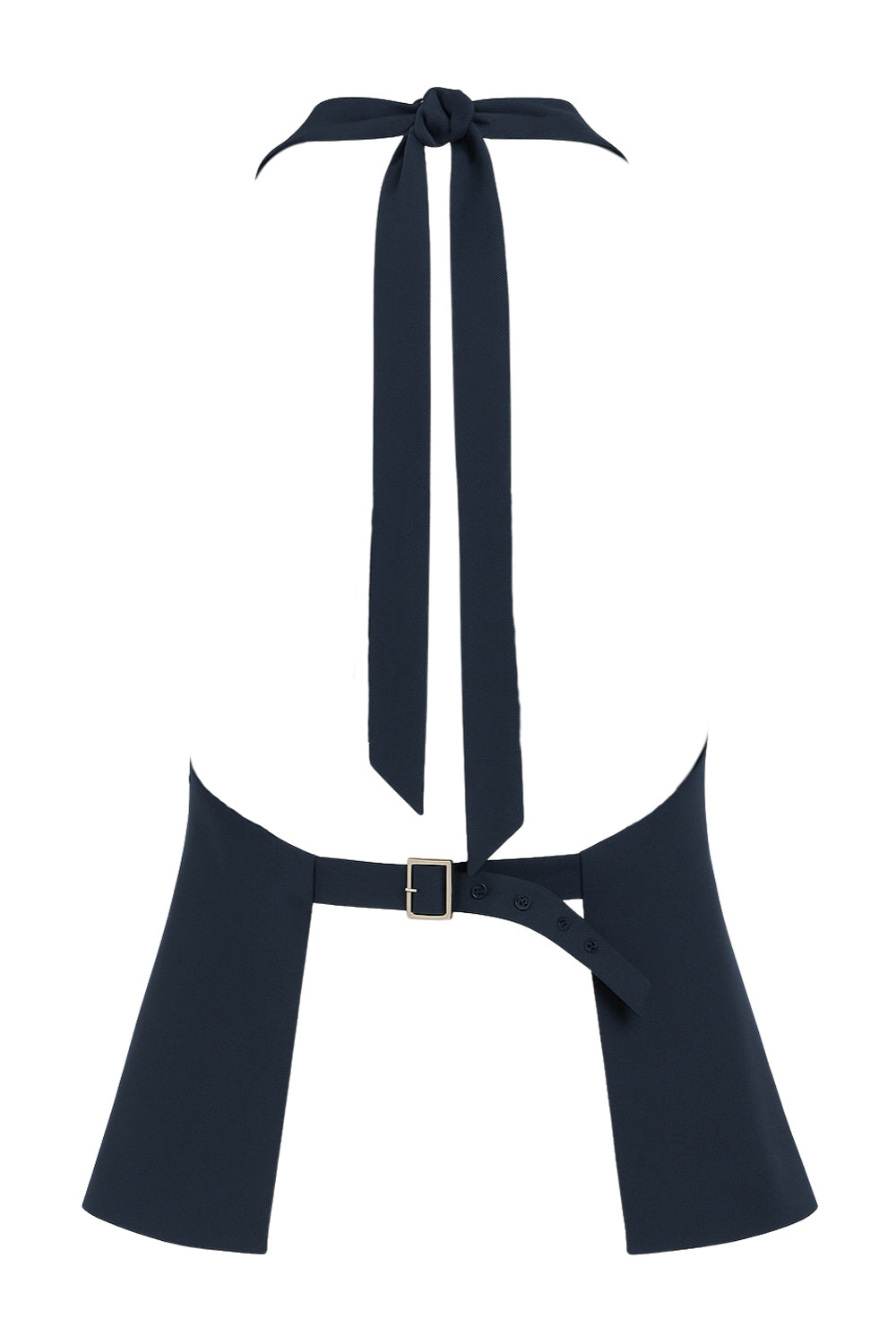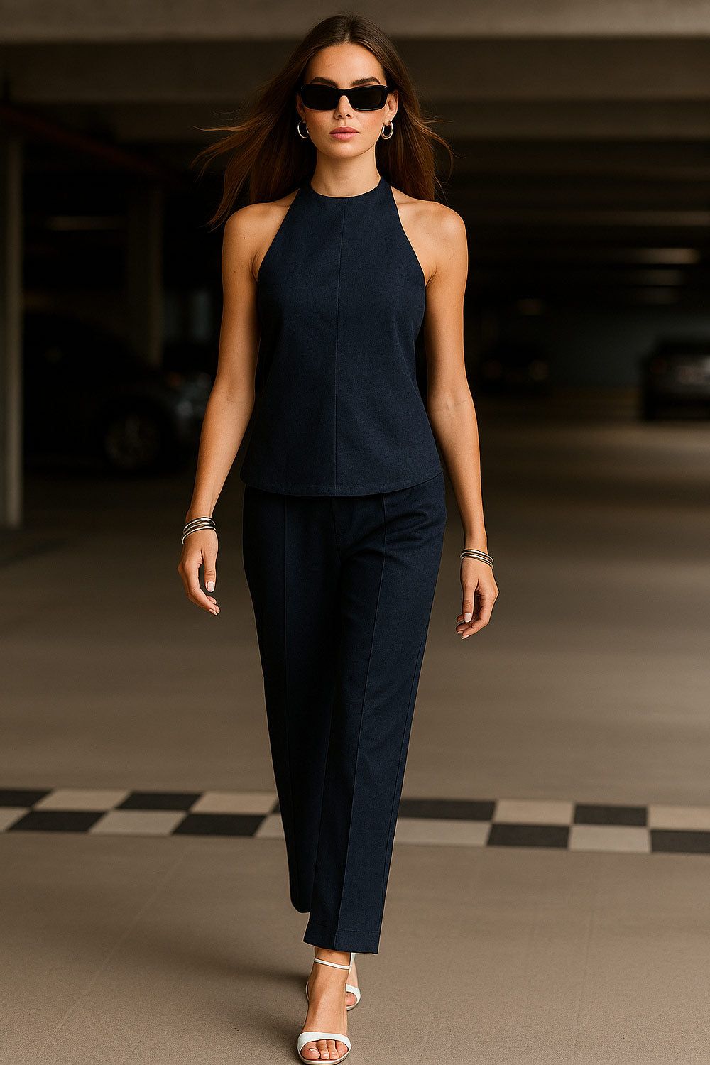 Blusa de fit fluido, cuello halter con nudo amarrable posterior, escote en espalda y cierre posterior con trabilla ajustable.