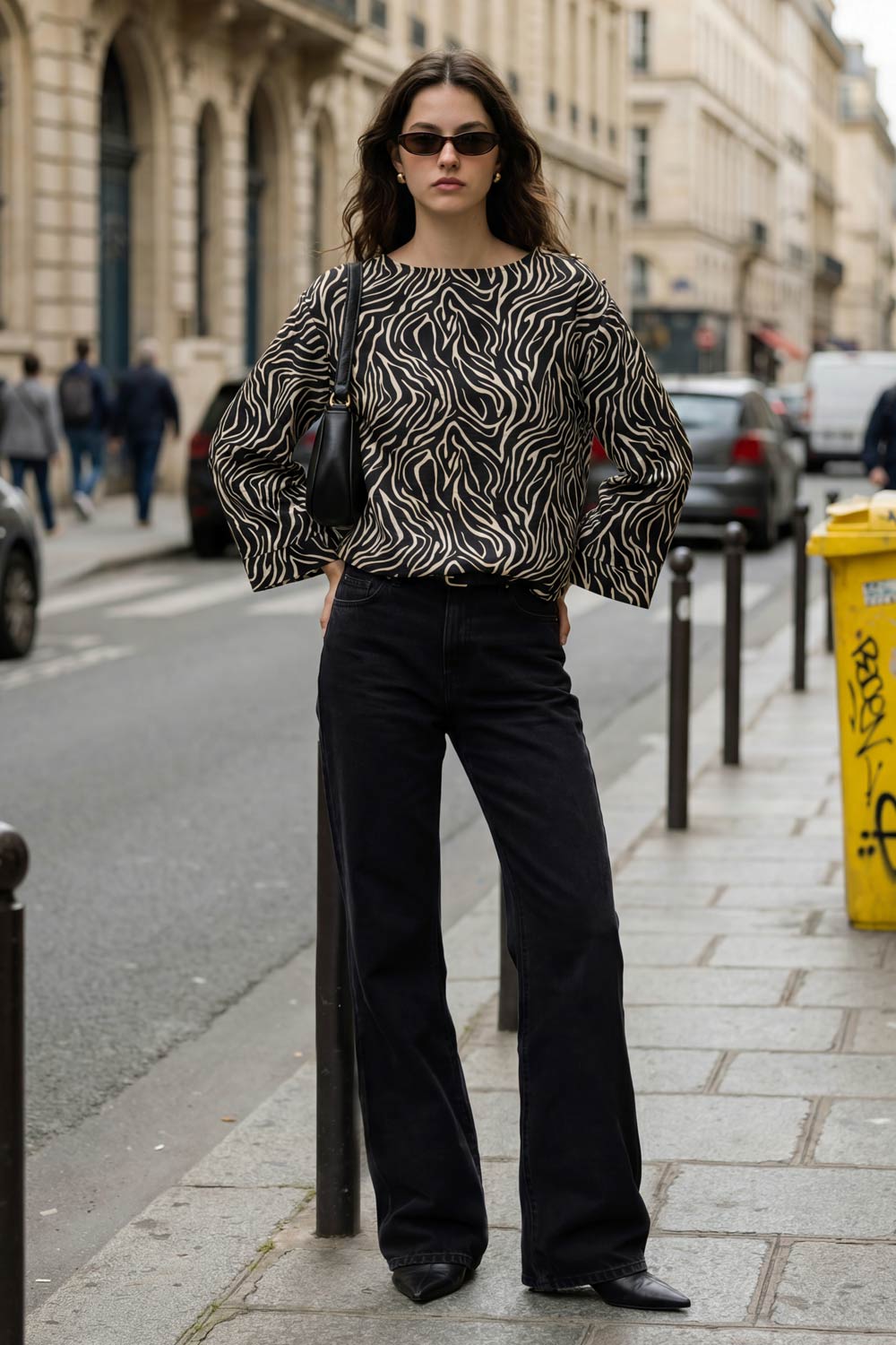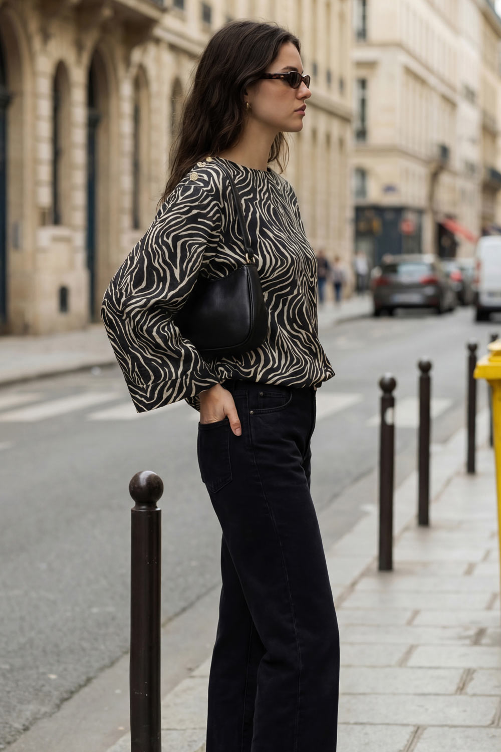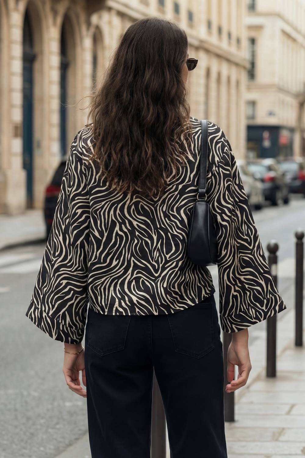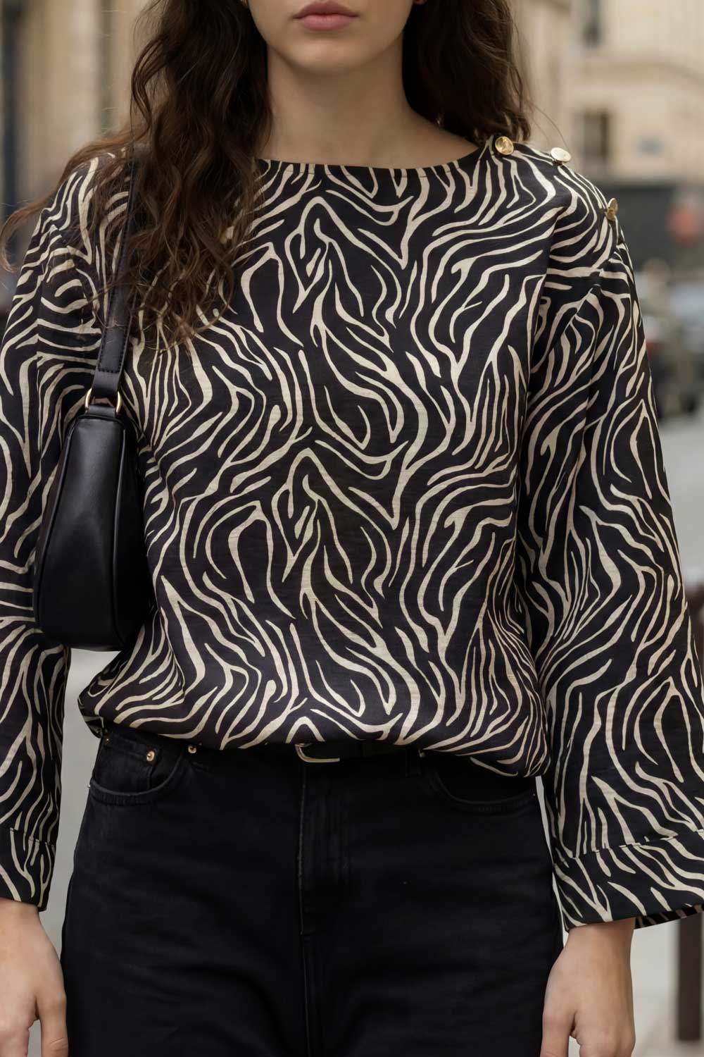 Blusa estampada de fit fluido, manga amplia 3/4, cuello barco y botones decorativos en hombro.