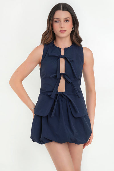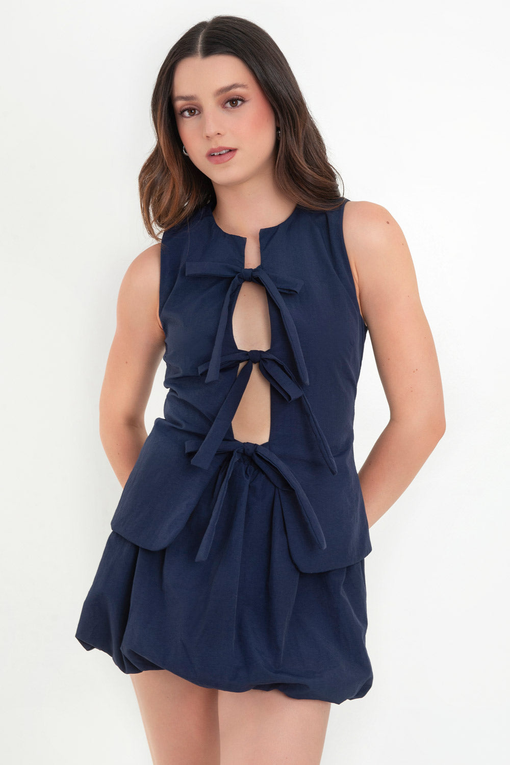 Blusa de fit ajustado, cuello redondo, sin mangas y cierre frontal con lazos amarrables. Detalle de bajo curveado frontal.