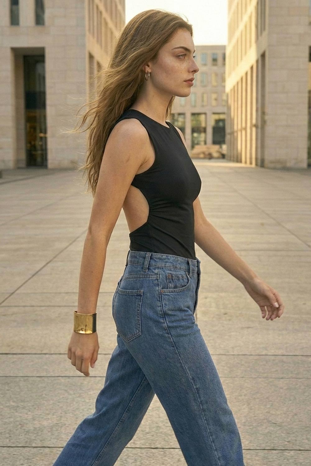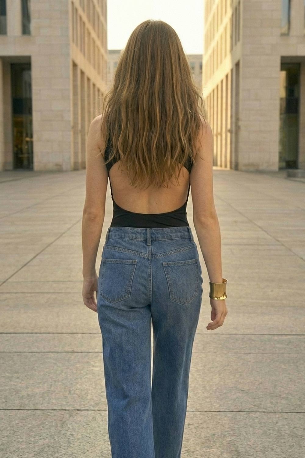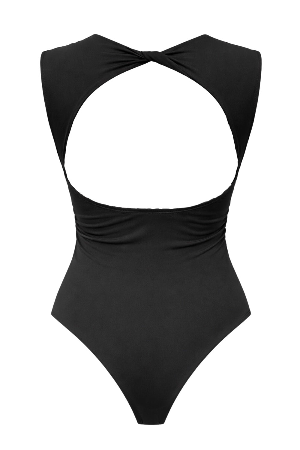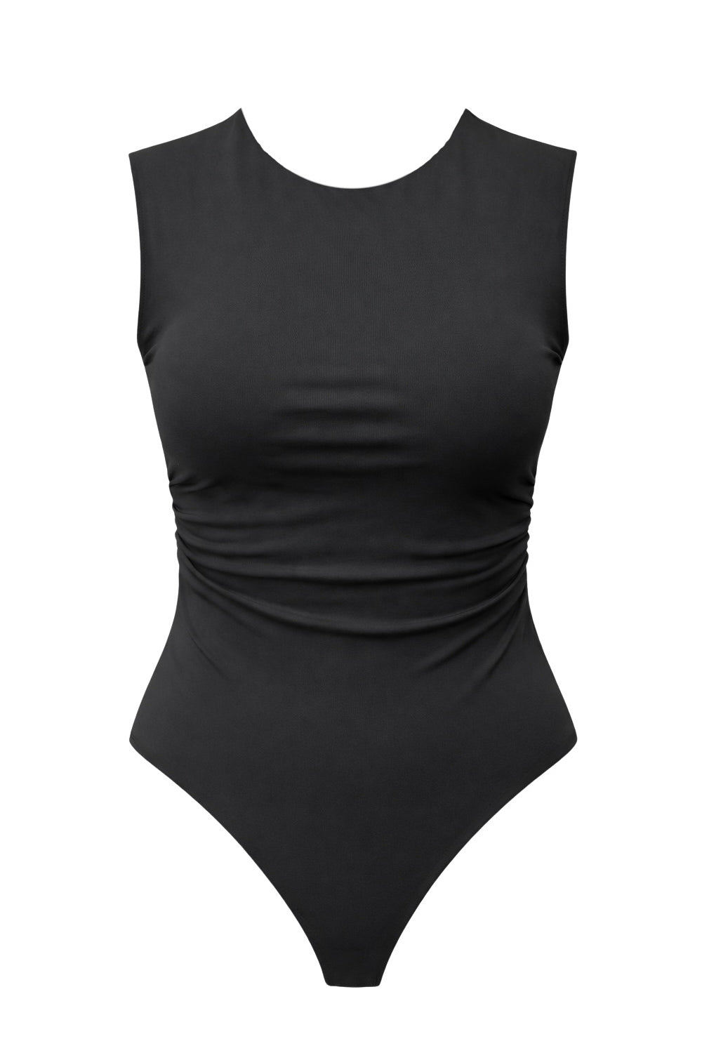 Body de fit ajustado, sin mangas, cuello redondo, plisados en costados y cut out en espalda con nudo decorativo posterior.