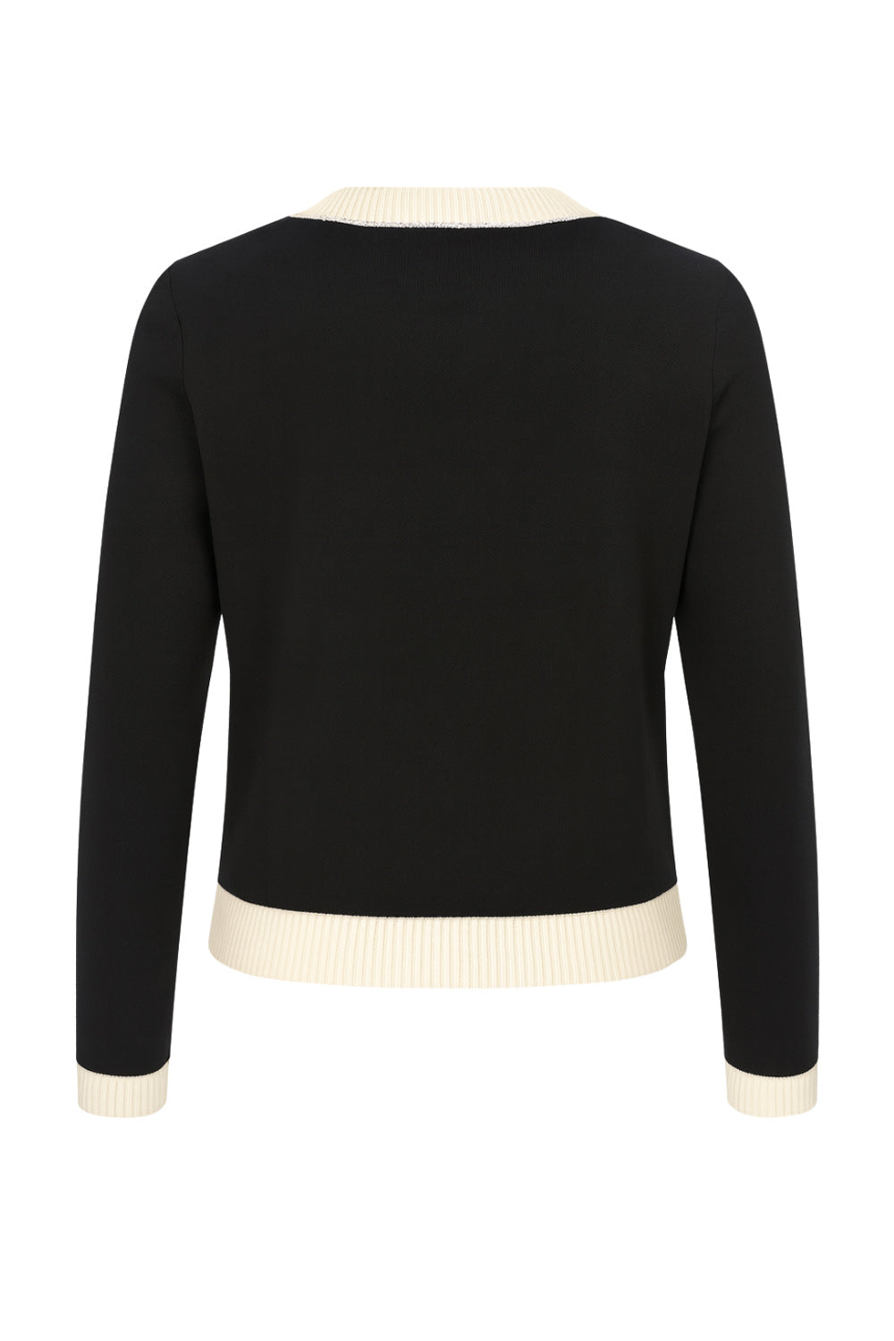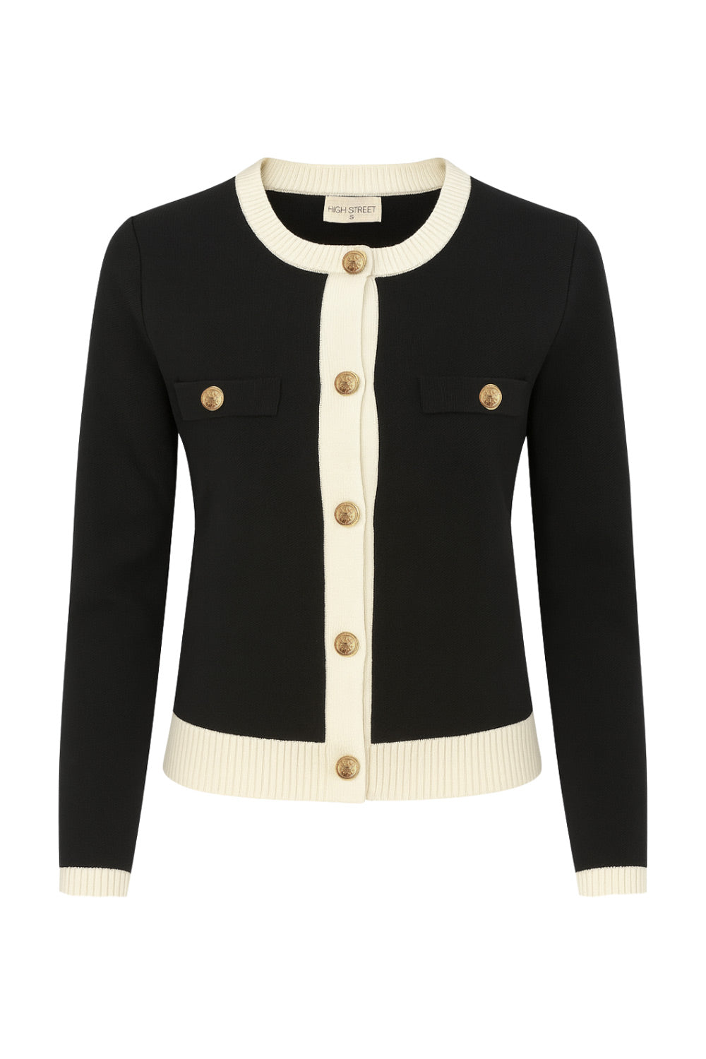 Cardigan de punto, fit recto, manga larga con rib de contraste en puños, bajo y cuello redondo. Cierre frontal con hilera de botones en contraste y bolsillos decorativos frontales.