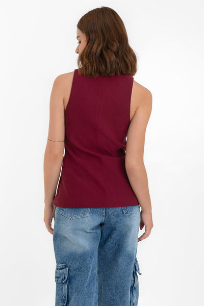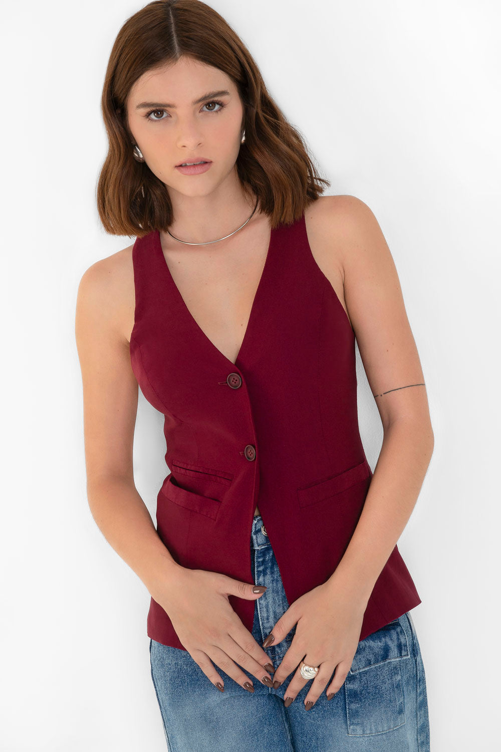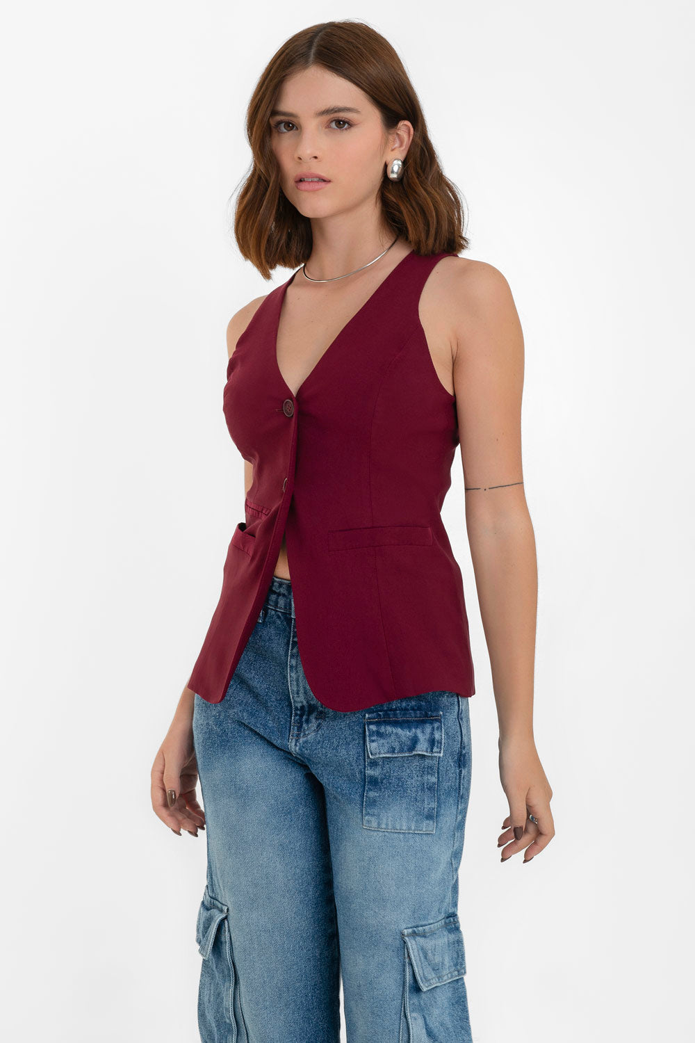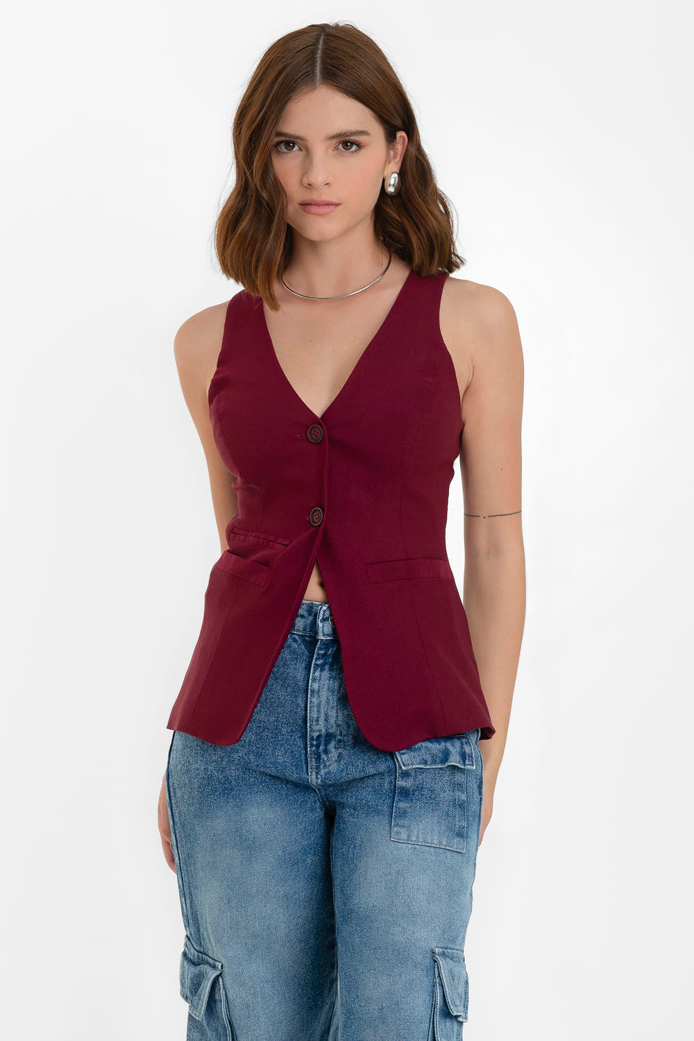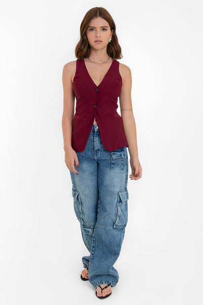 Chaleco de fit ajustado, escote v, bolsillos frontales con vivos decorativos y cierre frontal con botones.