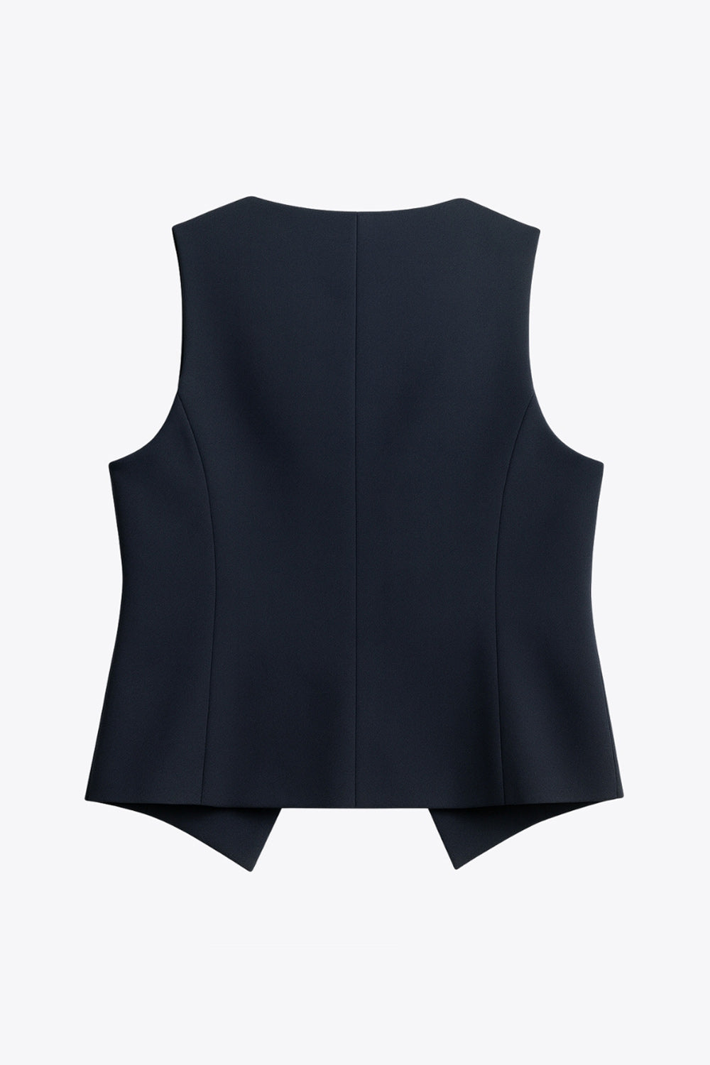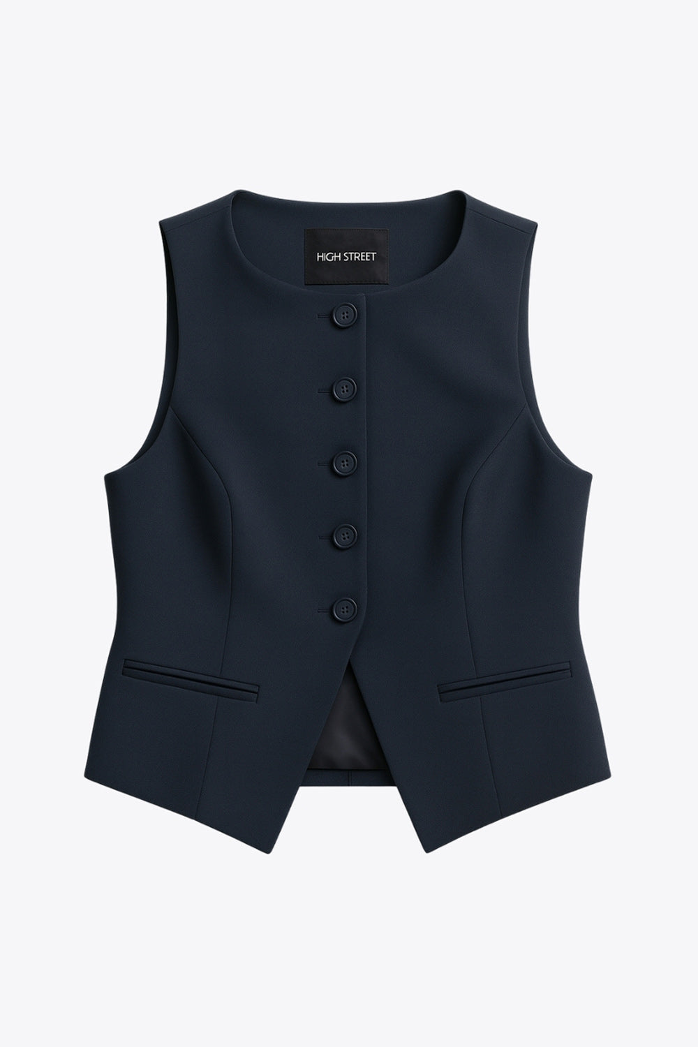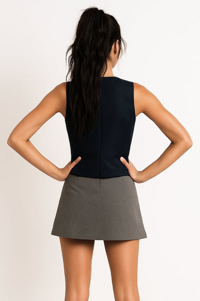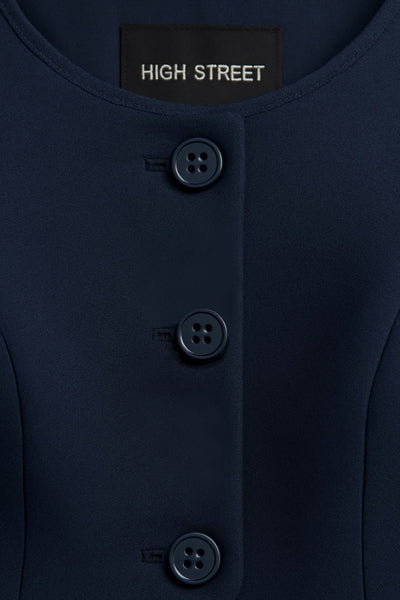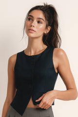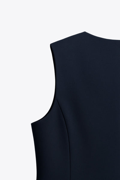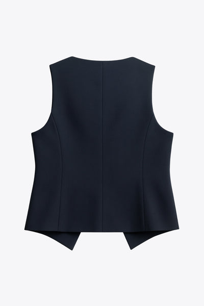 Chaleco corte recto, cuello barco, pinzas frontales, vivos decorativos delanteros y cierre con hilera de botones. Detalle de abertura frontal en bajo.