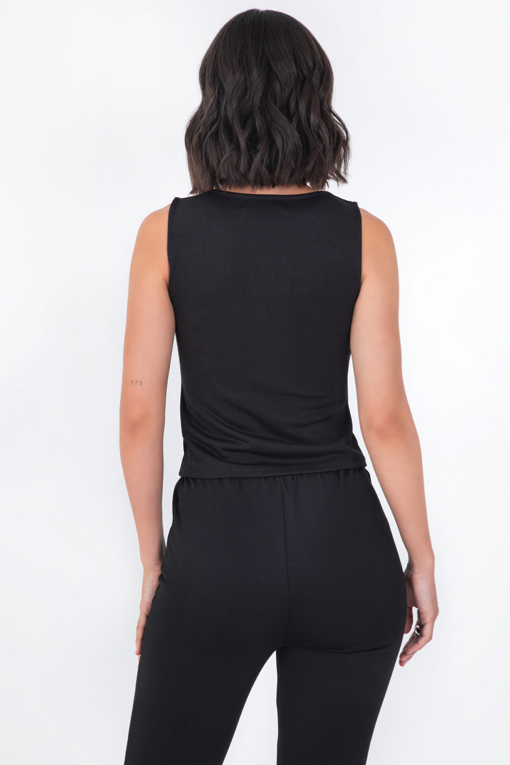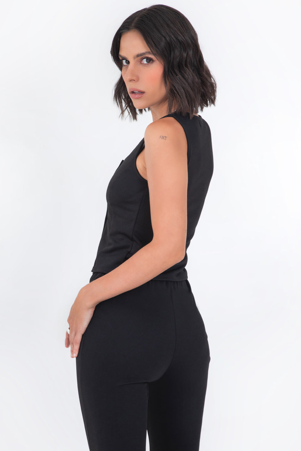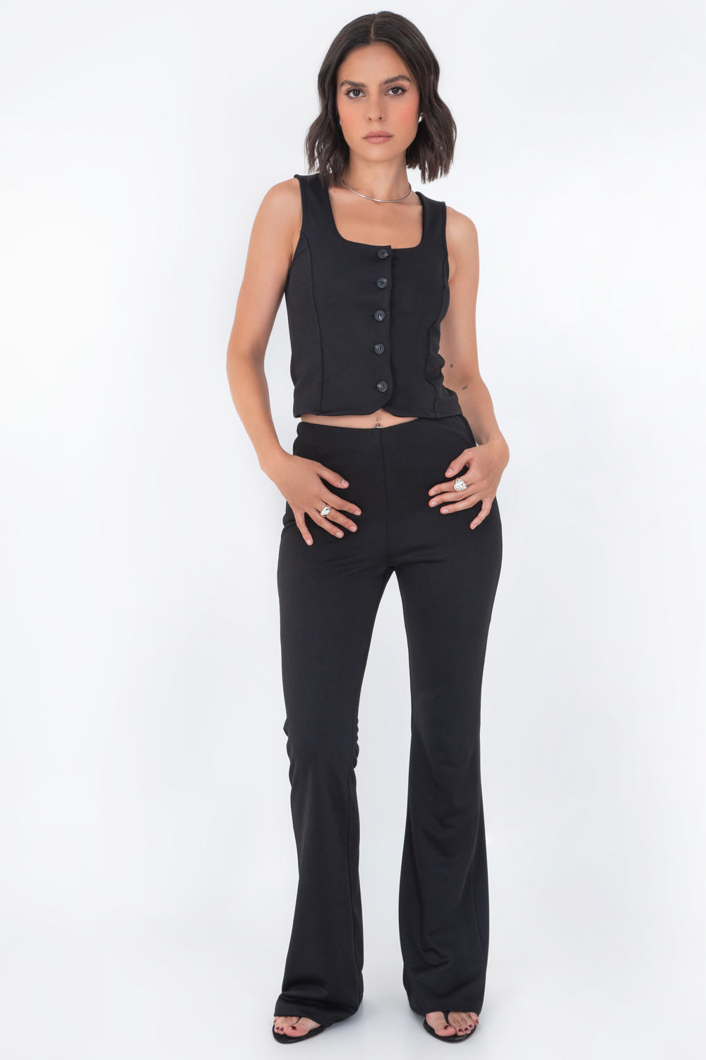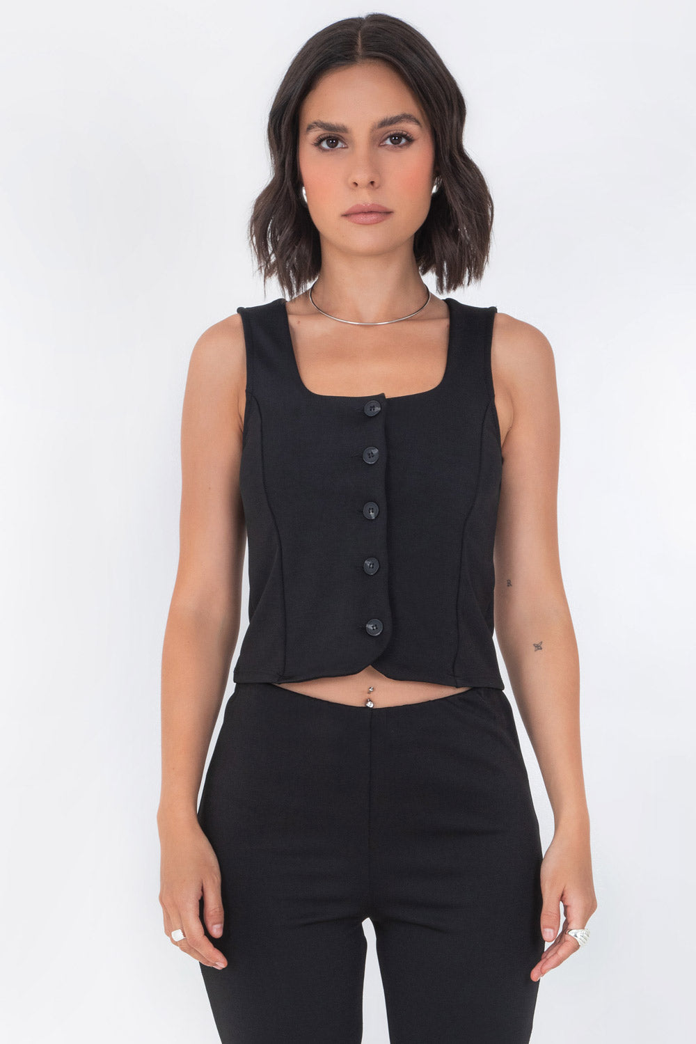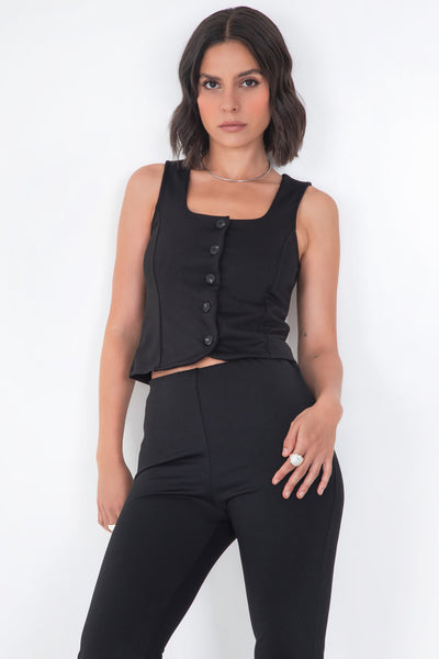 Chaleco corto de fit ajustado, escote cuadrado, pinzas frontales, bajo curveado frontal y cierre con hilera de botones.