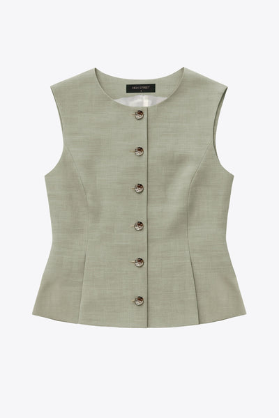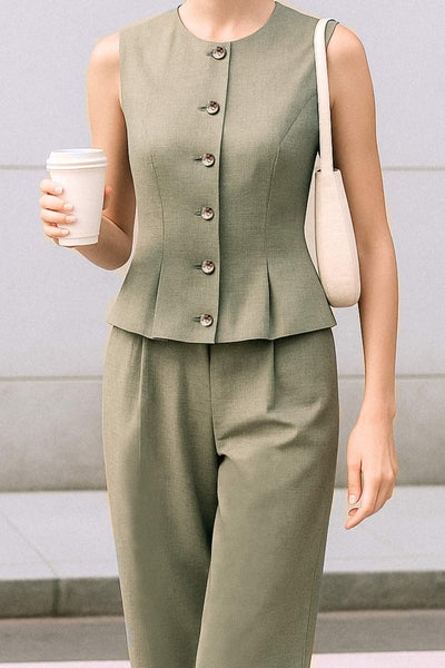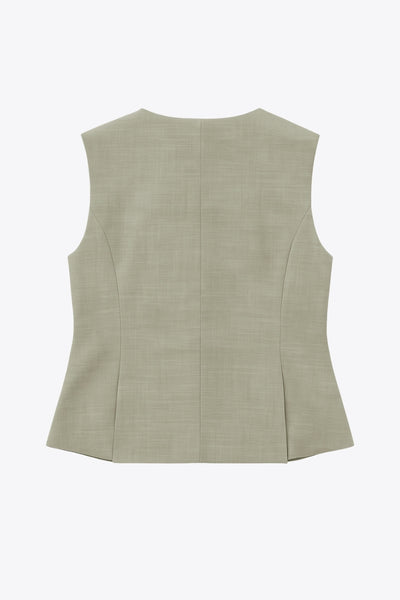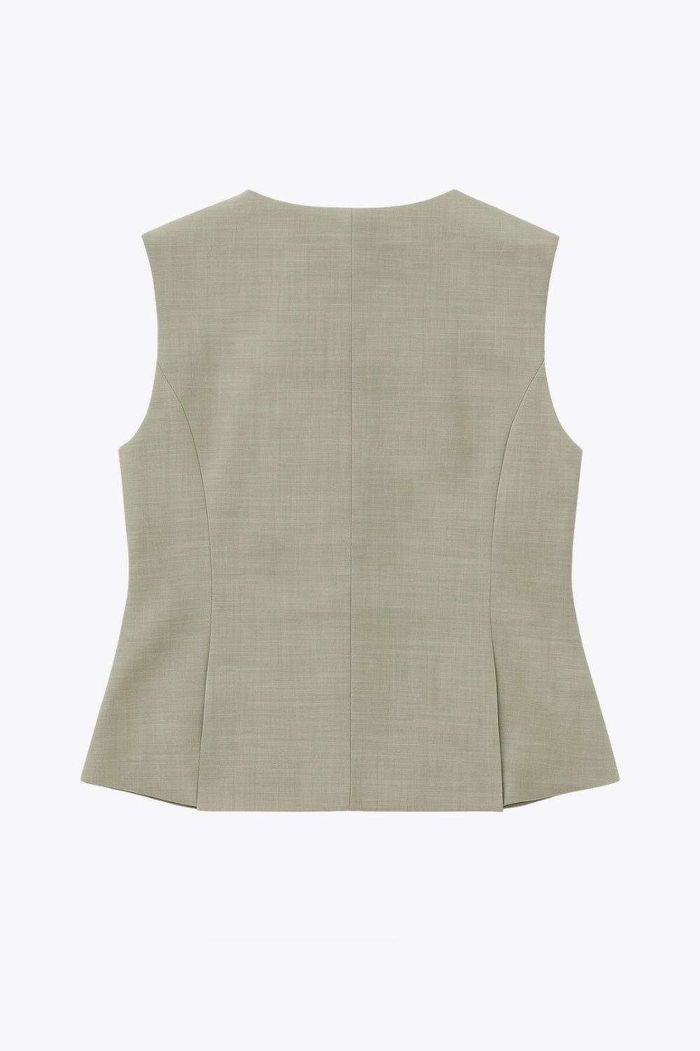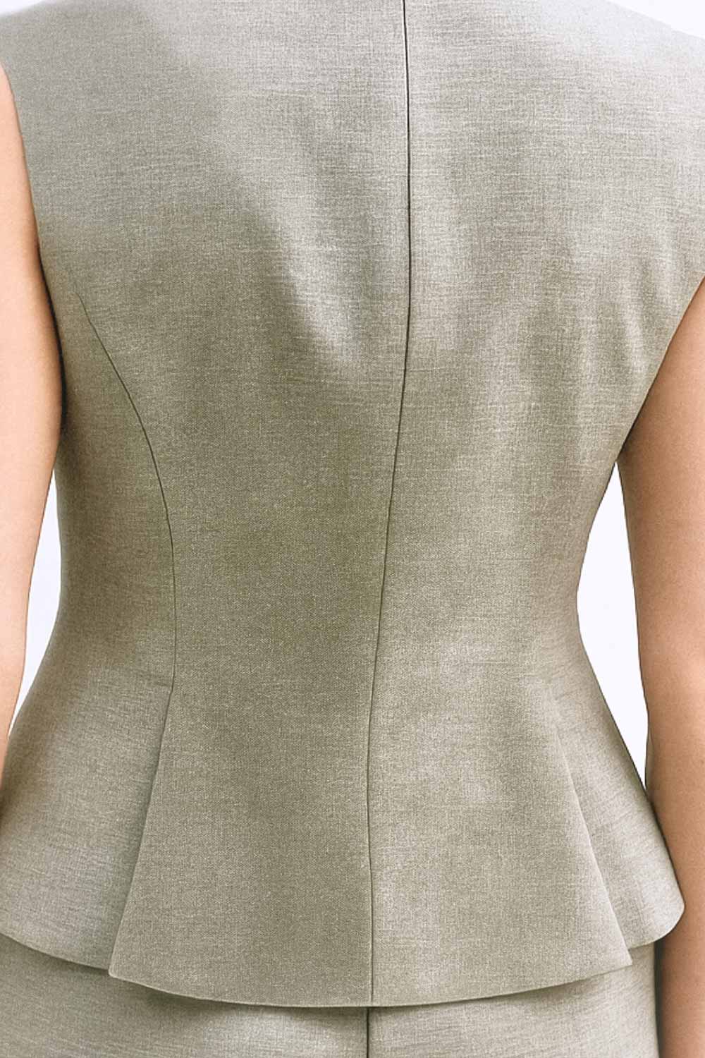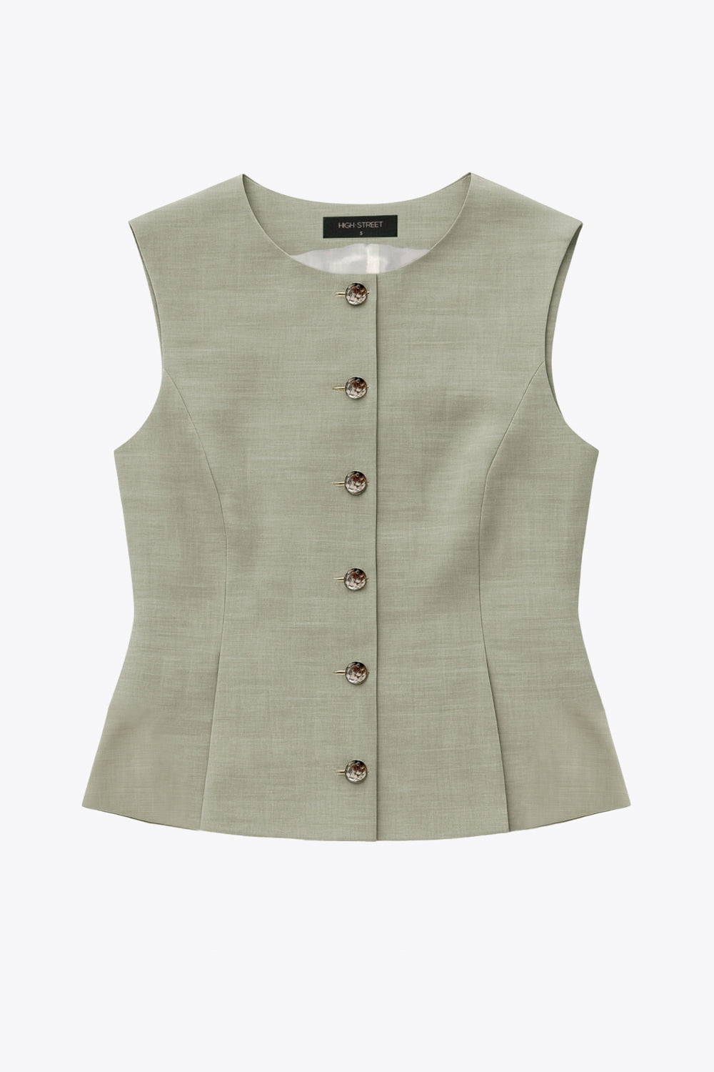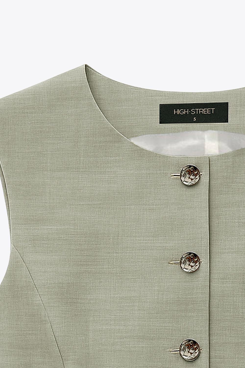 Chaleco ajustado con pinzas, corte en a, cuello redondo, tableado en bajo y cierre con hilera de botones.