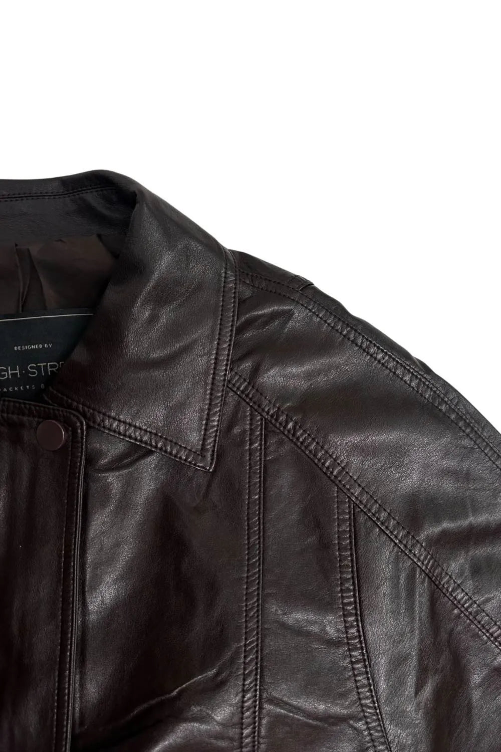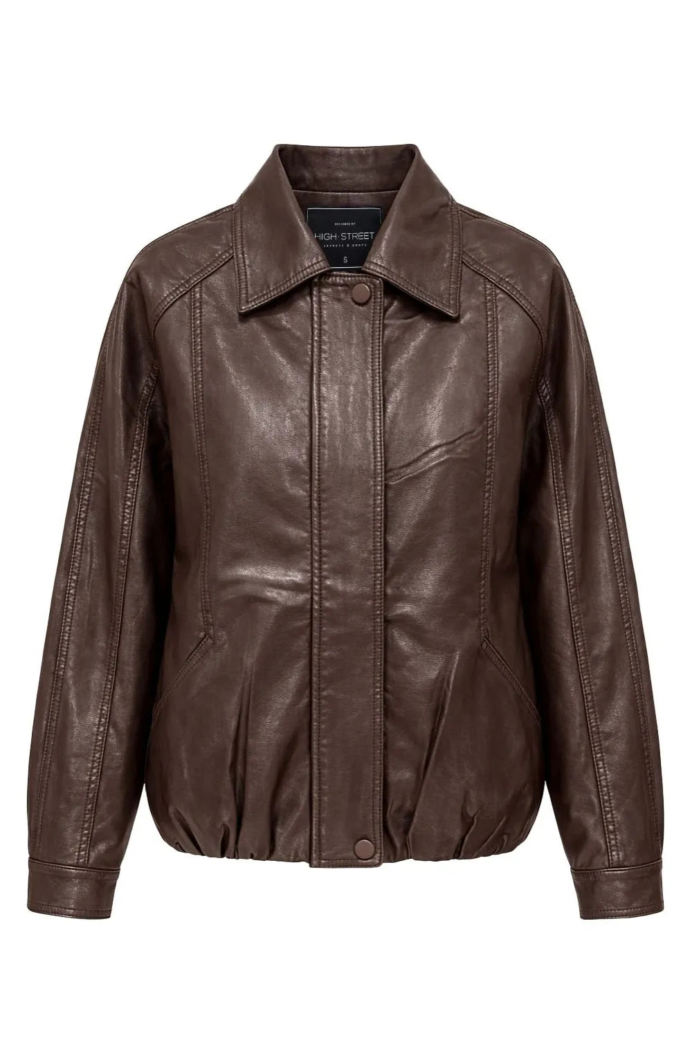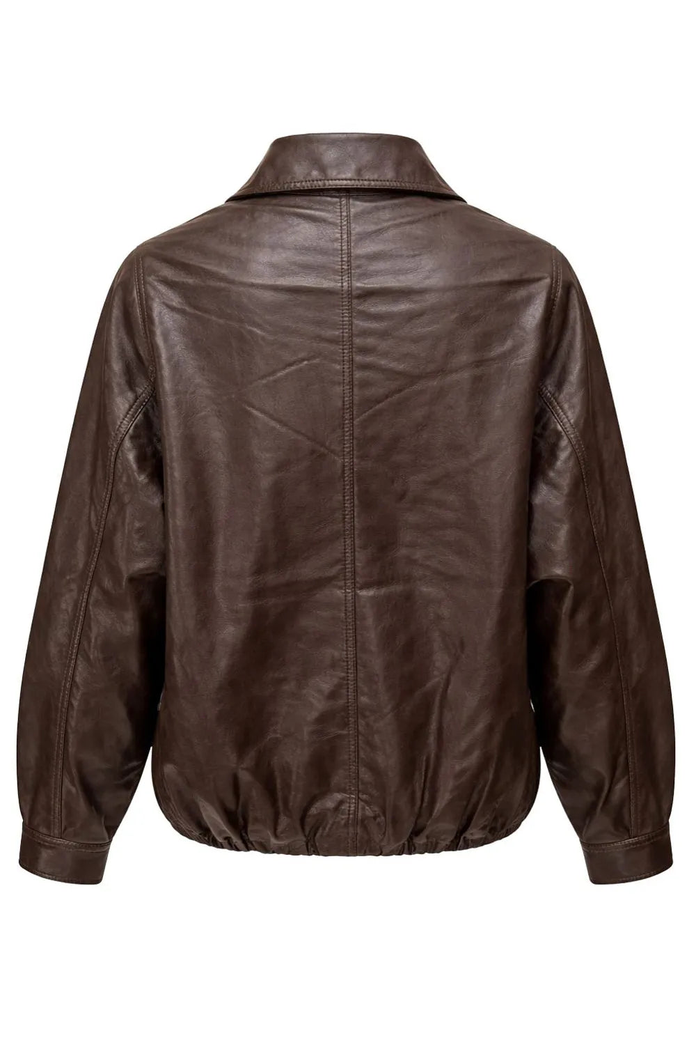 Chamarra de efecto piel, fit oversized, manga larga con puño abotonado, cuello solapa, bolsillos delanteros con vivos, costuras decorativas y elástico con plisados en bajo. Cierre frontal con cremallera oculta y botón.
