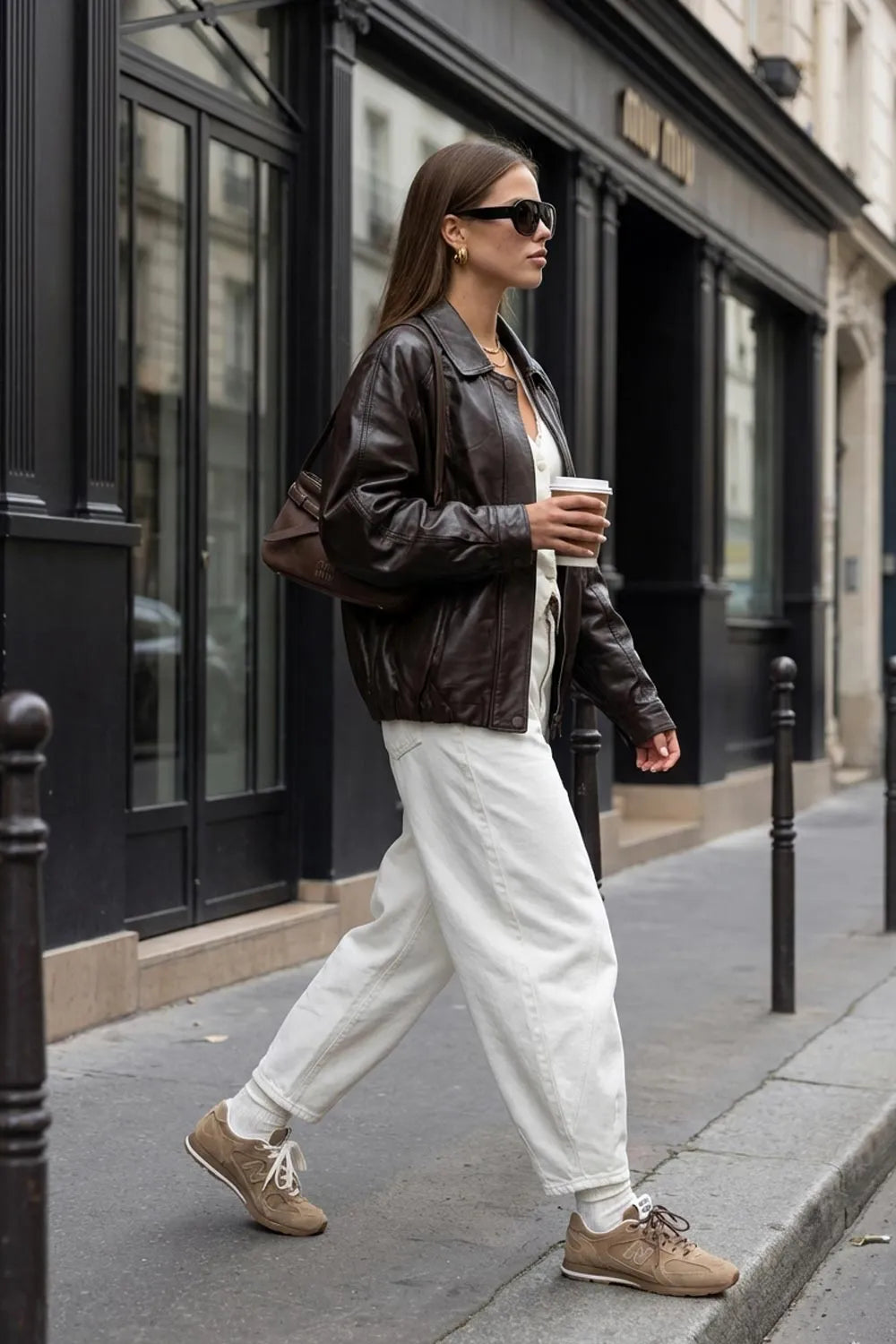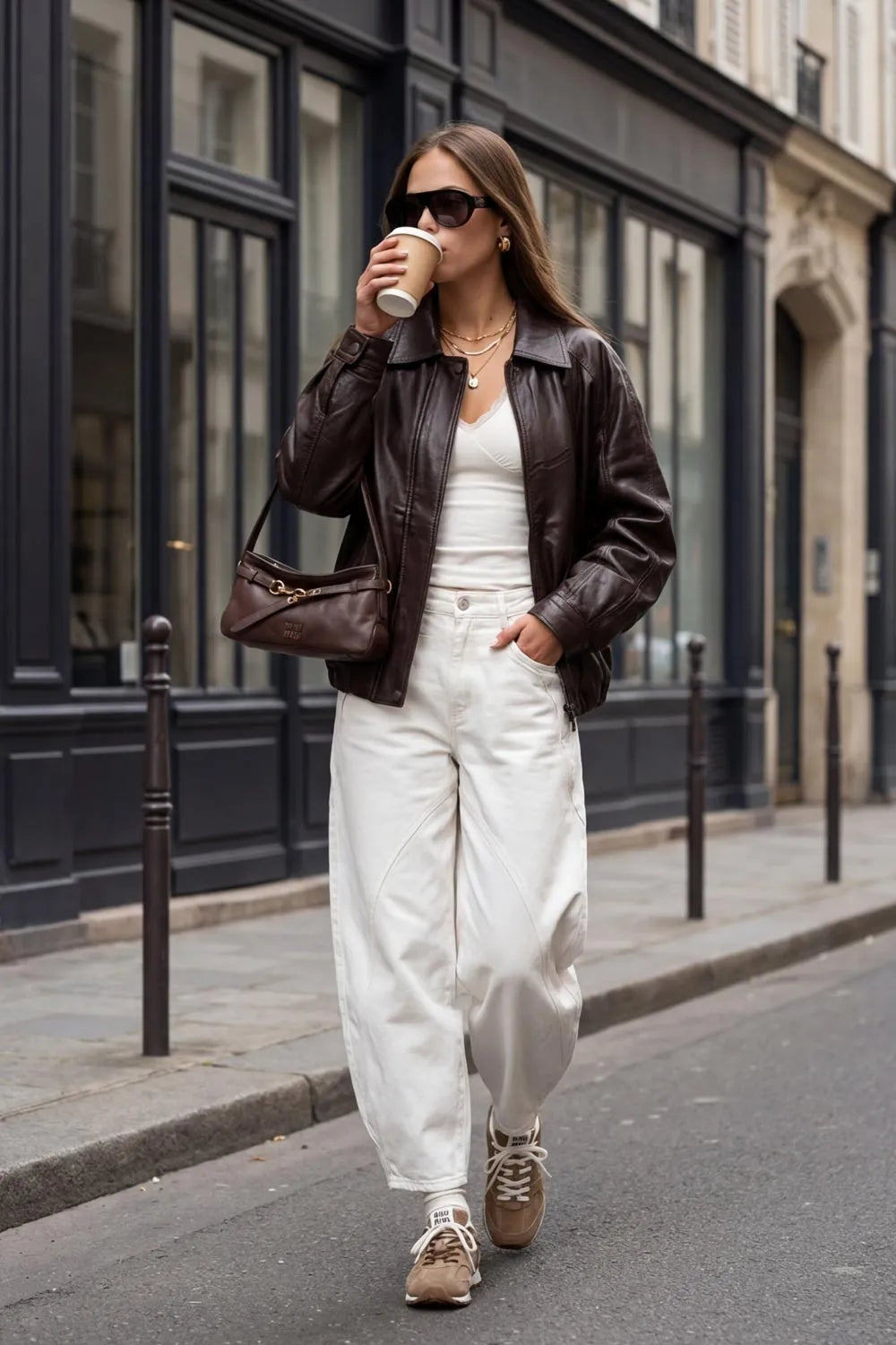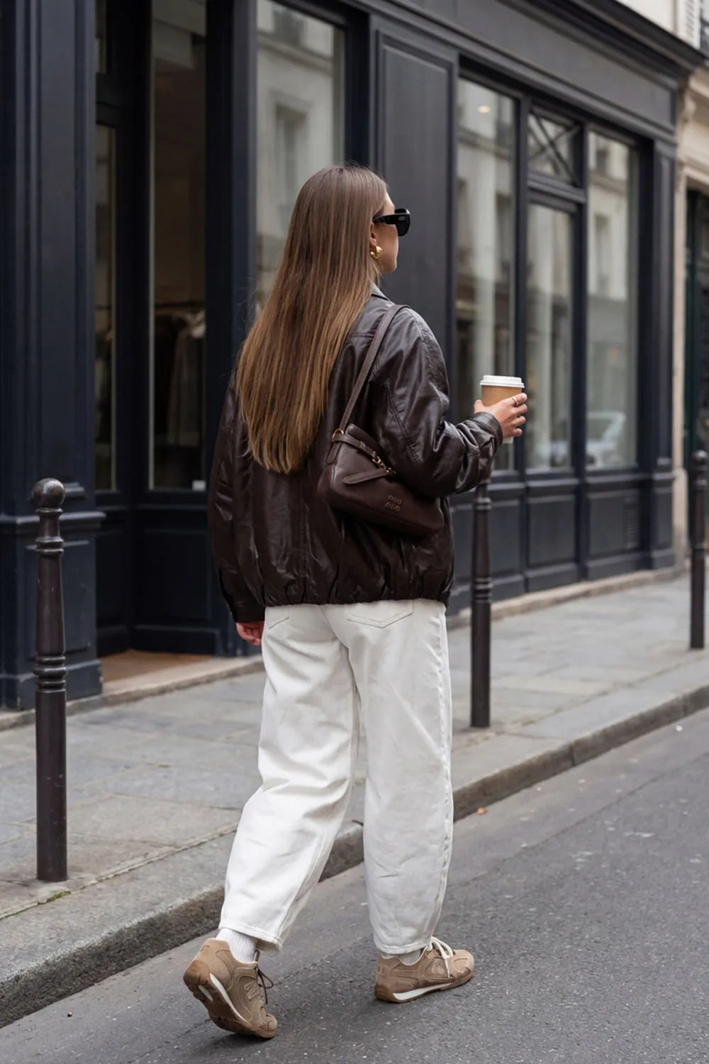Chamarra de efecto piel, fit oversized, manga larga con puño abotonado, cuello solapa, bolsillos delanteros con vivos, costuras decorativas y elástico con plisados en bajo. Cierre frontal con cremallera oculta y botón.