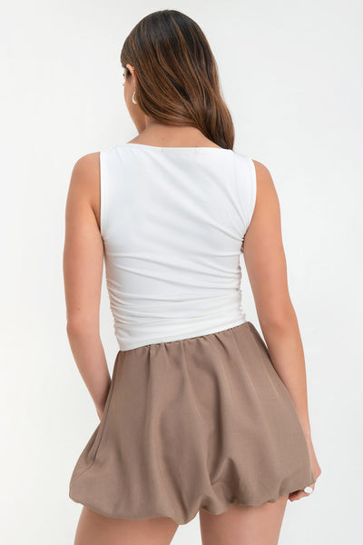 Falda corta globo de cintura alta elástica, pliegues en cintura y bajo con acabado en volumen.