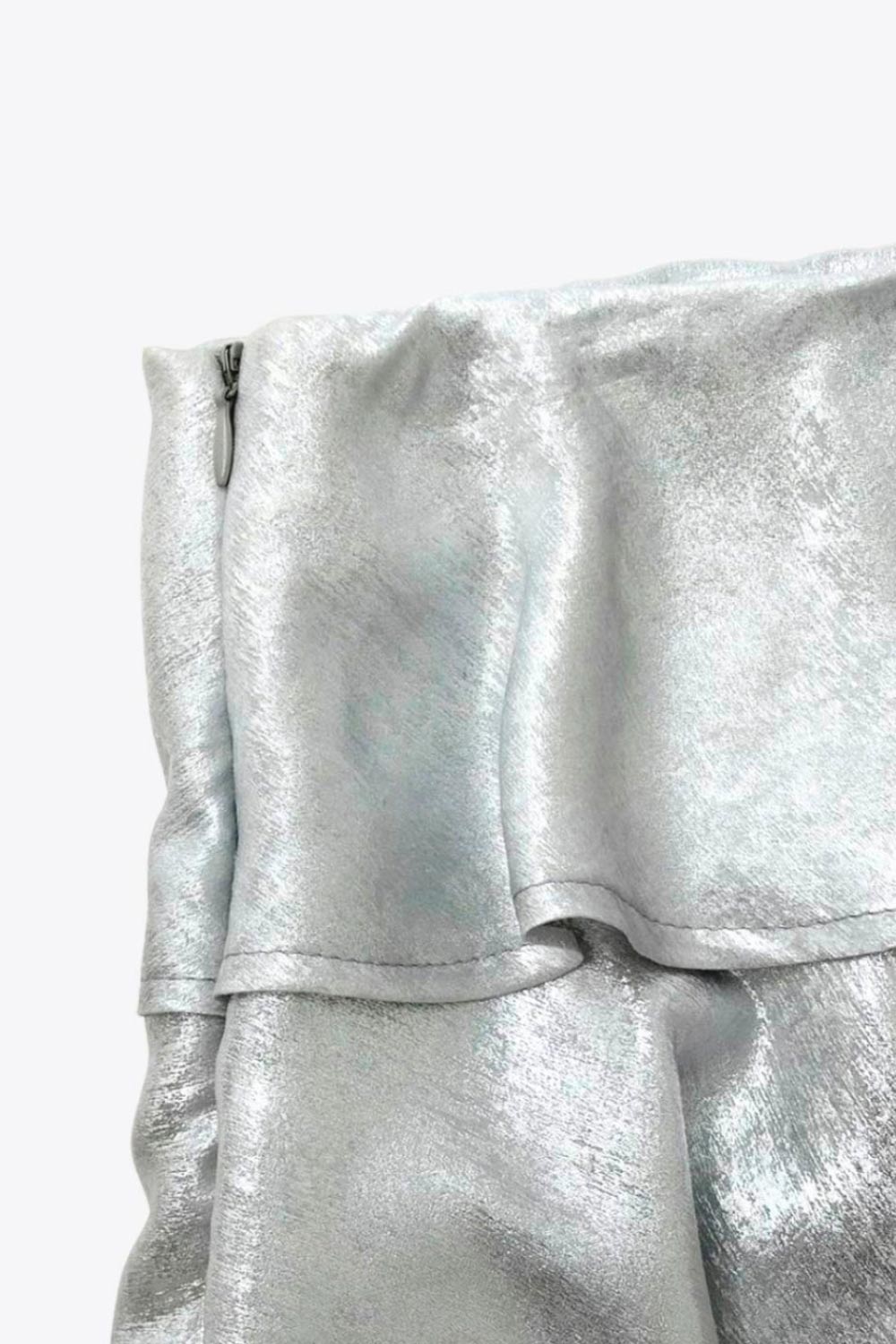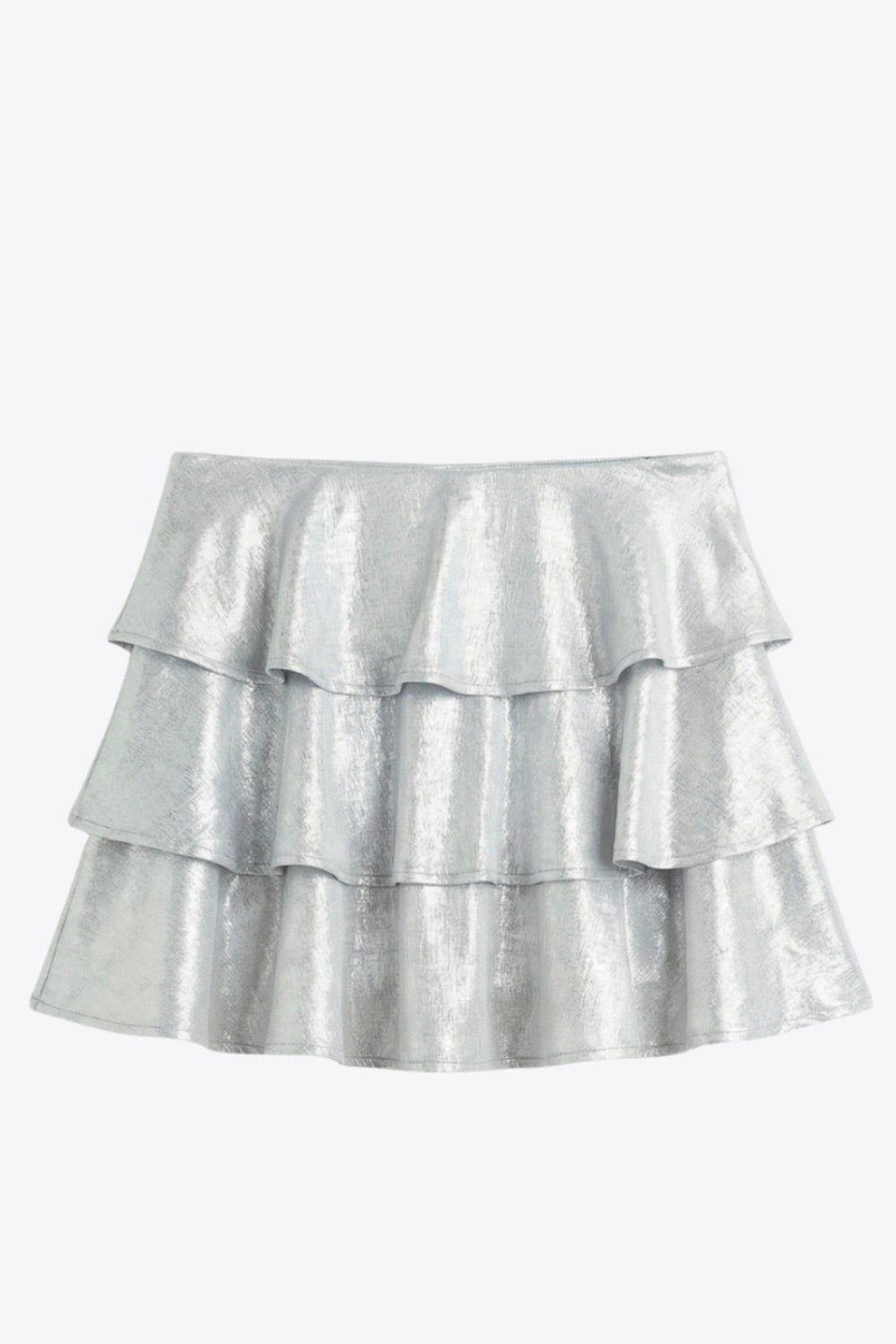 Falda short corto de cintura alta, corte en a y bajo con capas de olanes. Cierre lateral con cremallera oculta.