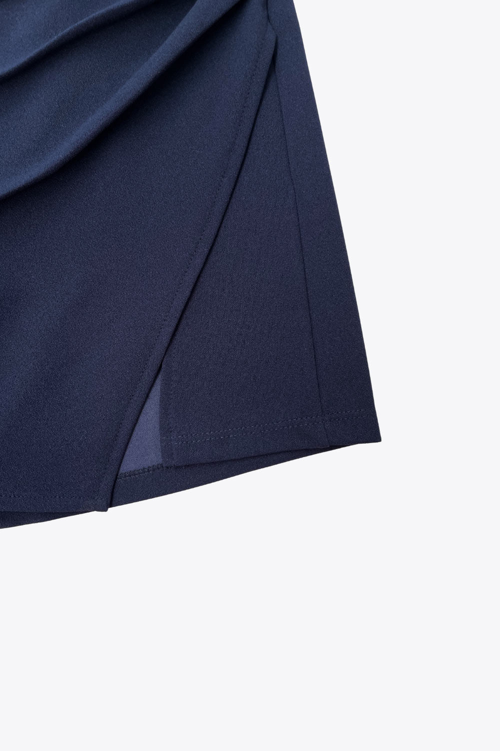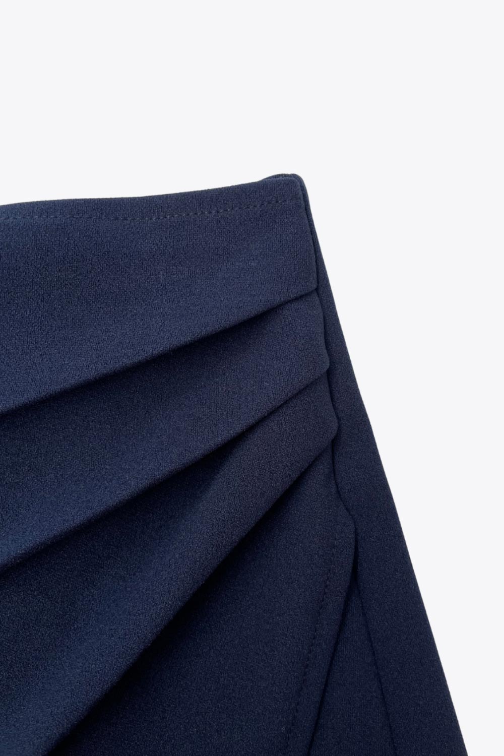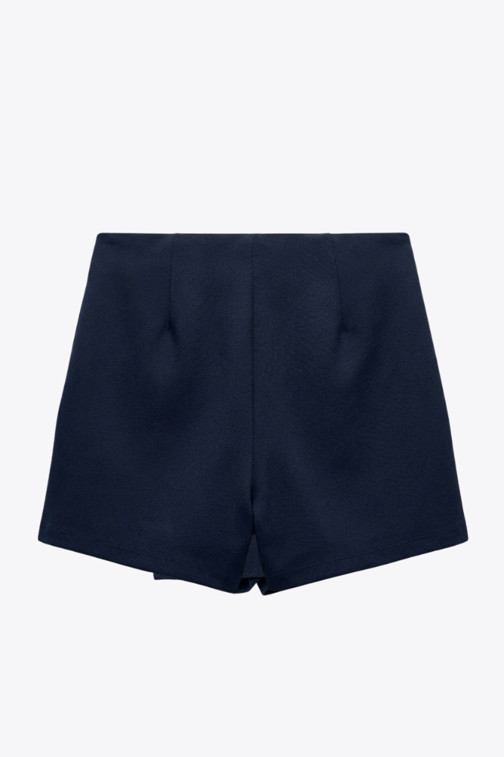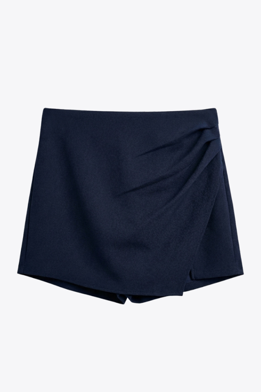 Falda short de corte en a, cintura alta, plisado lateral con bajo curveado, abertura frontal y cierre lateral con cremallera oculta.