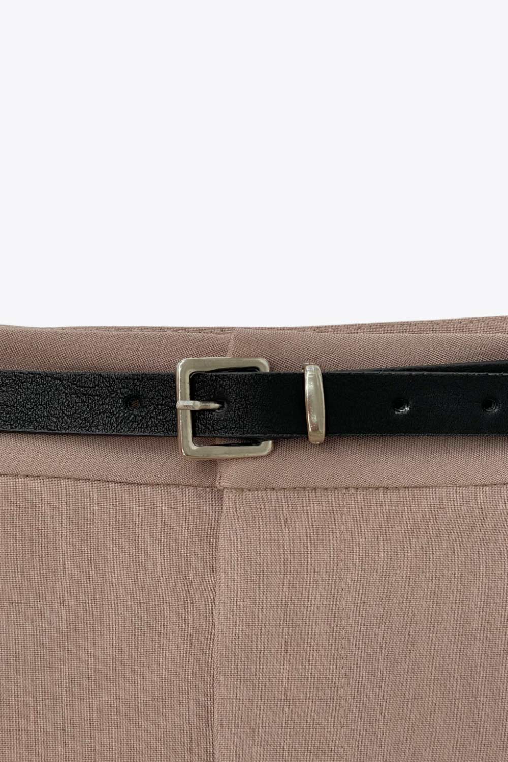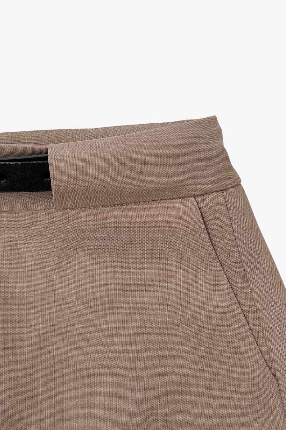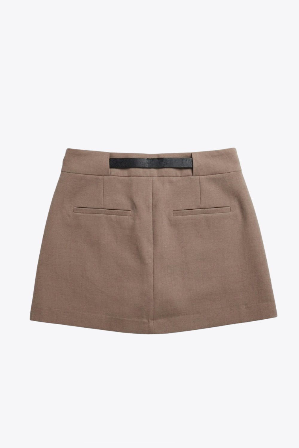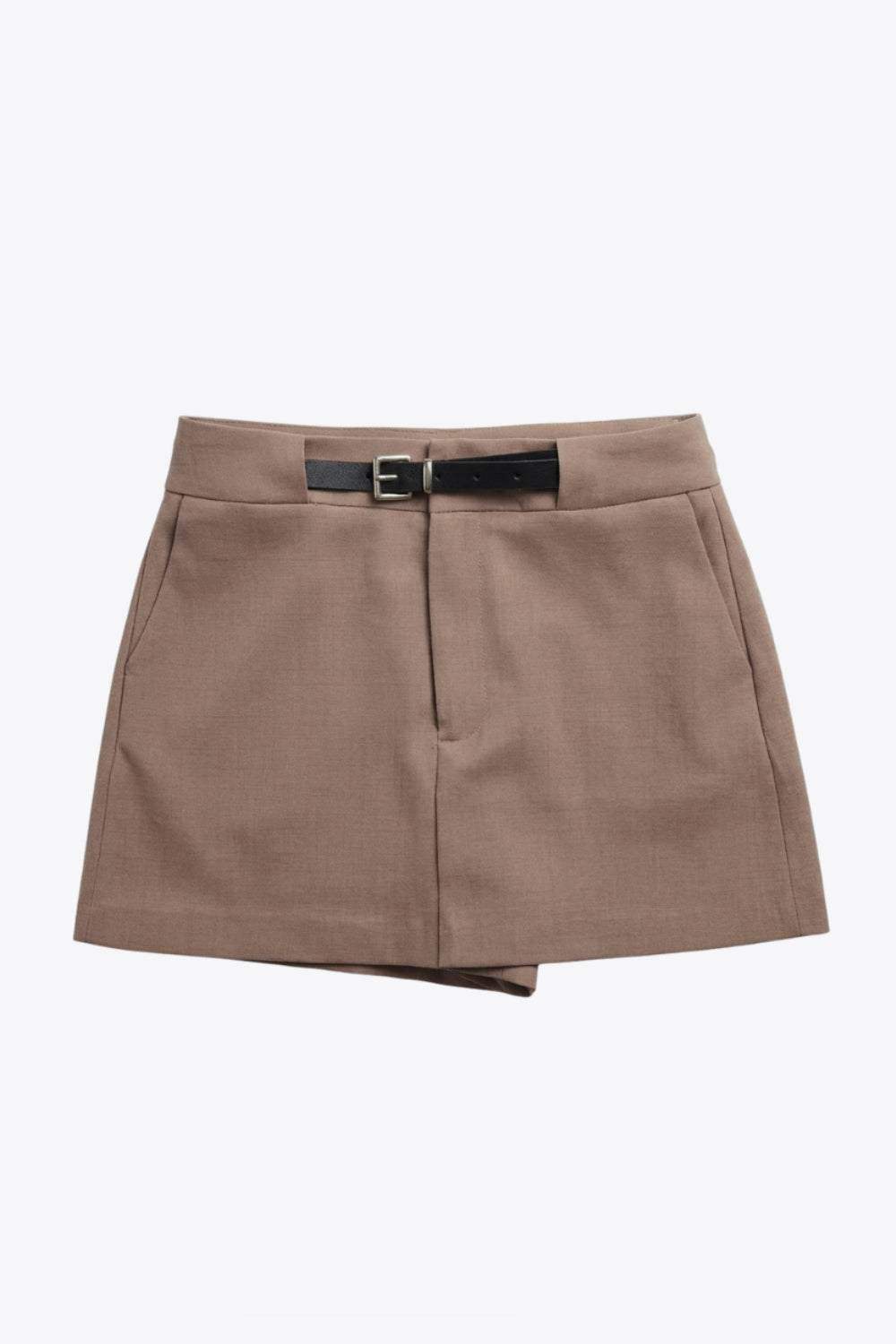 Falda short corto de fit recto, cintura alta con pretina y trabillas, vivos decorativos posteriores, cierre frontal con broche y cremallera ocultos. Detalle de cinturón en contraste con hebilla.