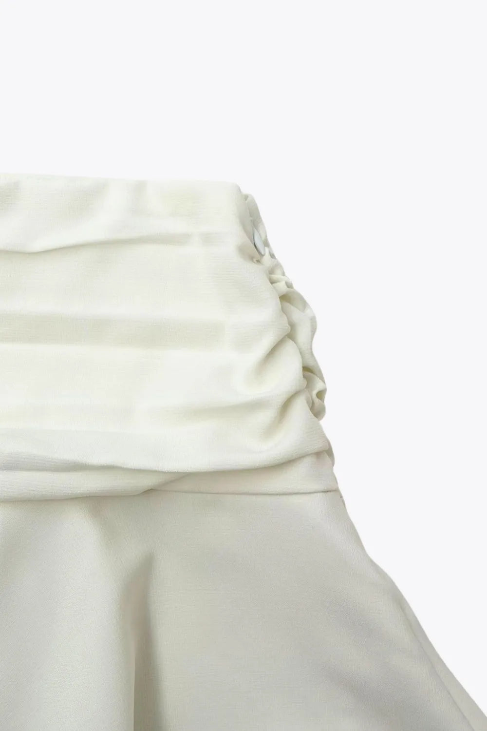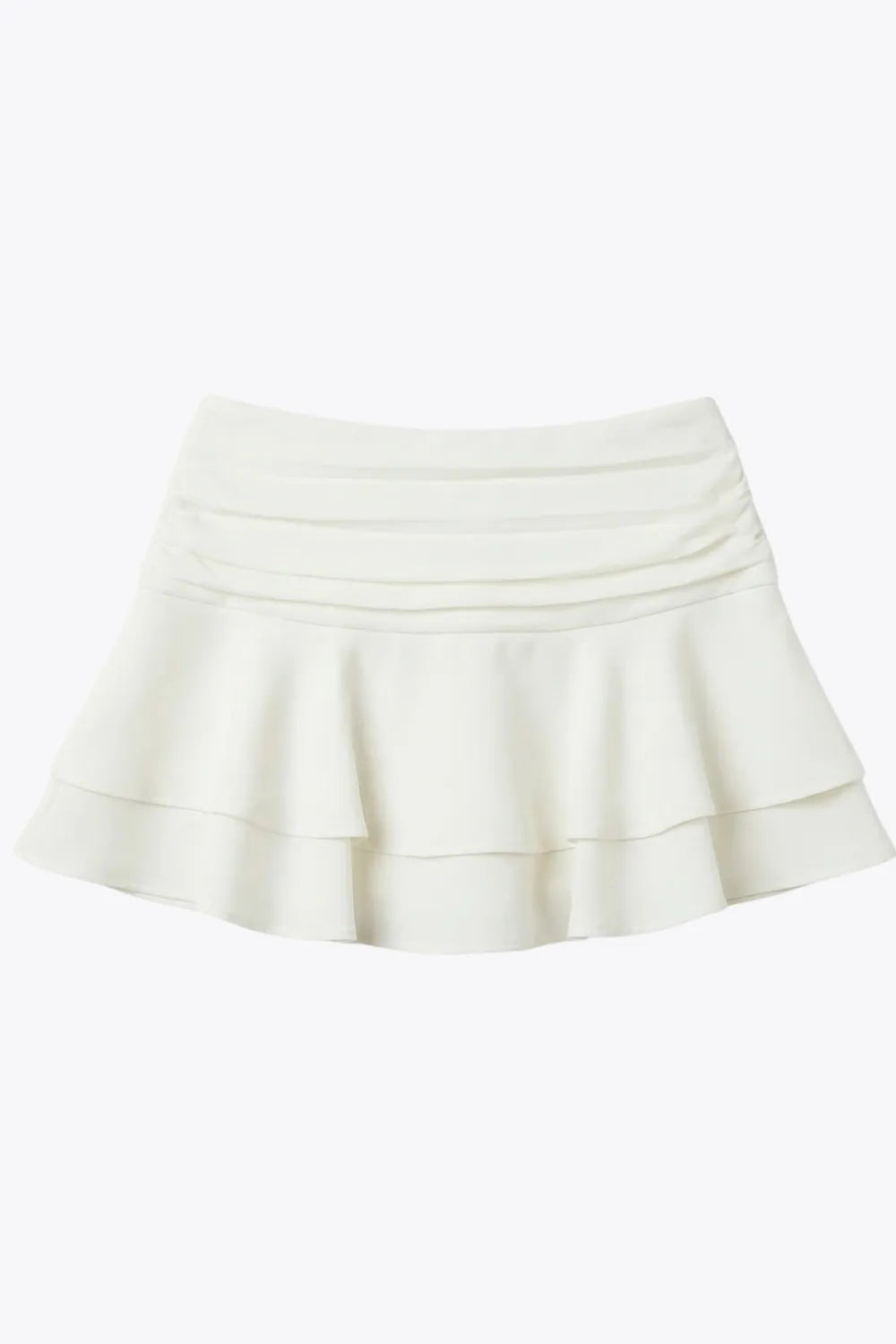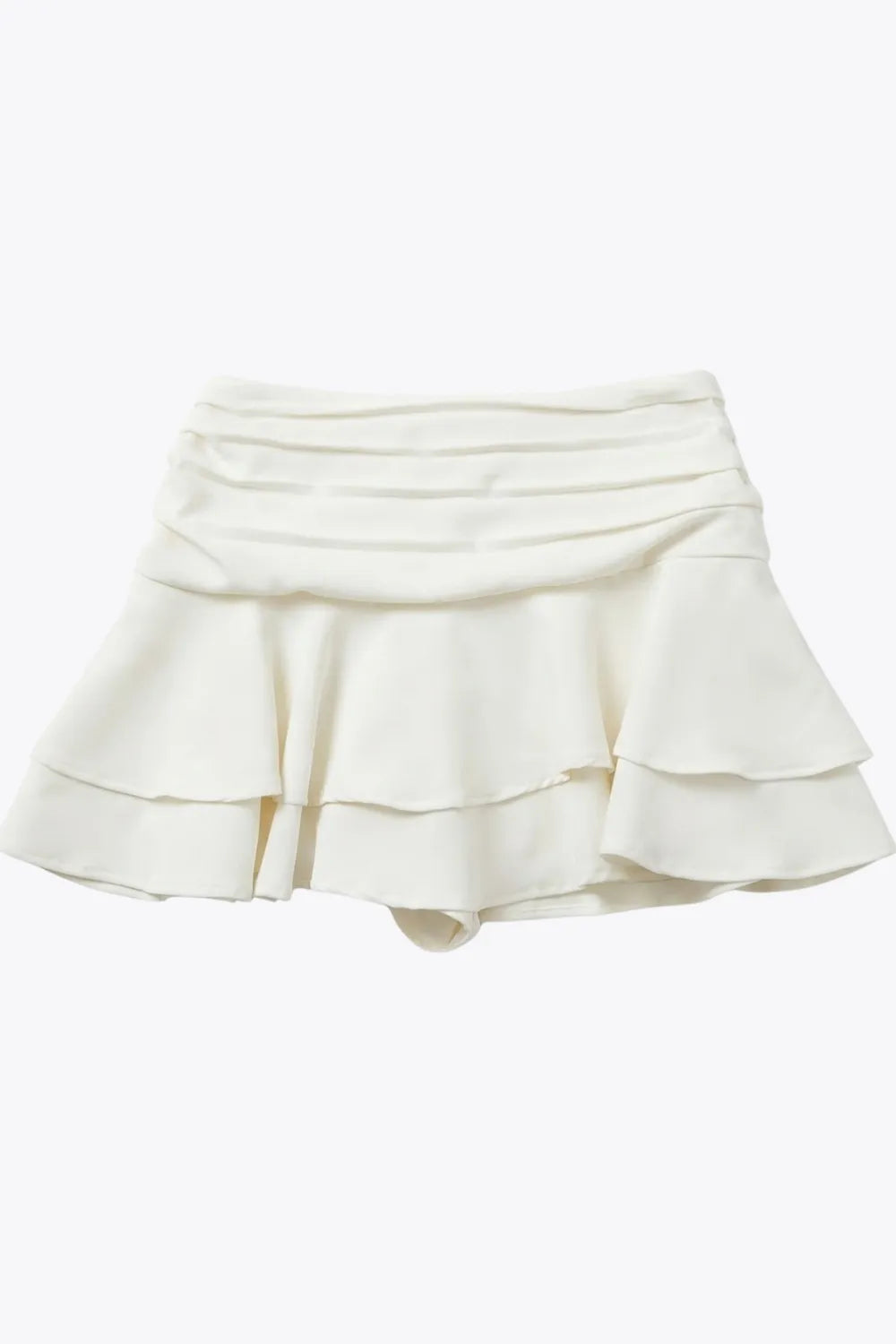Falda short corto de cintura alta con pretina con plisados decorativos laterales, corte en a y bajo con capas de olanes. Cierre lateral con cremallera oculta.