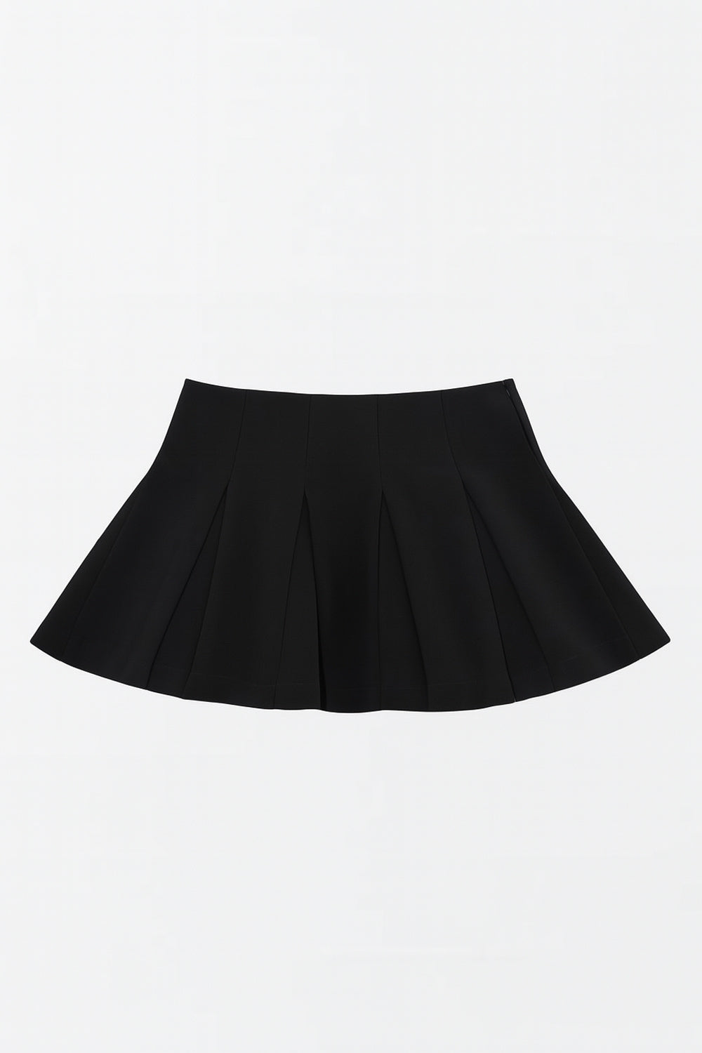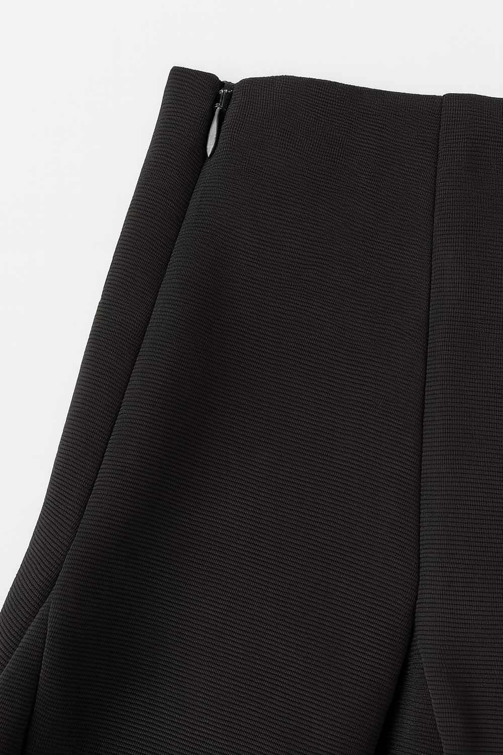 Falsa short corto de cintura alta, con pinzas y tableado en bajo. Cierre lateral con cremallera oculta.
