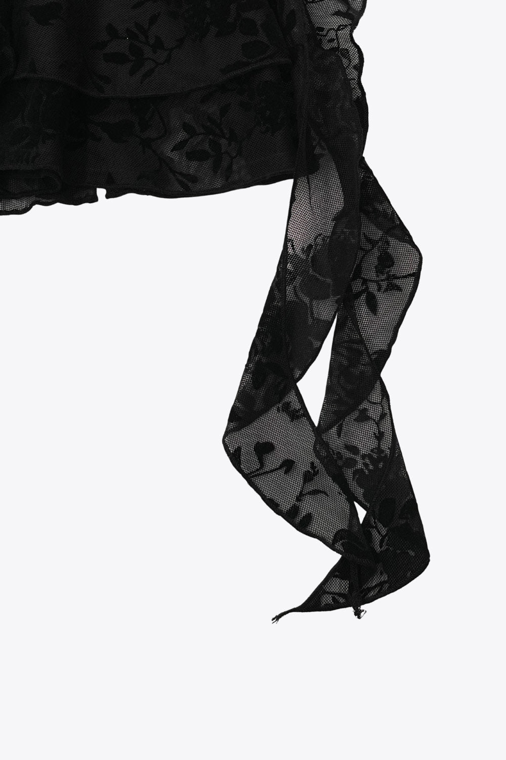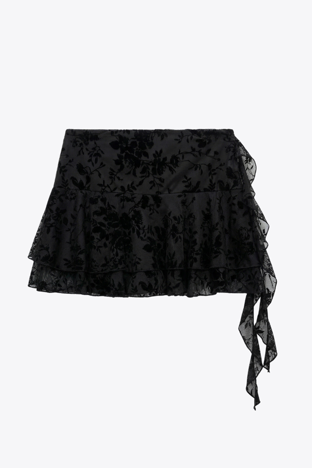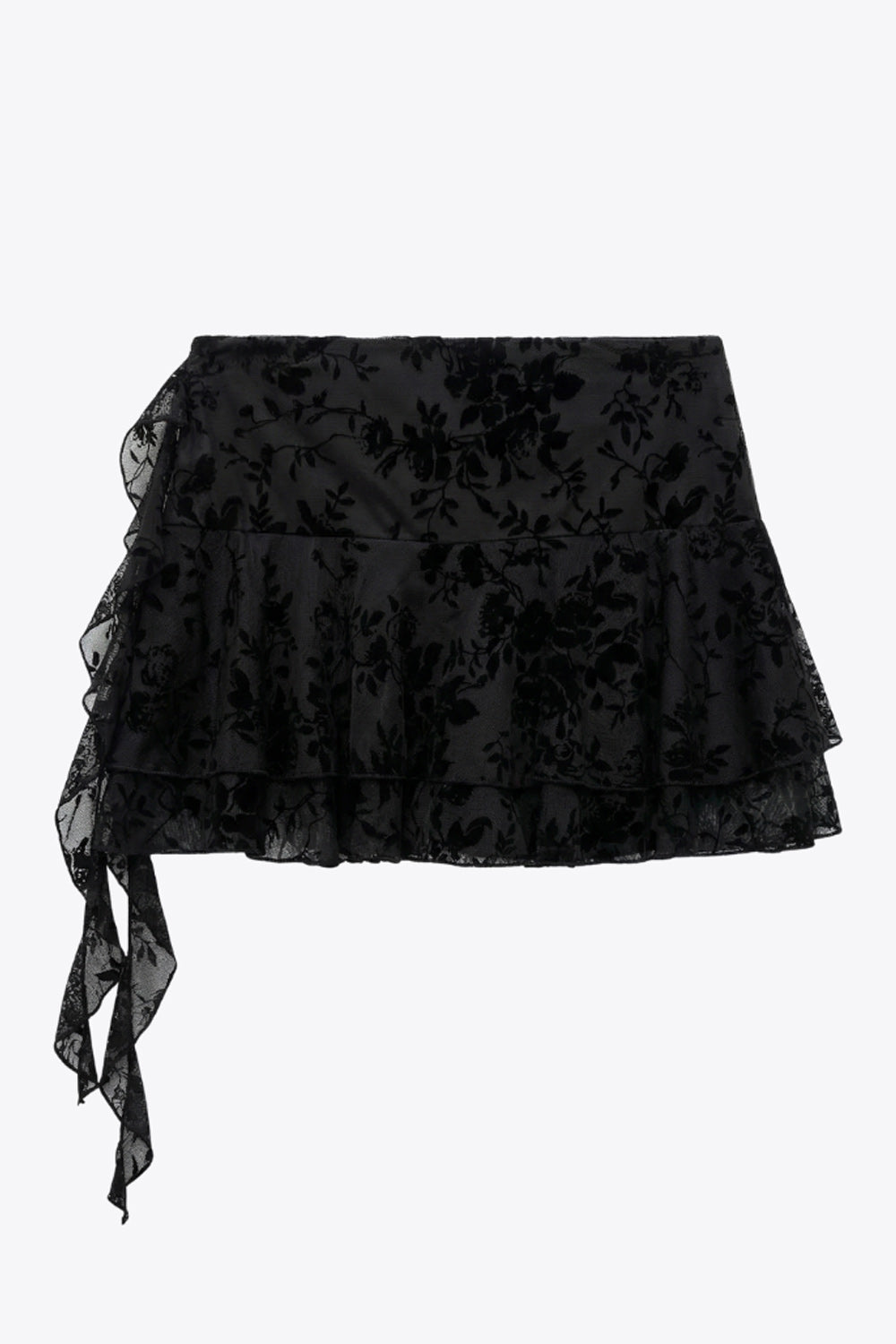 Falda short corto de mesh con estampado floral, cintura alta, corte en a, pretina ancha, bajo con capas de olanes y detalle decorativo. Cierre lateral con cremallera oculta.
