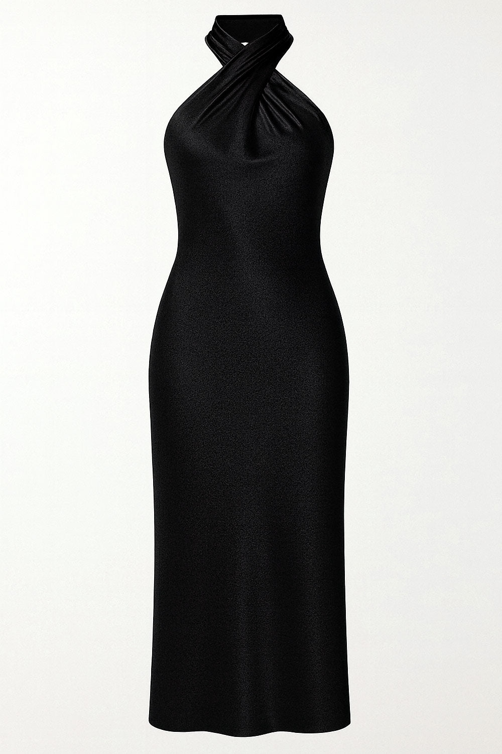 Maxi vestido satinado de fit recto, cuello halter cruzado con lazo amarrable posterior, escote en espalda y cierre posterior con cremallera oculta. Detalle de abertura lateral en bajo.