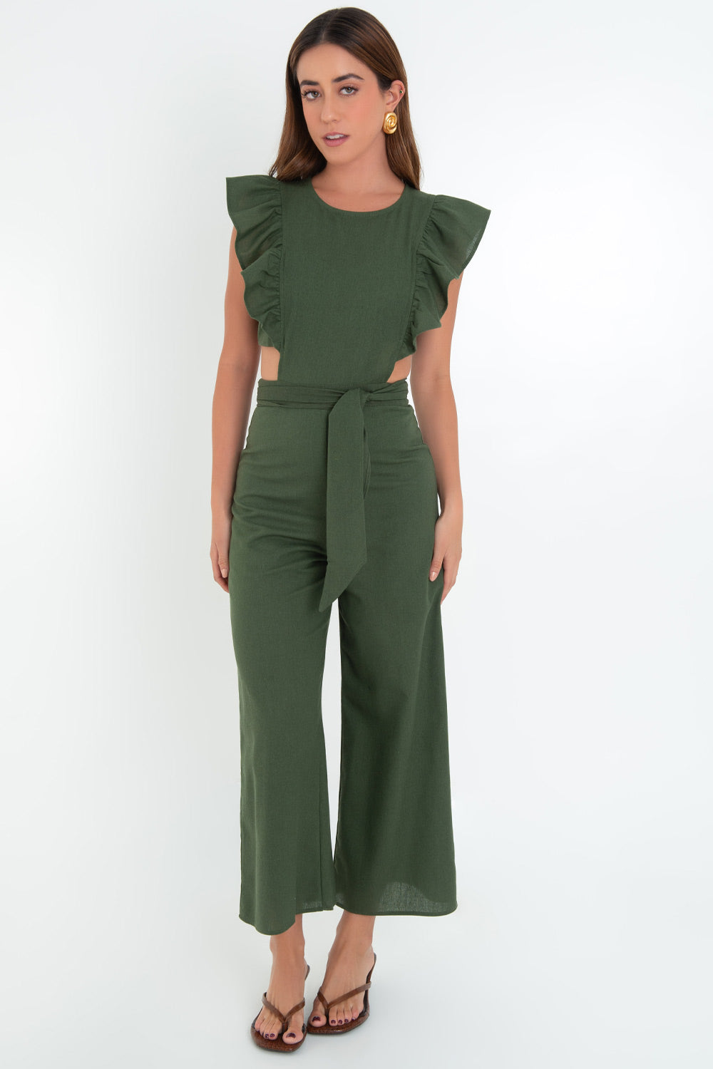 Palazzo de fit culotte, cintura con cut-out en costado, cuello redondo, sin mangas, detalle de olanes en hombros, lazo posterior amarrable en cintura y cierre posterior con cremallera visible en contraste.