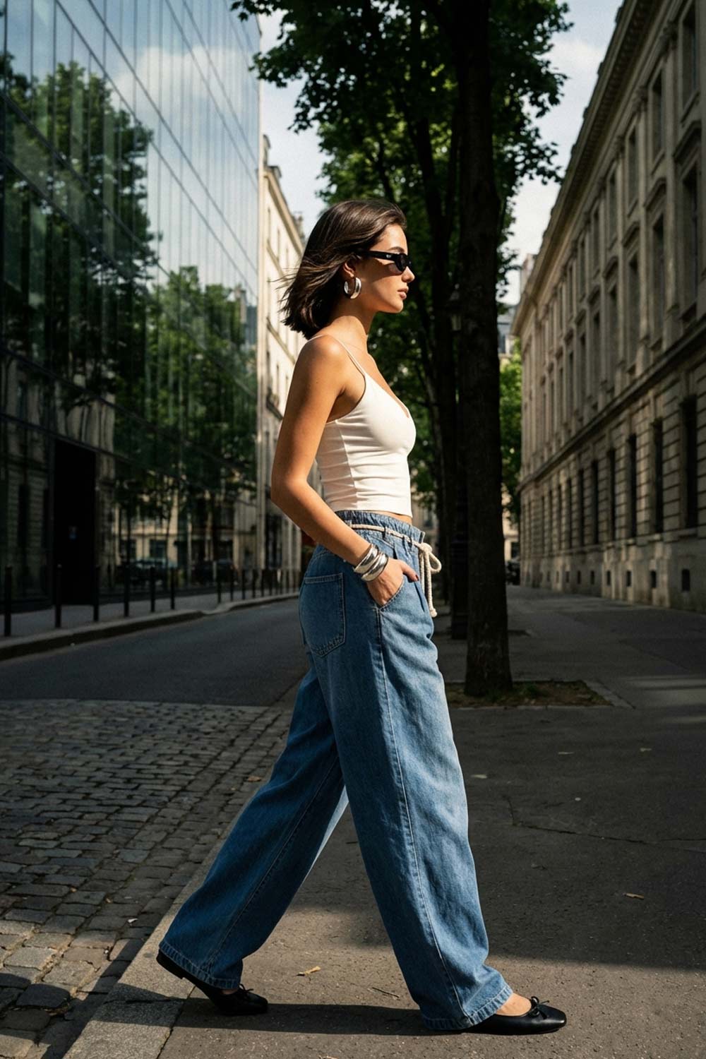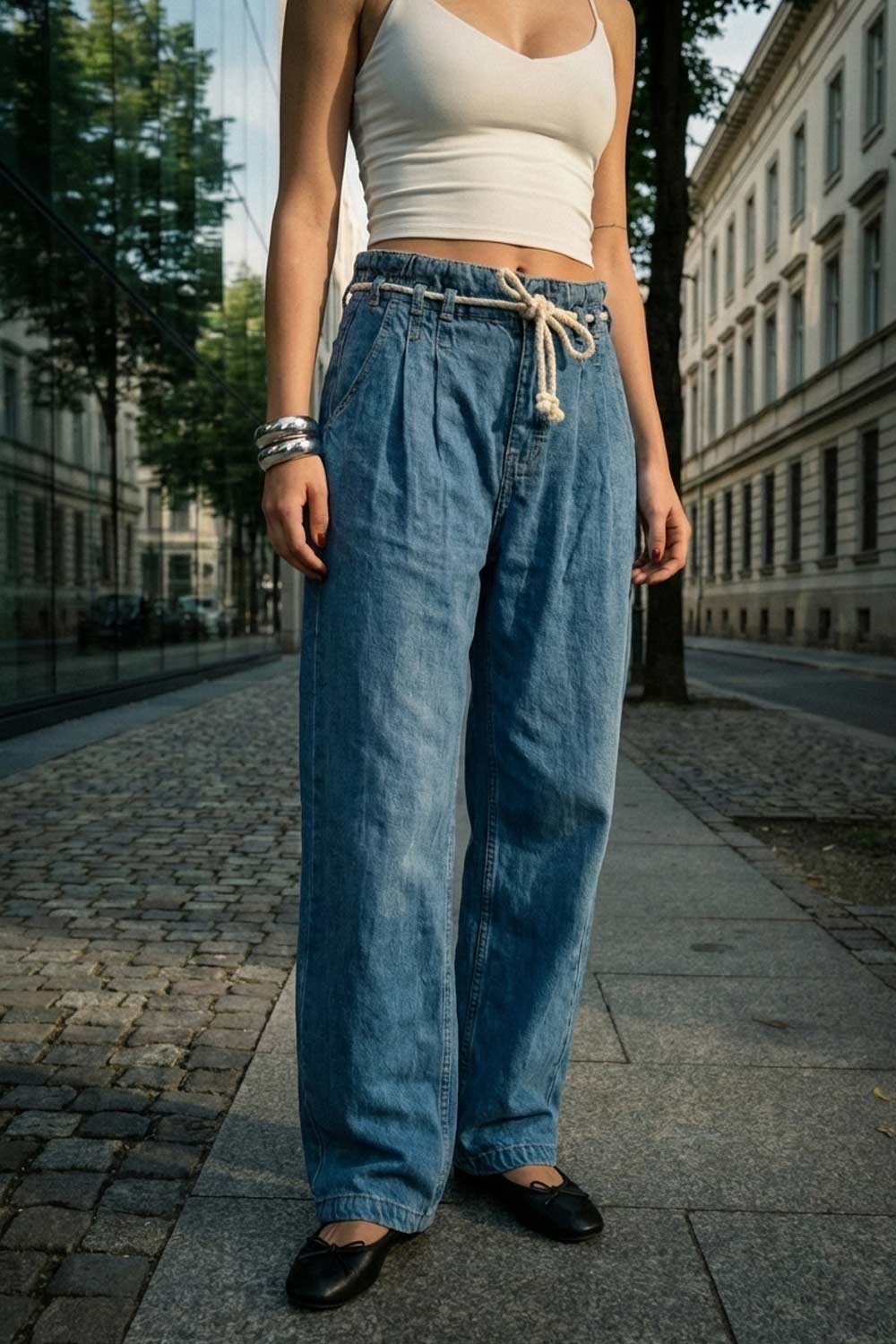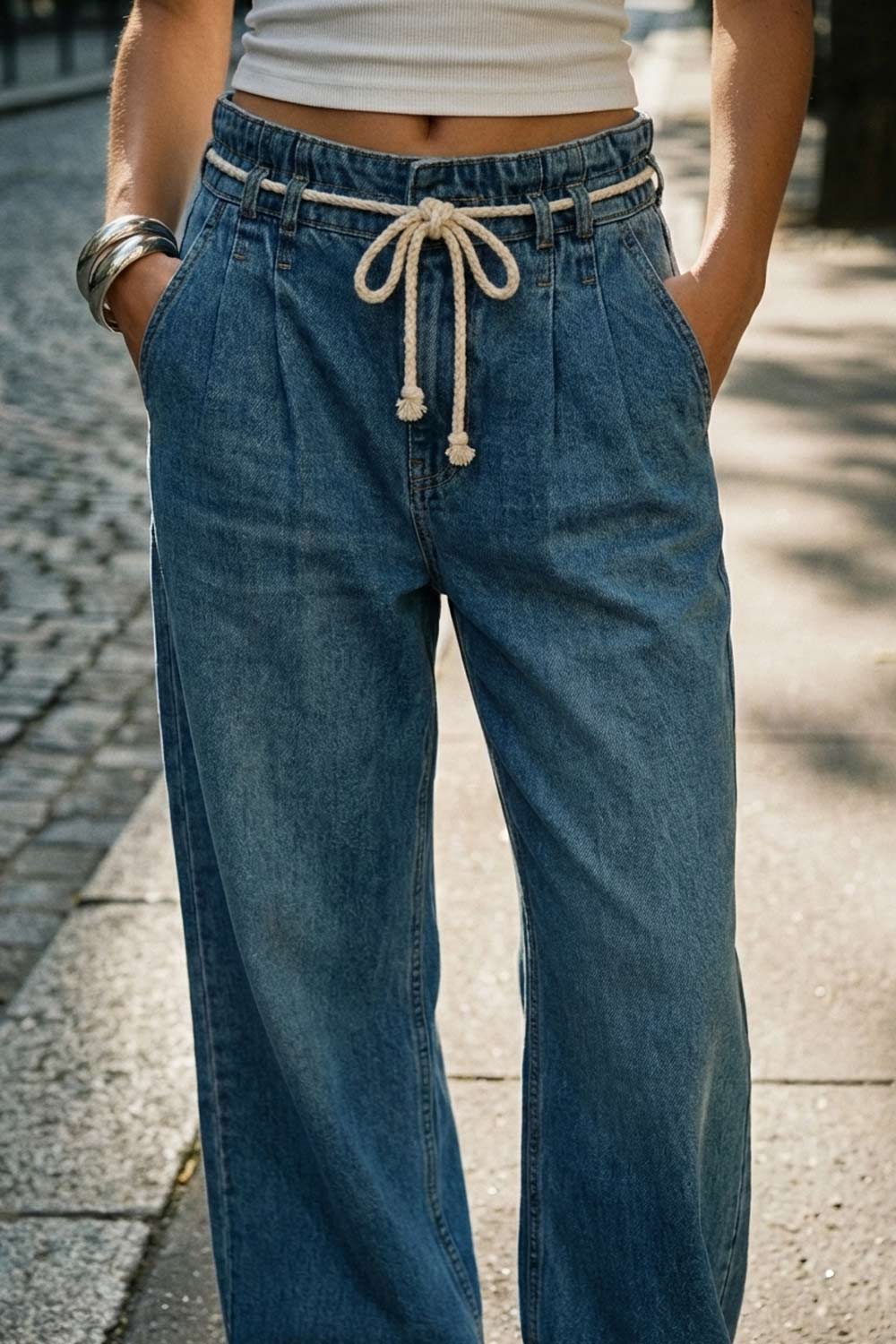 Pantalón de denim, fit wide leg, cintura alta con pretina elástica y trabillas, pinzas frontales, jareta frontal en contraste, bolsillos delanteros y traseros de parche. Cierre frontal con cremallera oculta.