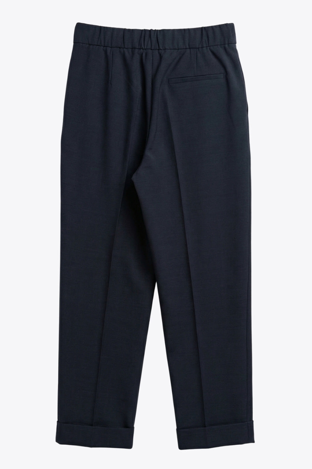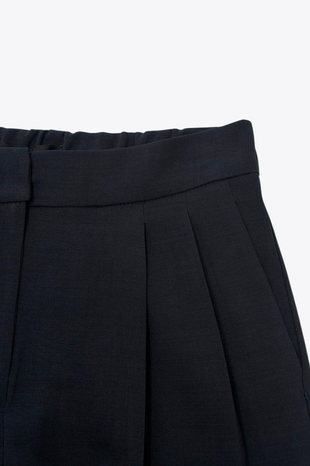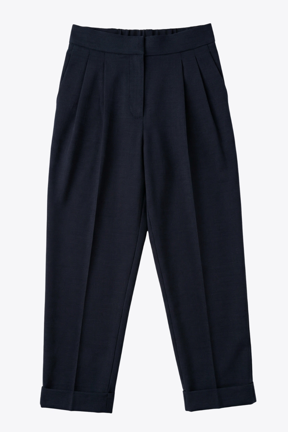 Pantalón de fit recto, cintura alta con pretina elástica posterior, pinzas frontales, bolsillos delanteros, vivo decorativo posterior y doblez en bajo. Cierre frontal con broche y cremallera ocultos.